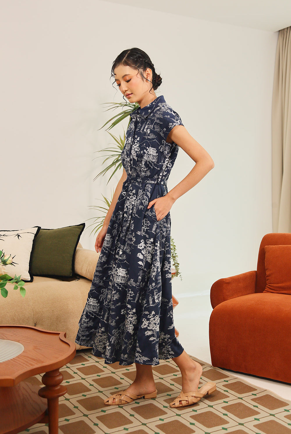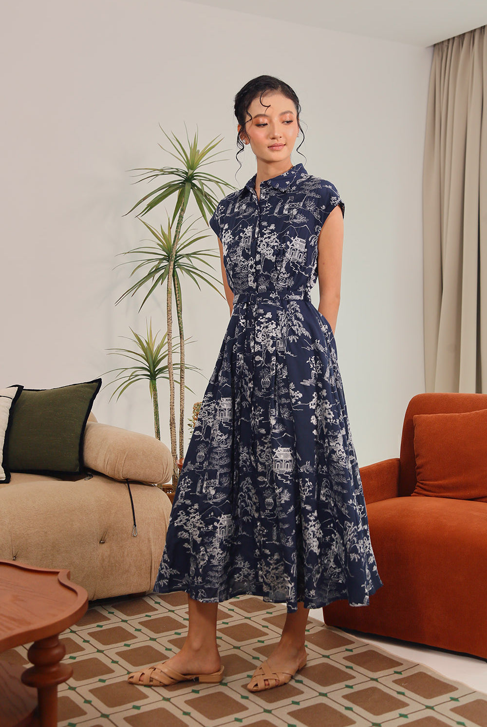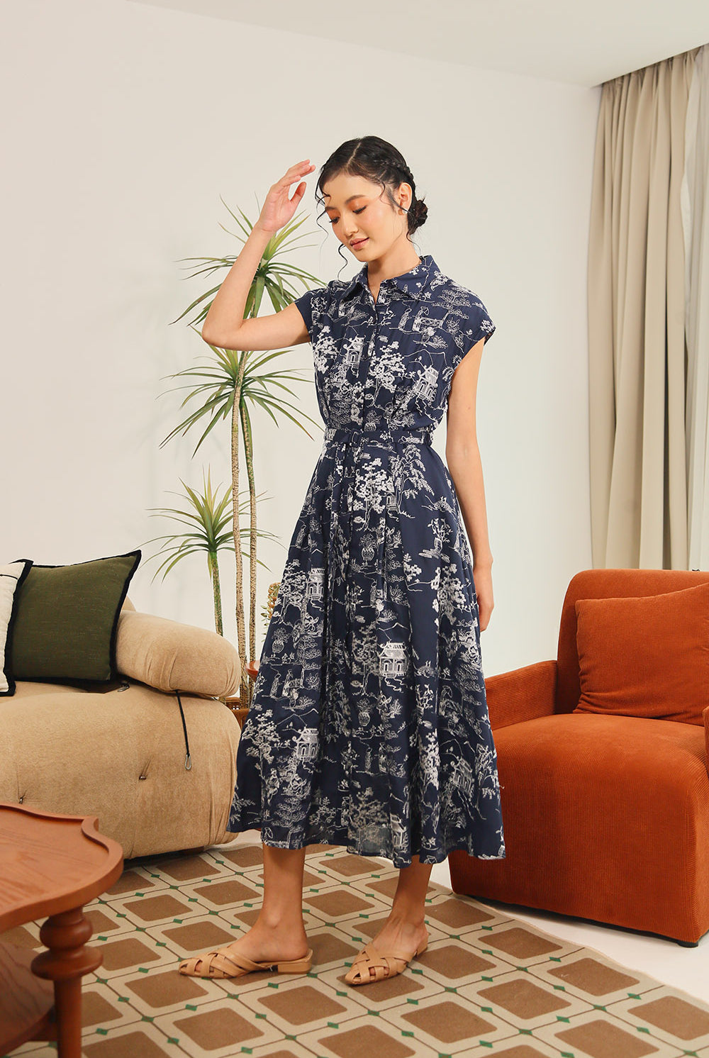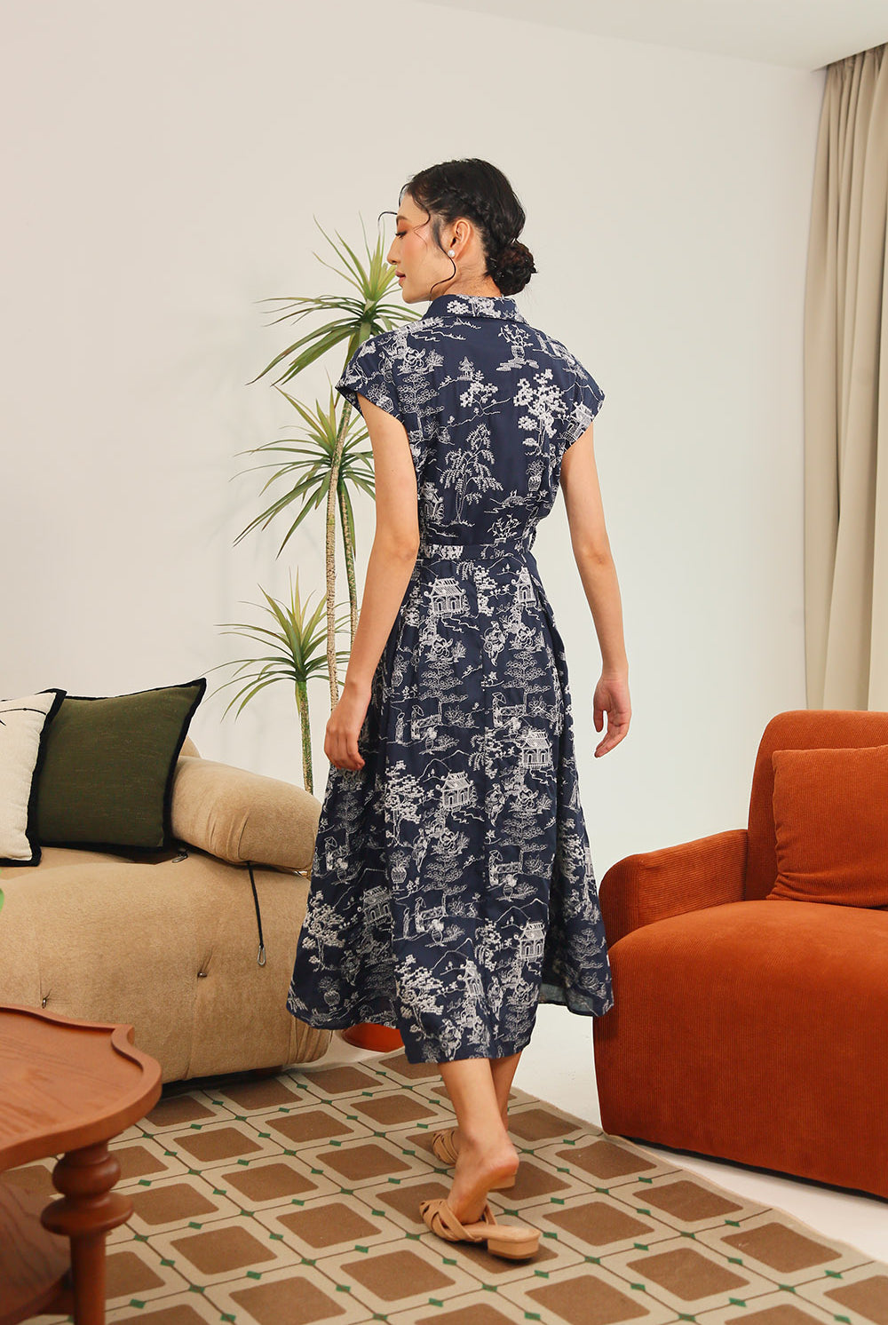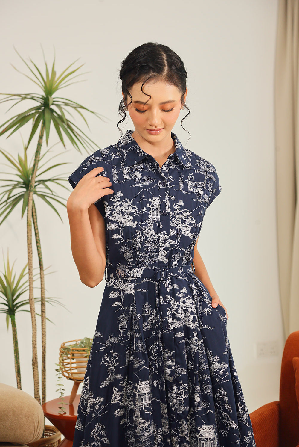 Dezza Midi Dress in Navy Blue Scenic Embroidery