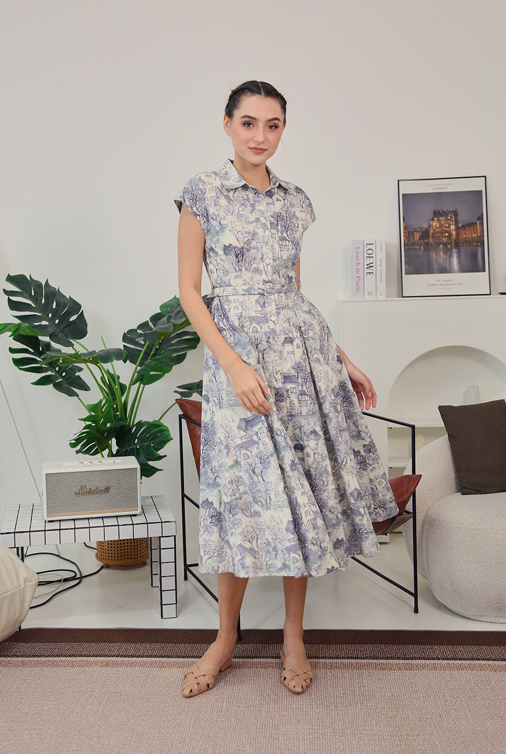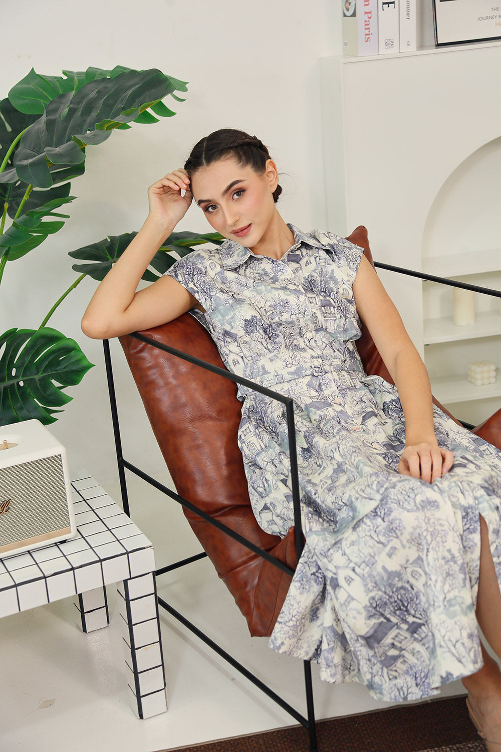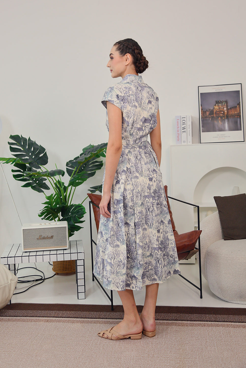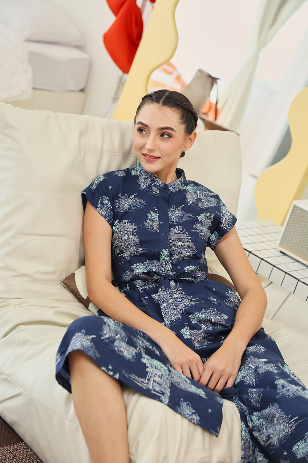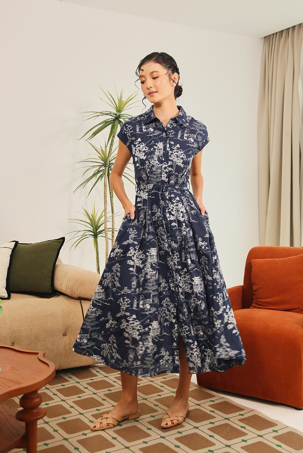 Dezza Midi Dress in Navy Blue Scenic Embroidery