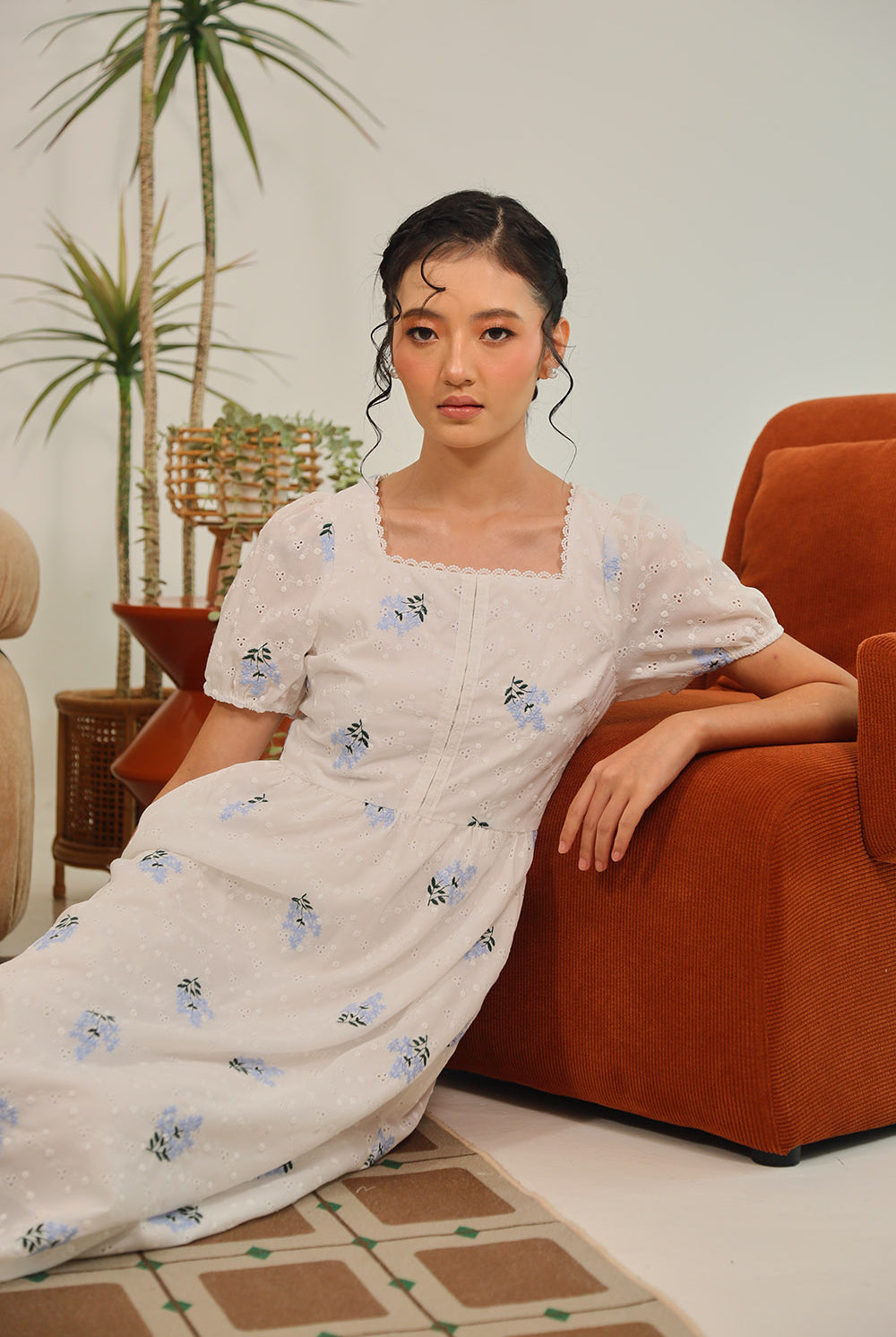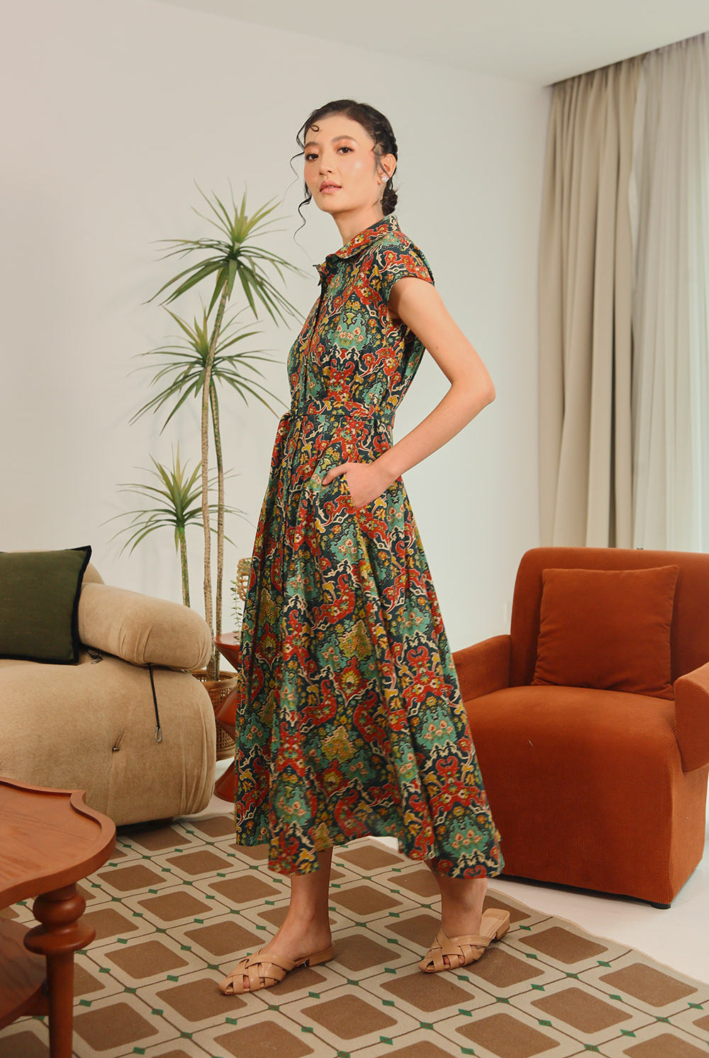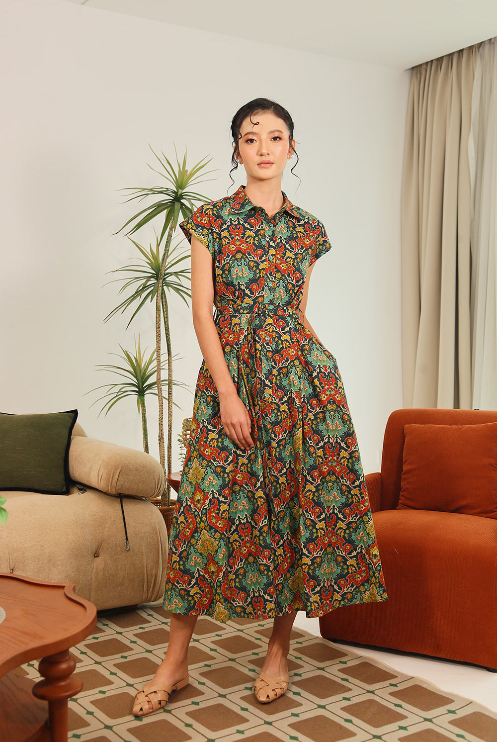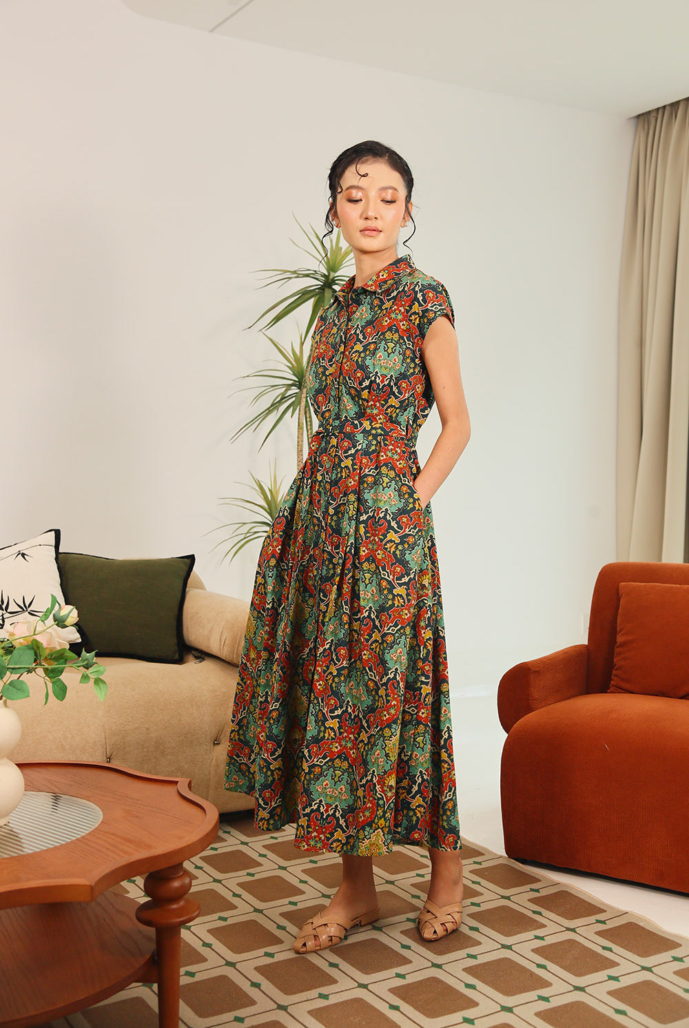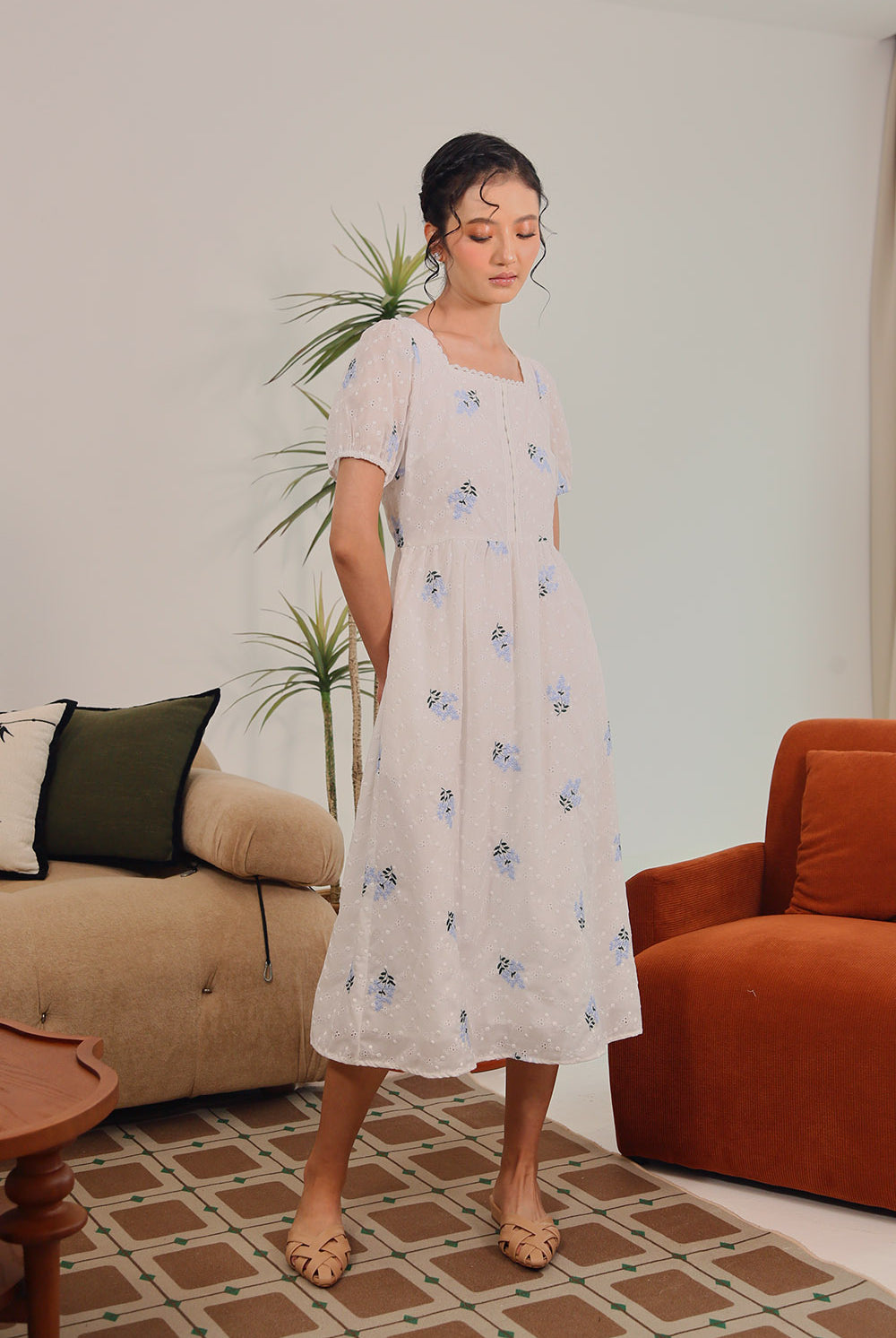 Dezza Midi Dress in Navy Blue Scenic Embroidery