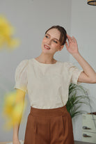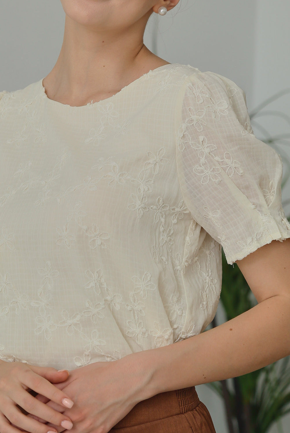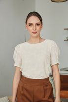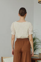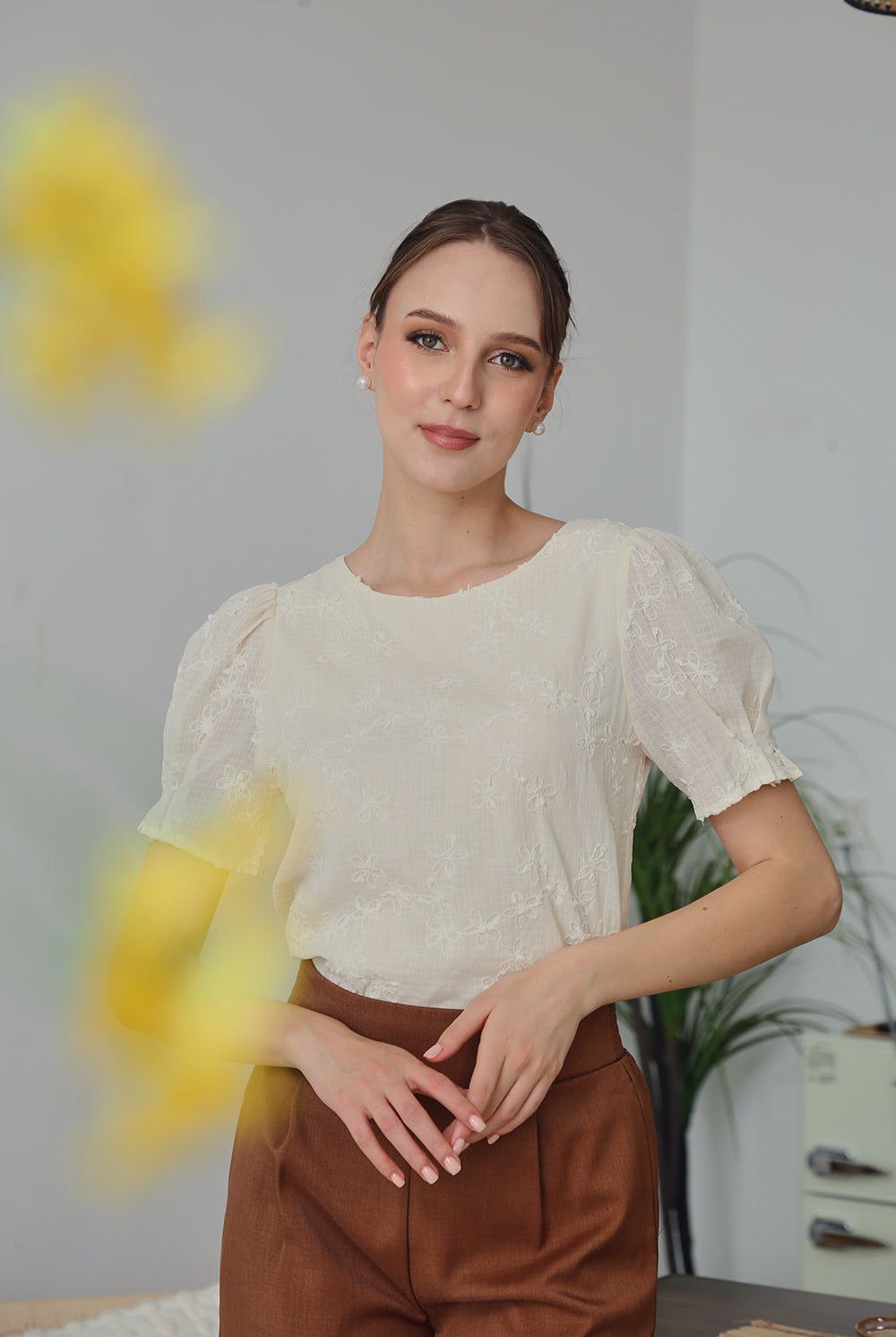 Delicate and timeless, the Alessia Top features intricate floral embroidery on a soft apricot-toned fabric. Fully lined for comfortable wear, it’s designed with gently puffed sleeves and a classic round neckline. The lightweight texture and subtle elegance make it a versatile choice for both casual and dressy occasions.