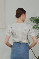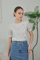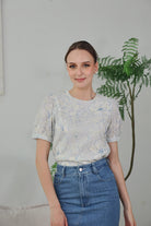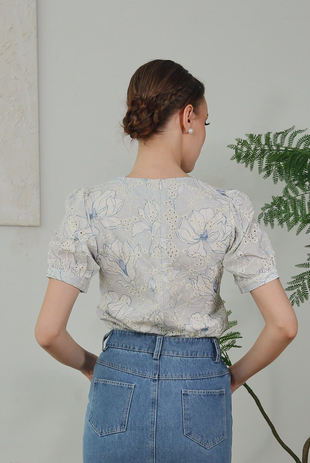 Timeless elegance meets breathable comfort in the Averine Top. Made from soft cotton crochet fabric, this piece is delicately embroidered with floral motifs in subtle pastel tones over a soft grey base. Fully lined for ease of wear, it features gently puffed sleeves and intricate eyelet detailing that adds a romantic, artisanal feel to your look.