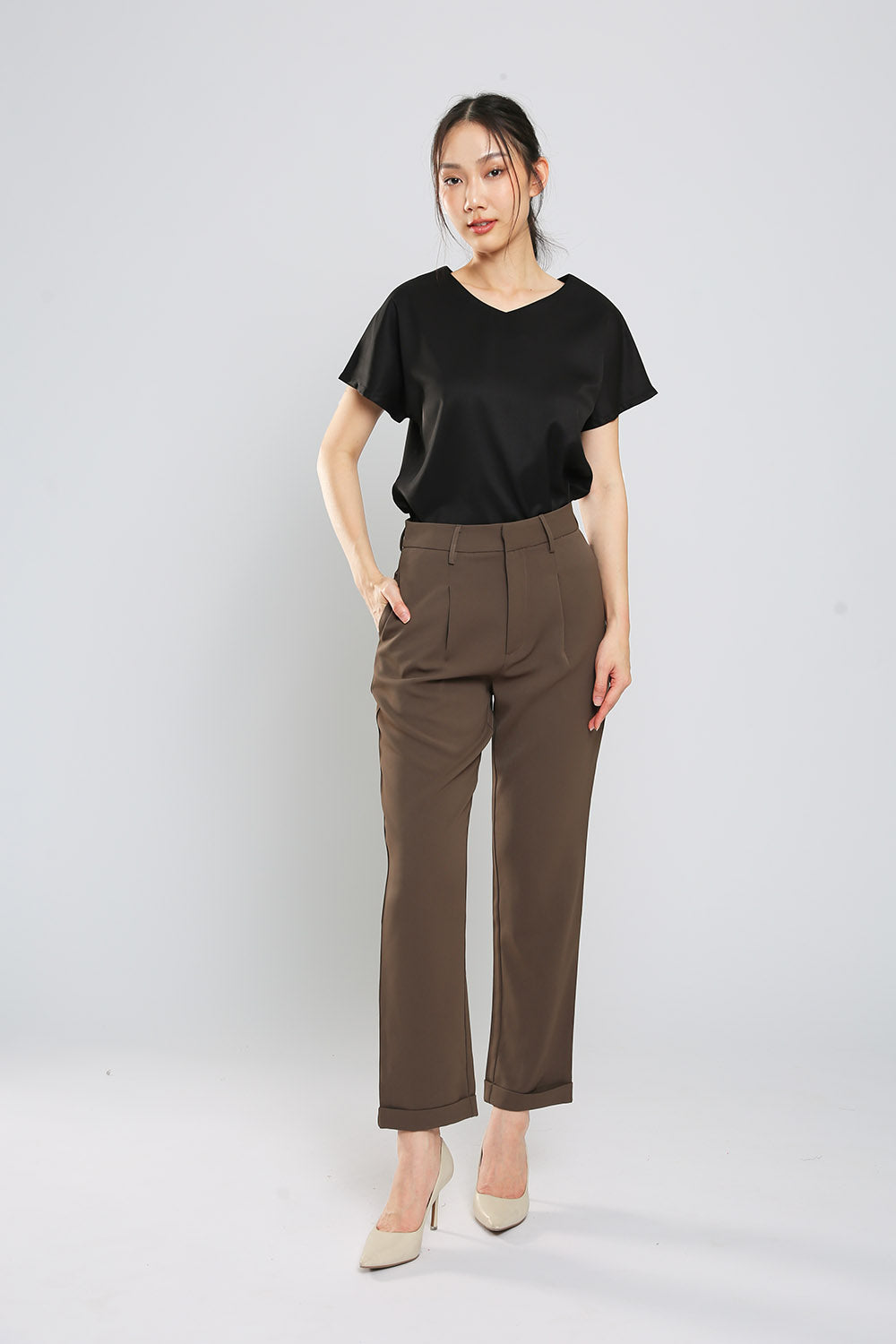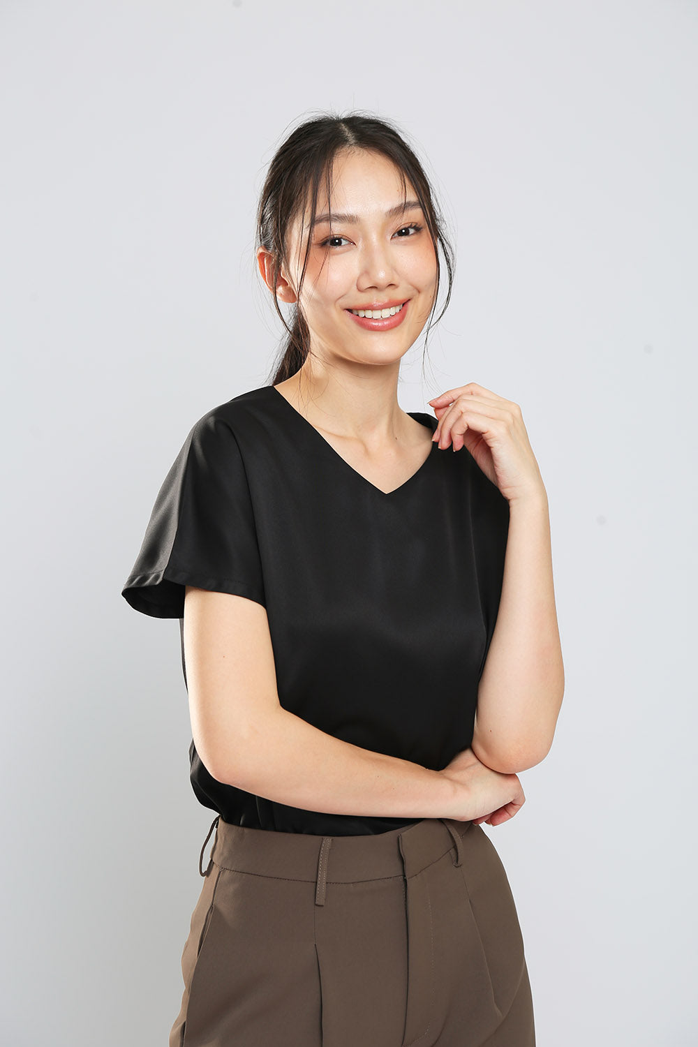 Effortlessly upgrade your wardrobe with our slip on v-neck top. Made from high-quality, easy iron polyester fabric, this piece offers both style and convenience. Perfect for any occasion, with no fussing over buttons or zippers.