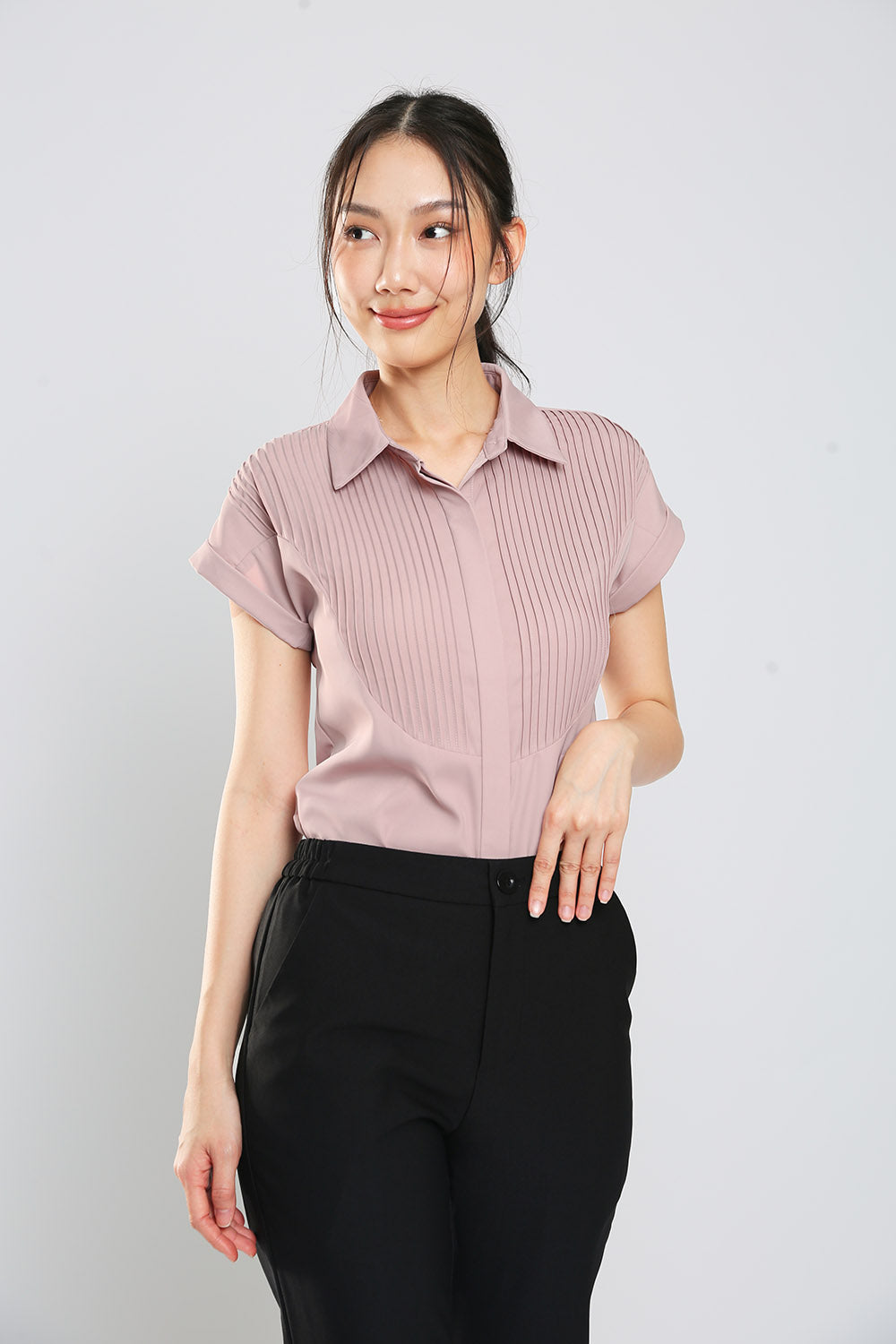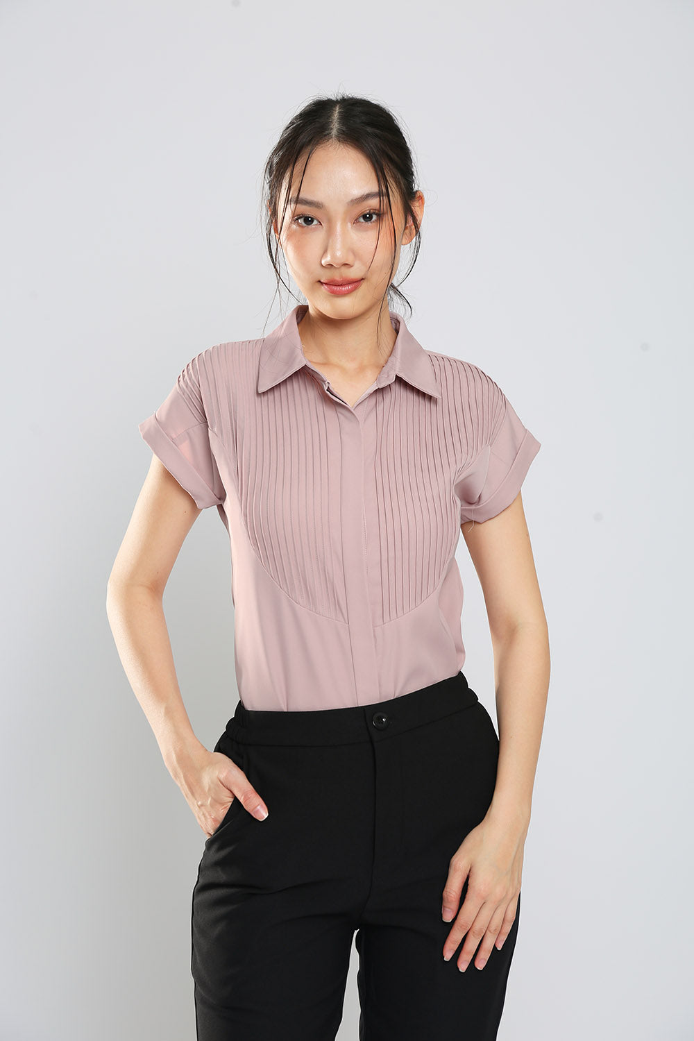 This Yumi button down shirt features a front button closure and front pleat details, making it both stylish and easy to wear. Made with easy iron polyester fabric, it offers convenience and a polished look for any occasion.