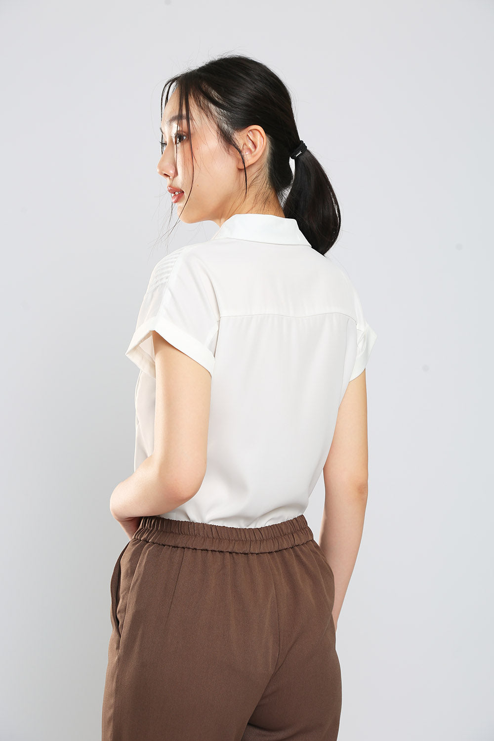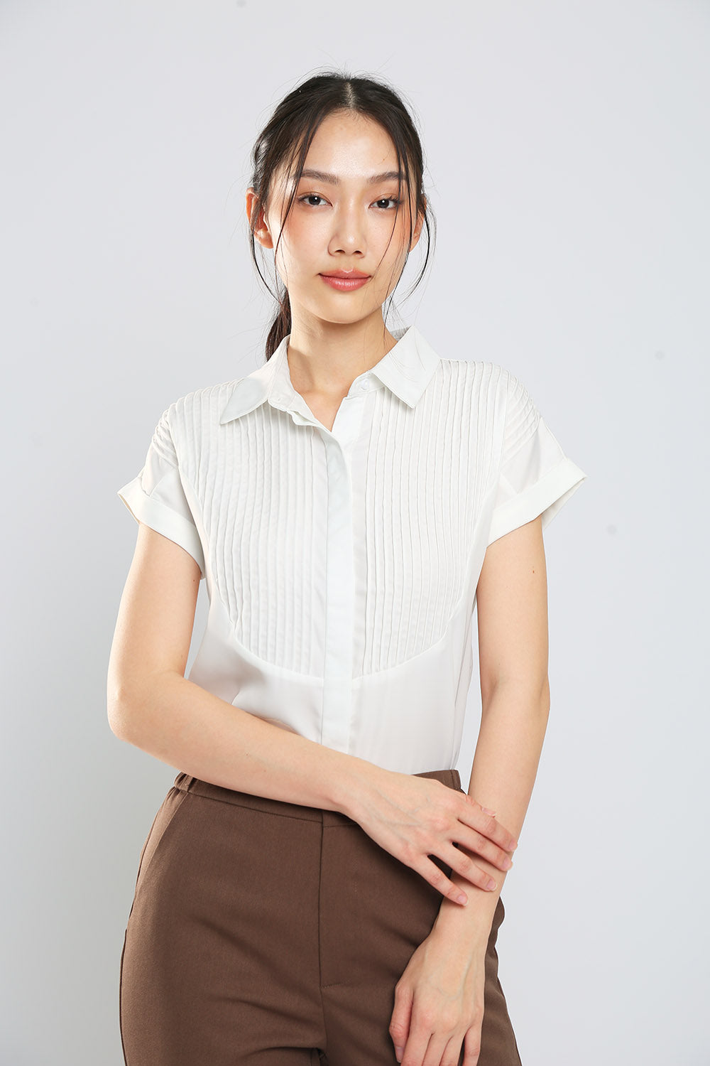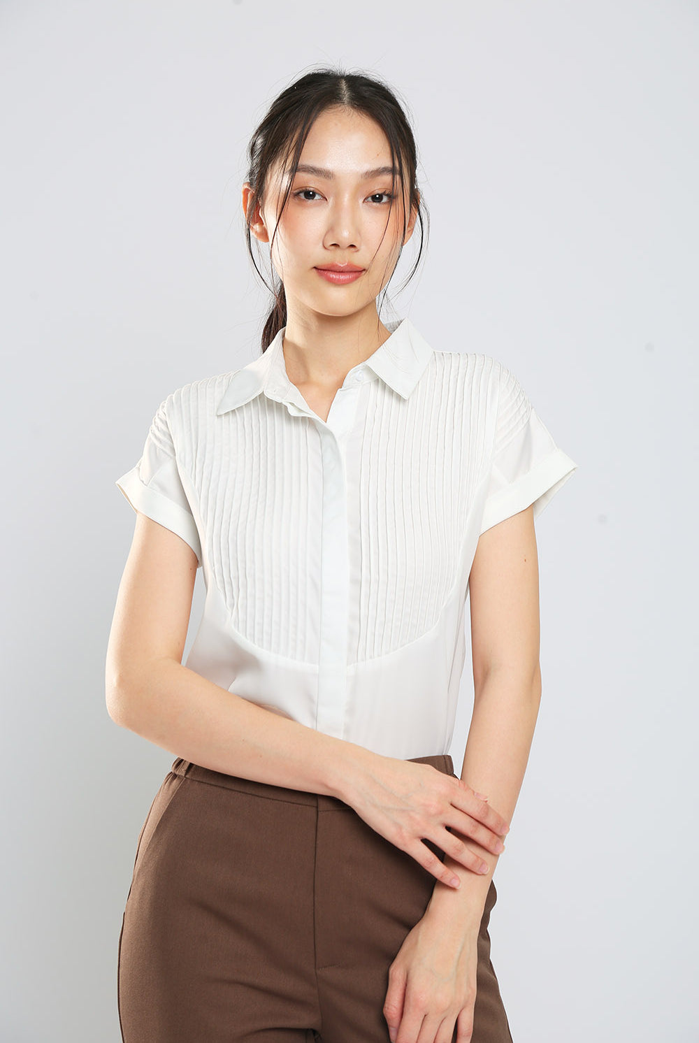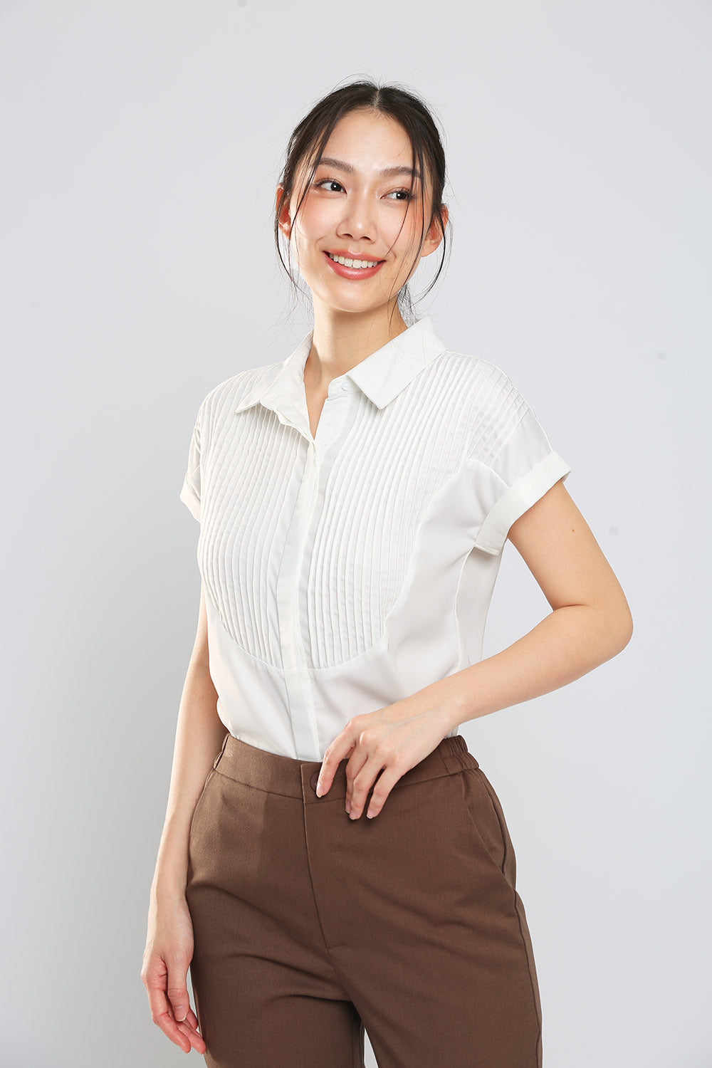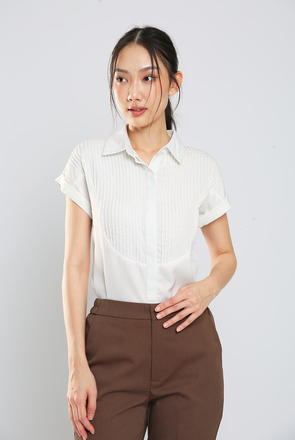 This Yumi button down shirt in white features a front button closure and front pleat details, making it both stylish and easy to wear. Made with easy iron polyester fabric, it offers convenience and a polished look for any occasion.