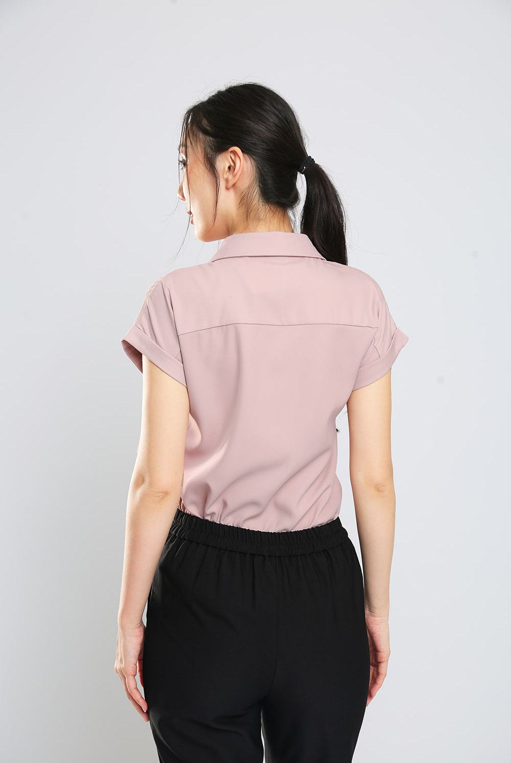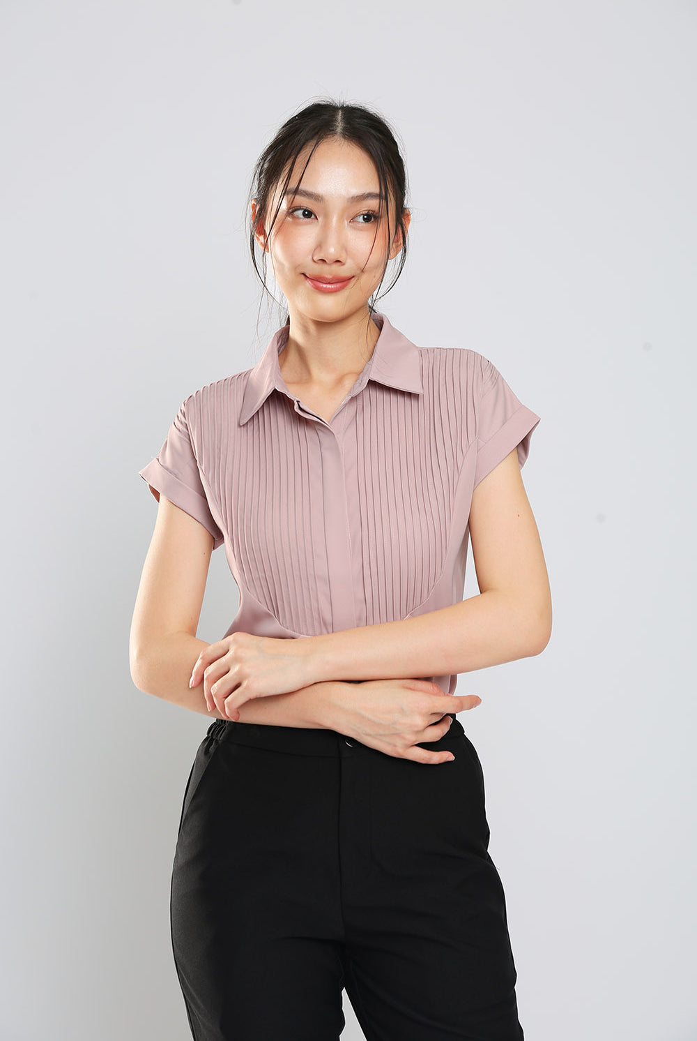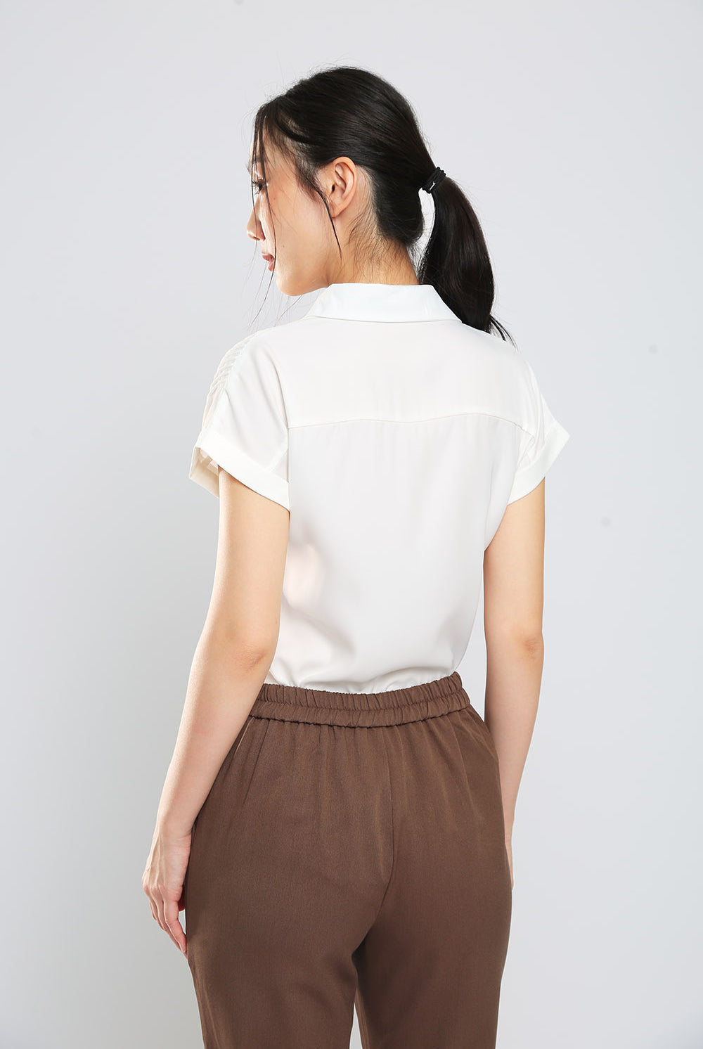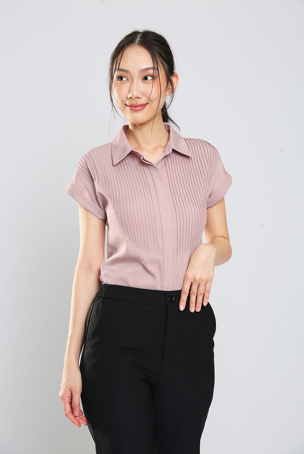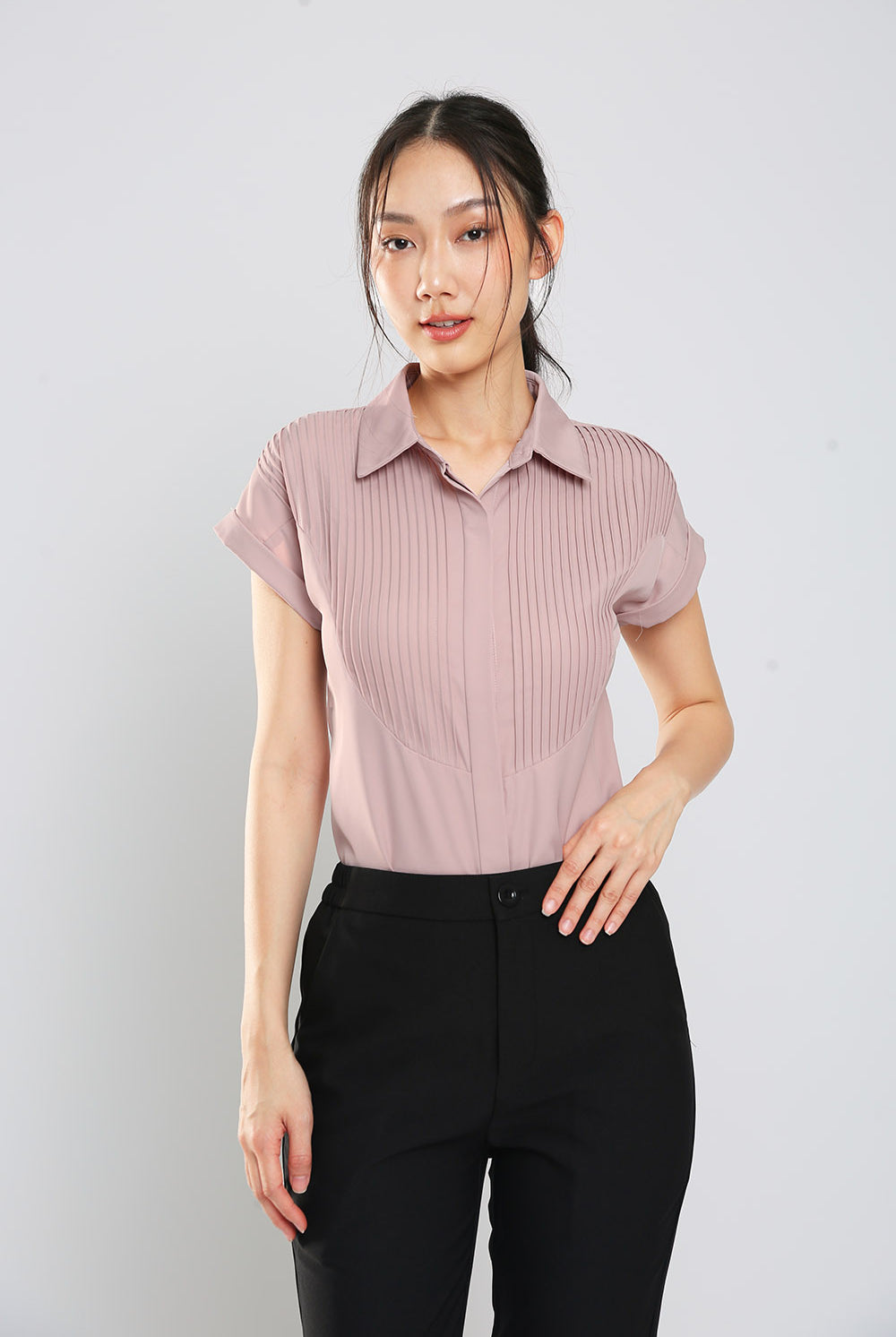 This Yumi button down shirt in white features a front button closure and front pleat details, making it both stylish and easy to wear. Made with easy iron polyester fabric, it offers convenience and a polished look for any occasion.