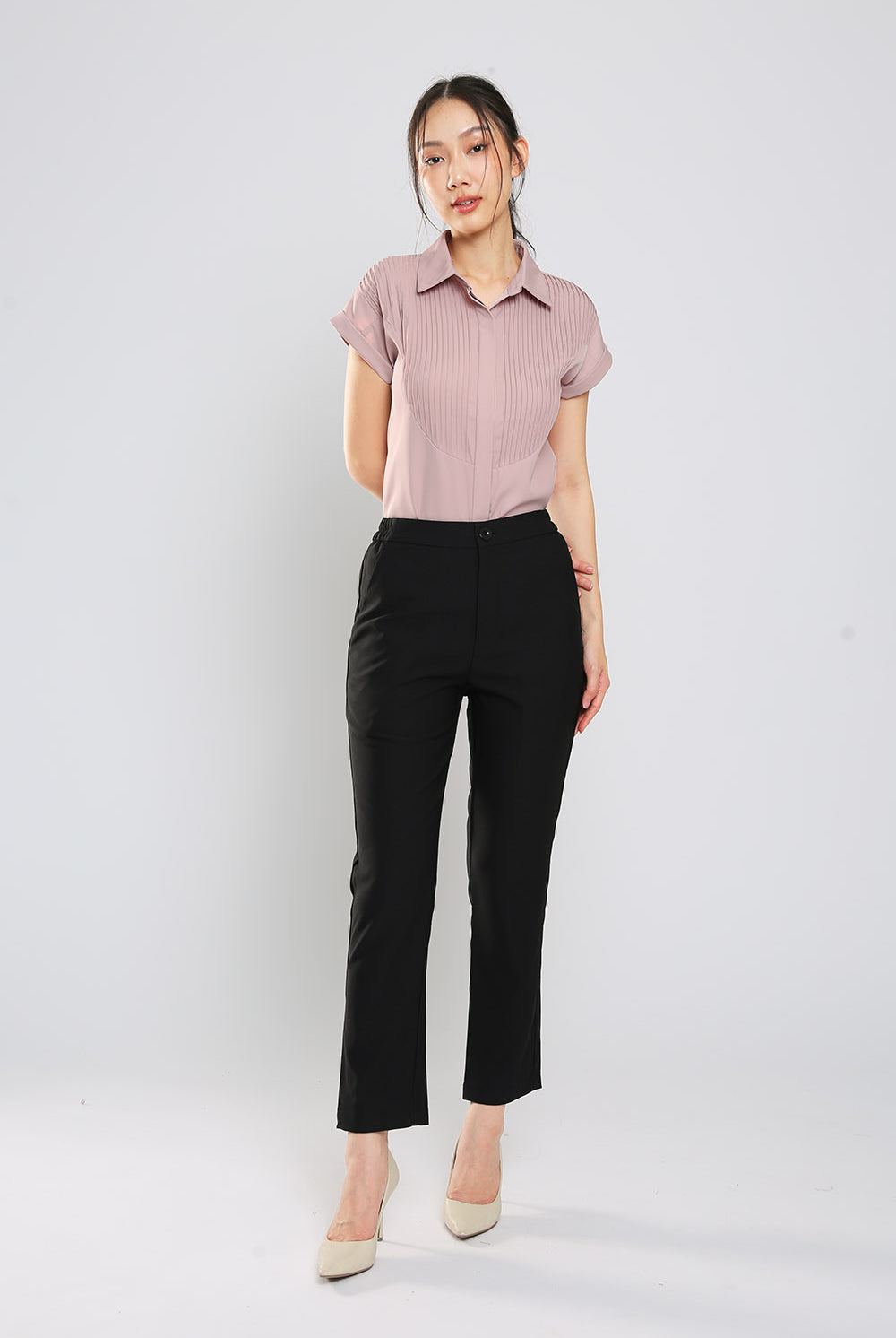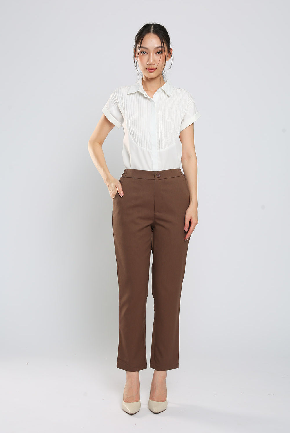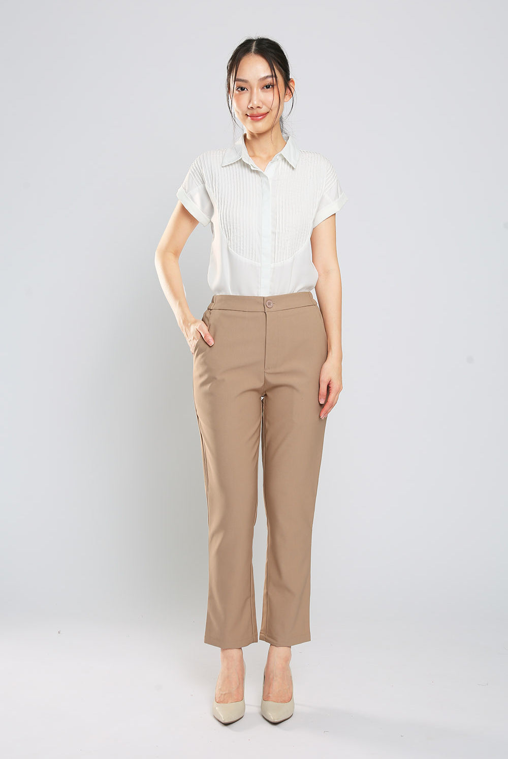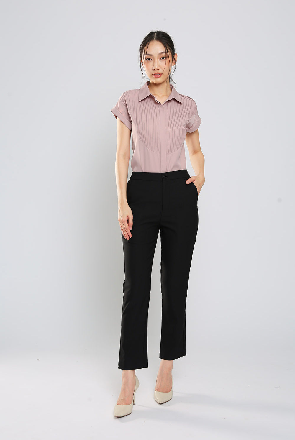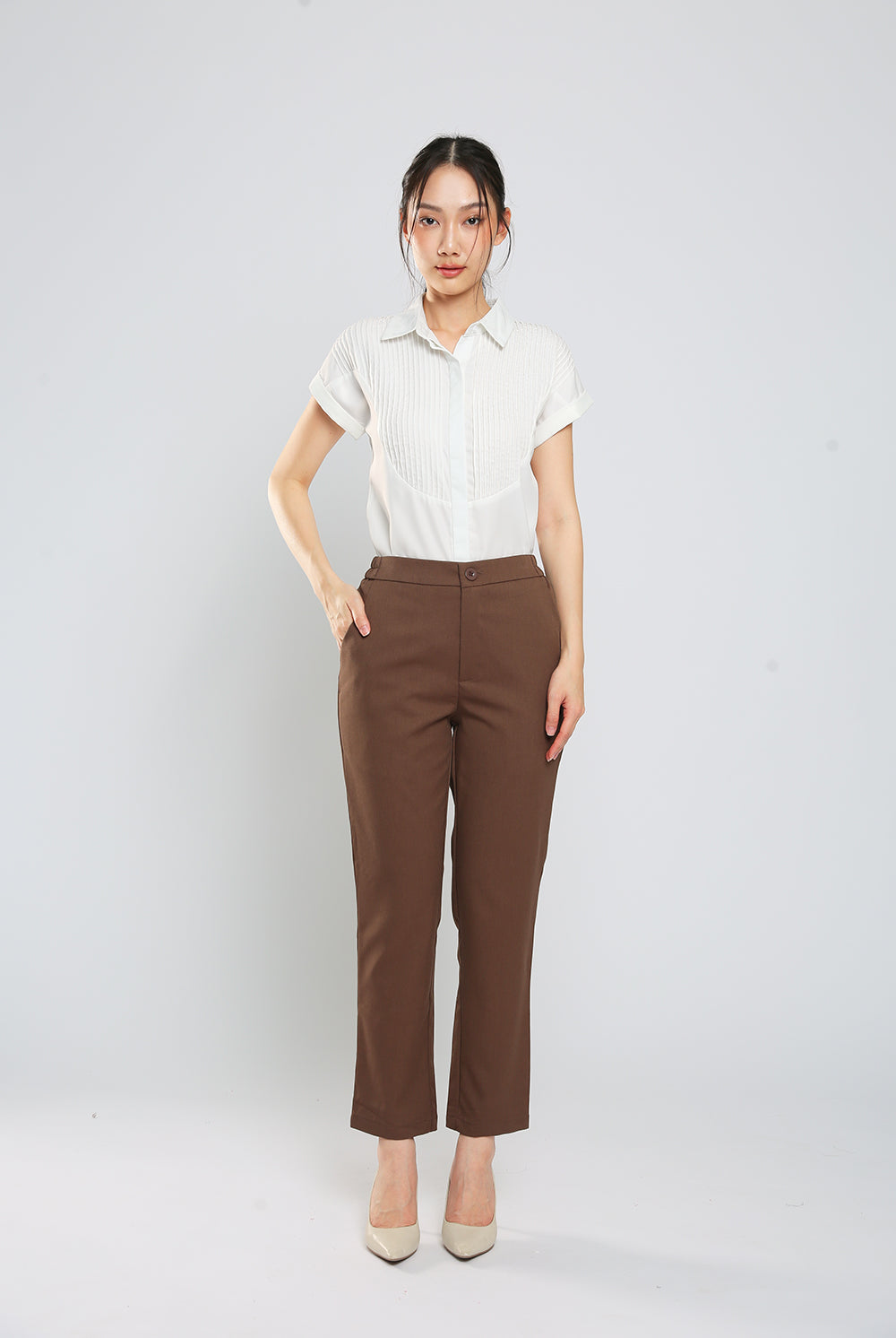 This Yumi button down shirt in white features a front button closure and front pleat details, making it both stylish and easy to wear. Made with easy iron polyester fabric, it offers convenience and a polished look for any occasion.
