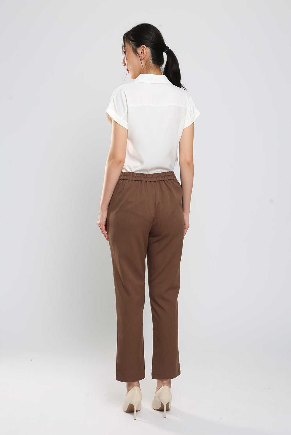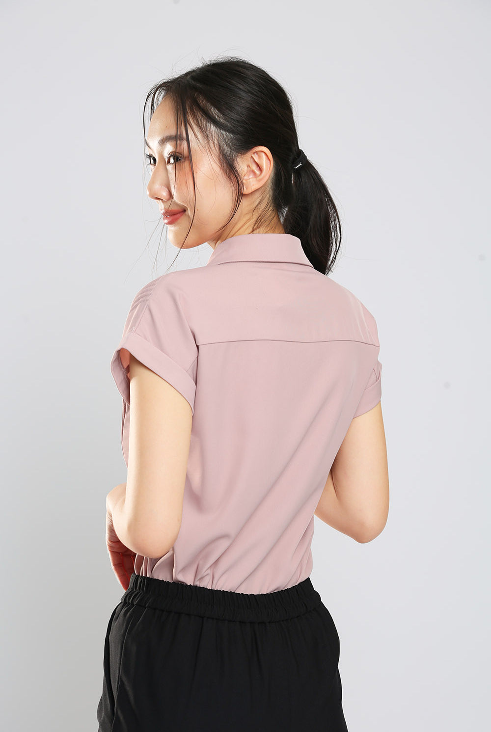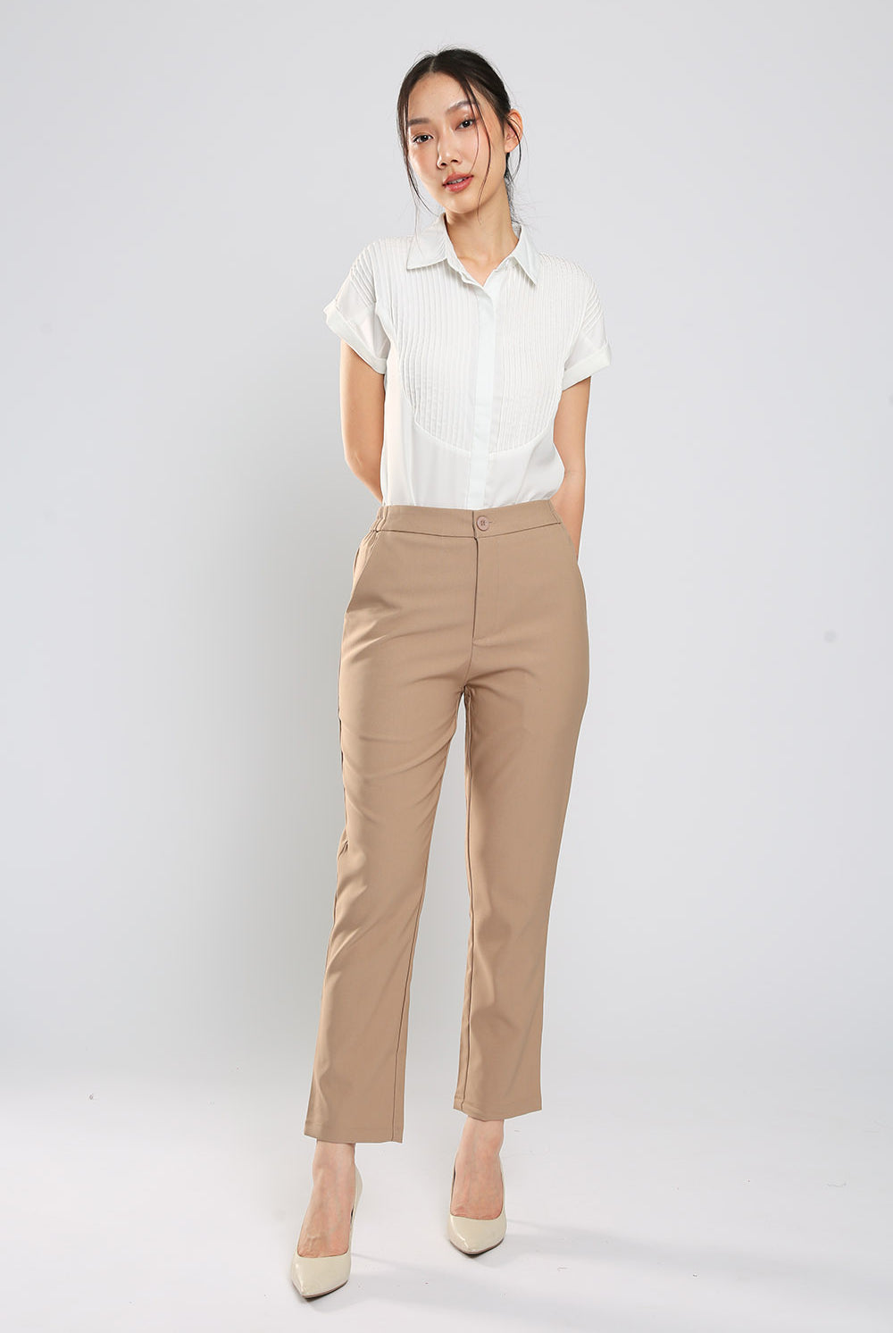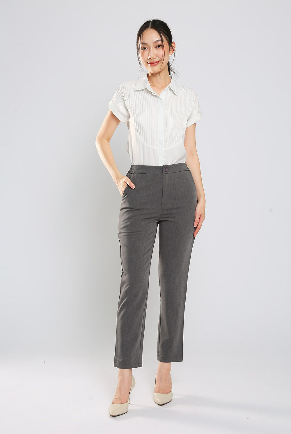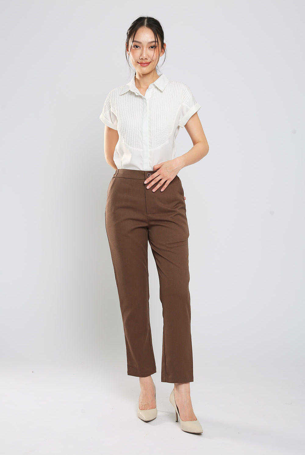 This Yumi button down shirt in white features a front button closure and front pleat details, making it both stylish and easy to wear. Made with easy iron polyester fabric, it offers convenience and a polished look for any occasion.