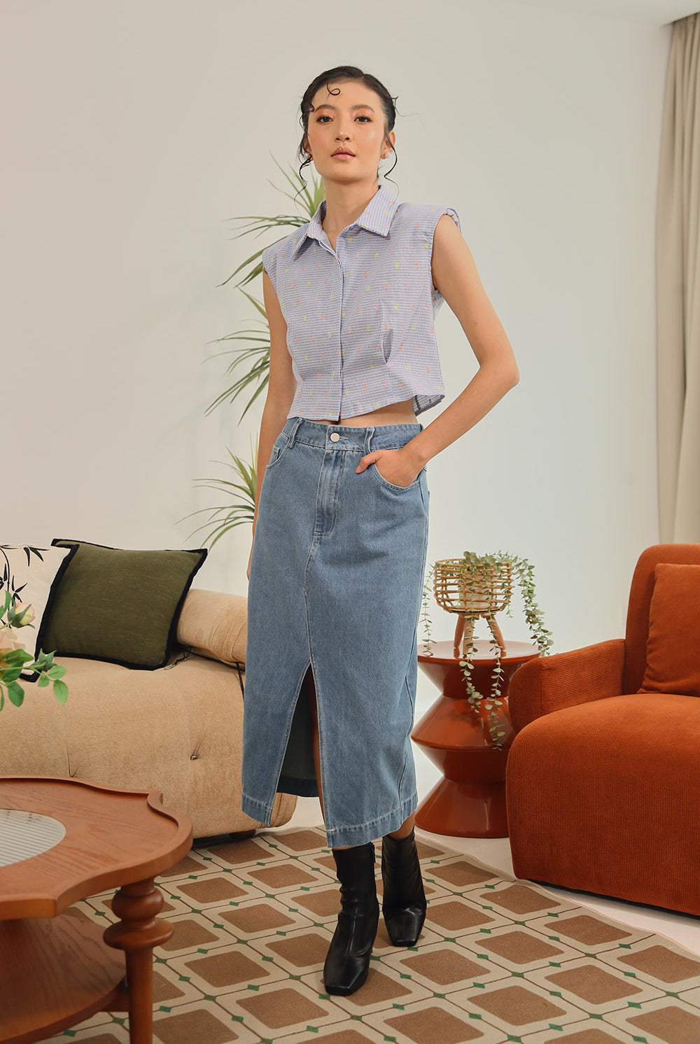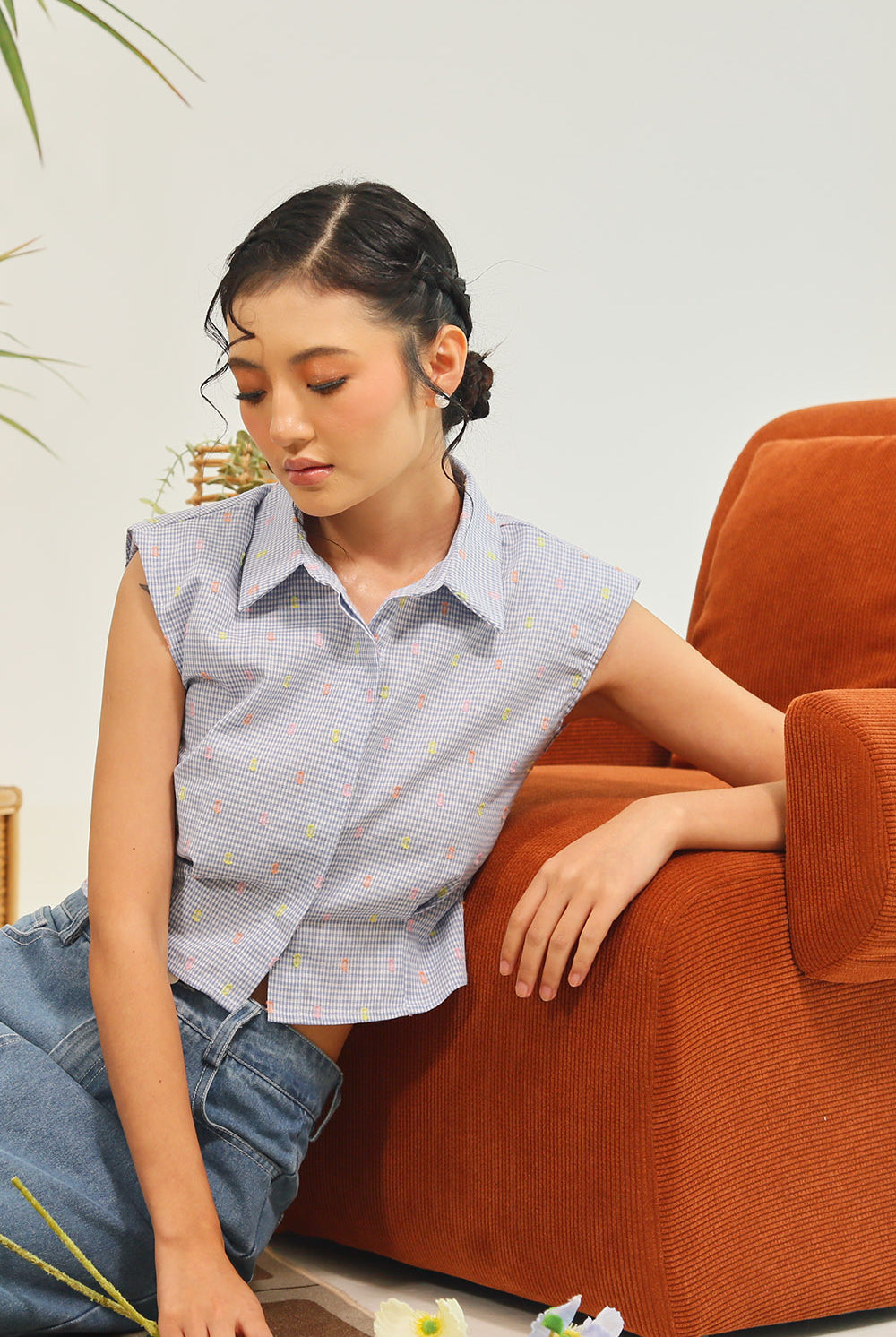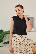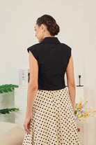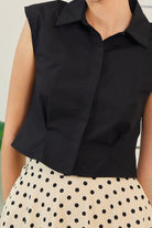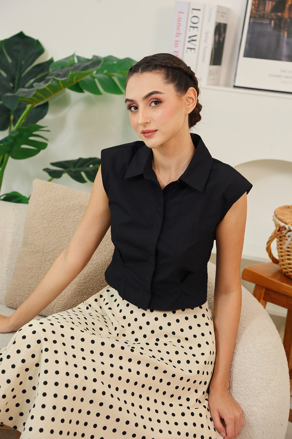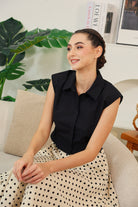 Effortlessly sleek and versatile, the Amira Sleeveless Shirt is a modern take on classic tailoring. Crafted from a comfortable cotton-blend fabric, it features a sharp collared neckline, a clean concealed button placket, and structured cap sleeves that add a polished touch. The cropped silhouette makes it perfect for pairing with high-waisted skirts or trousers, bringing balance to both casual and office-ready looks.
