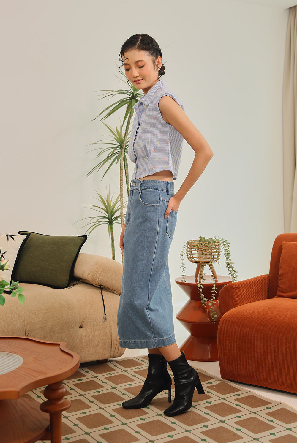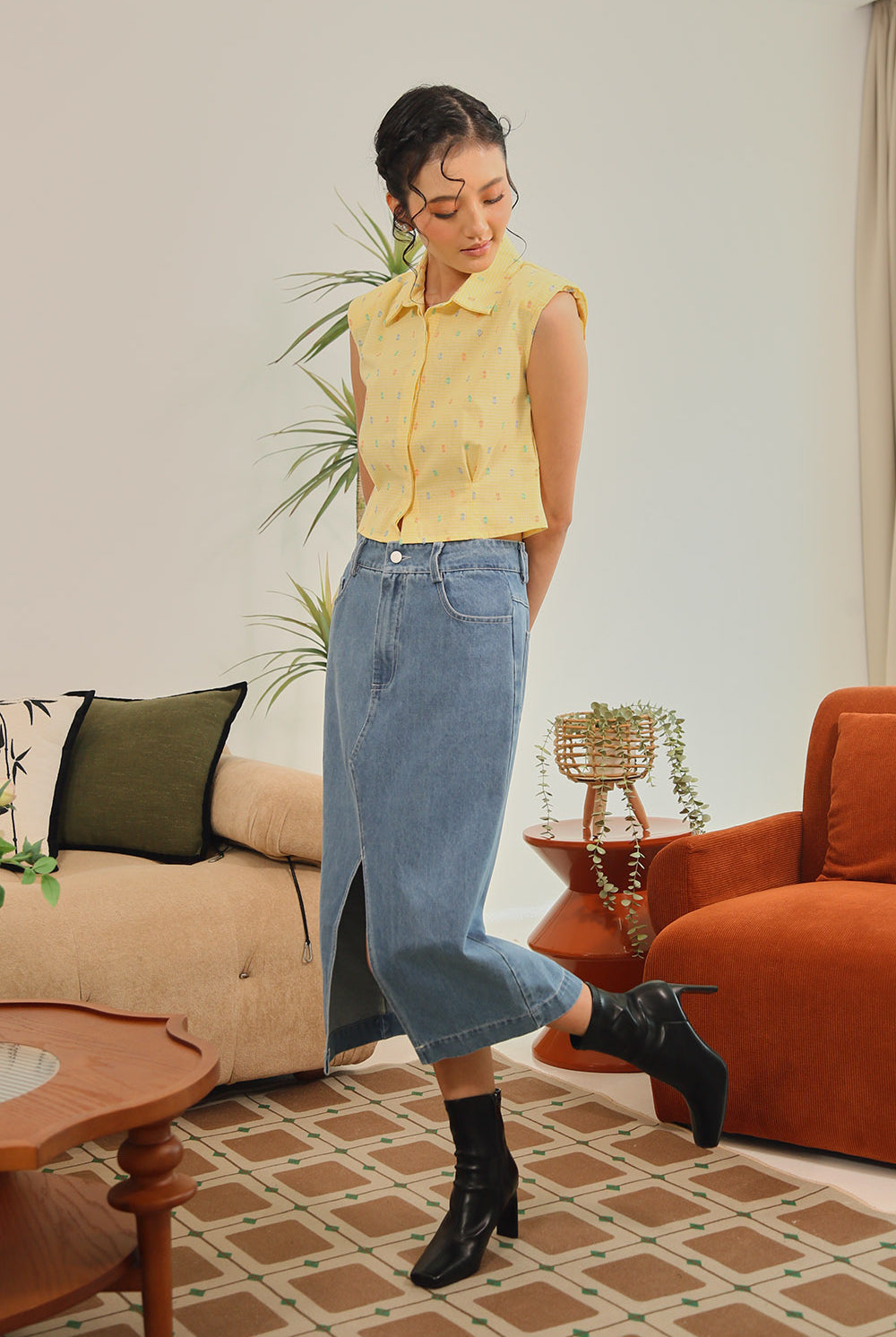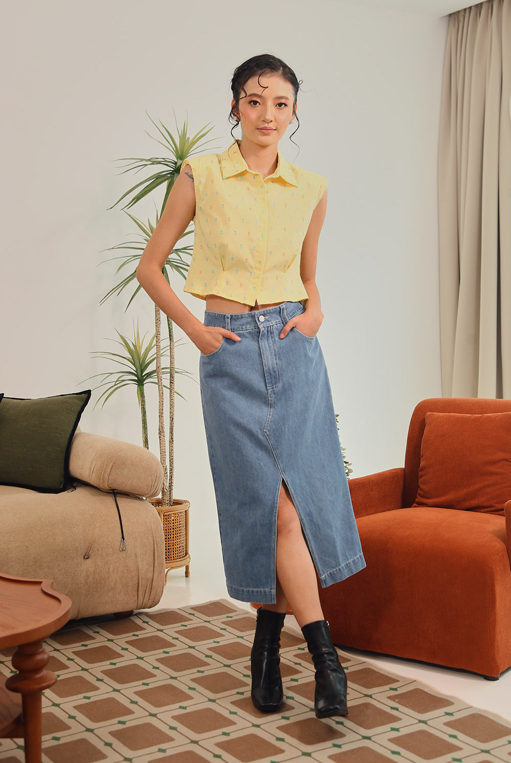 Effortlessly sleek and versatile, the Amira Sleeveless Shirt is a modern take on classic tailoring. Crafted from a comfortable cotton-blend fabric, it features a sharp collared neckline, a clean concealed button placket, and structured cap sleeves that add a polished touch. The cropped silhouette makes it perfect for pairing with high-waisted skirts or trousers, bringing balance to both casual and office-ready looks.