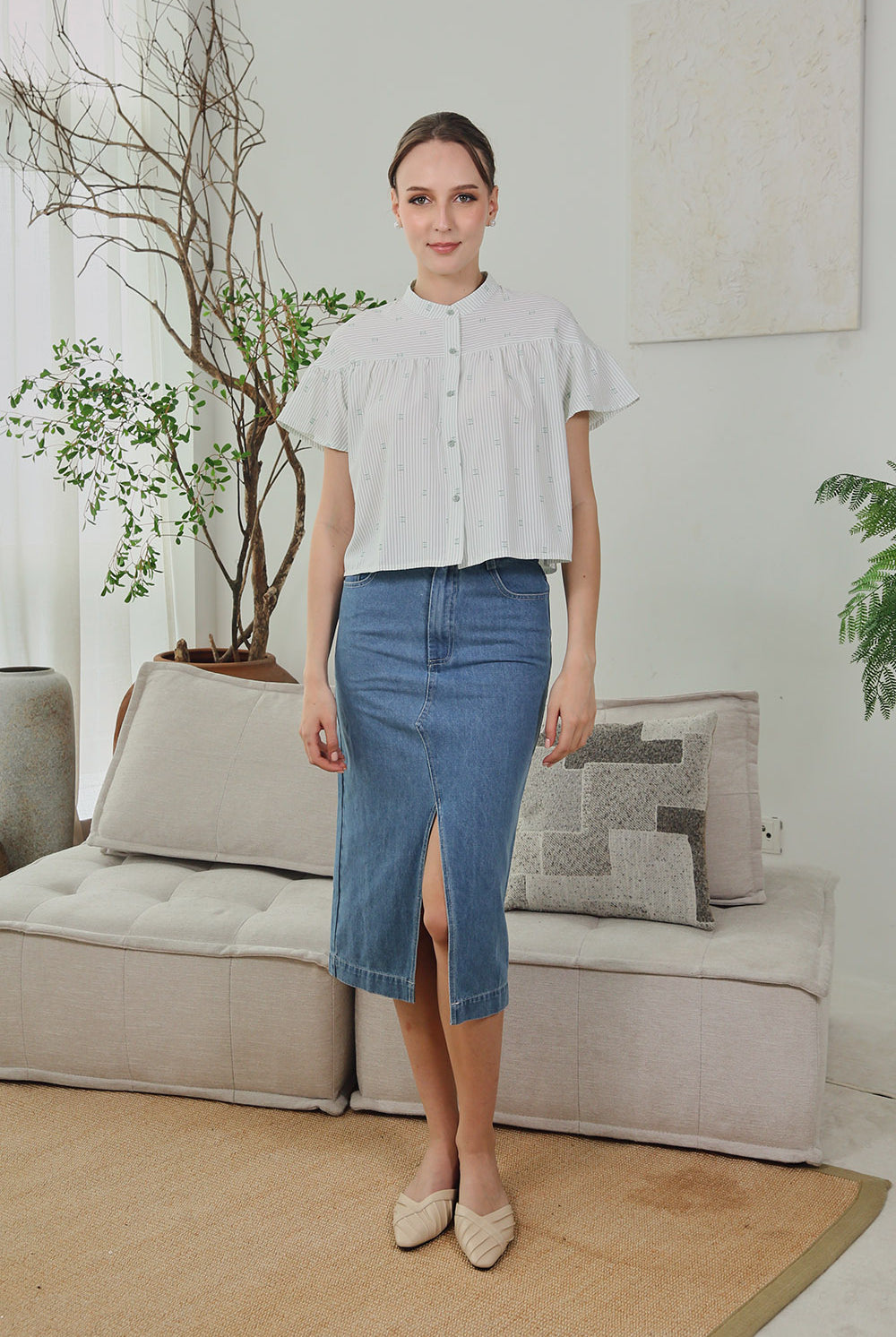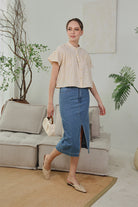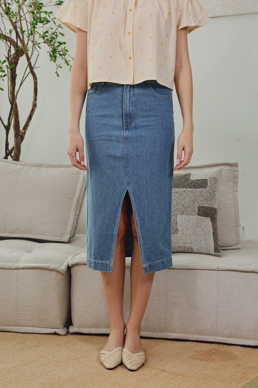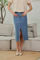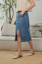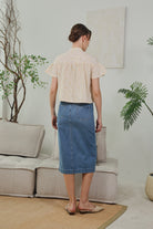 Timeless with a modern twist — the Aubrie Skirt redefines denim classics with its clean silhouette and front slit detail. Crafted from mid-weight denim with just the right structure, this midi skirt features a flattering high waist, functional pockets, and a centre-front slit for ease of movement and style.
