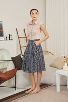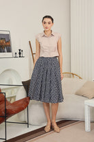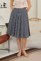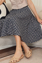 Bring timeless elegance to your wardrobe with the Dariela Midi Skirt in Navy Geometric. This skirt features a flattering A-line silhouette adorned with an eye-catching geometric print in classic navy and white tones. Designed for all-day comfort and ease, it comes fully lined to ensure a smooth and secure fit without sheerness. The flowy fabric drapes beautifully, while functional side pockets add a practical touch.