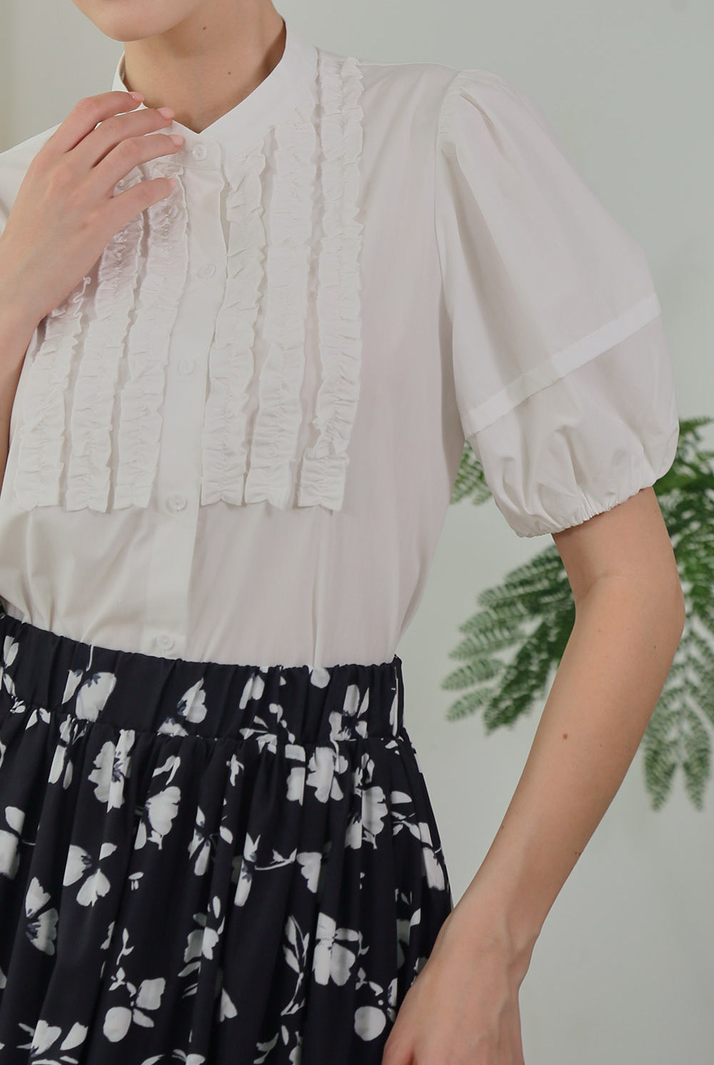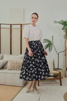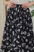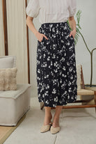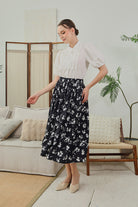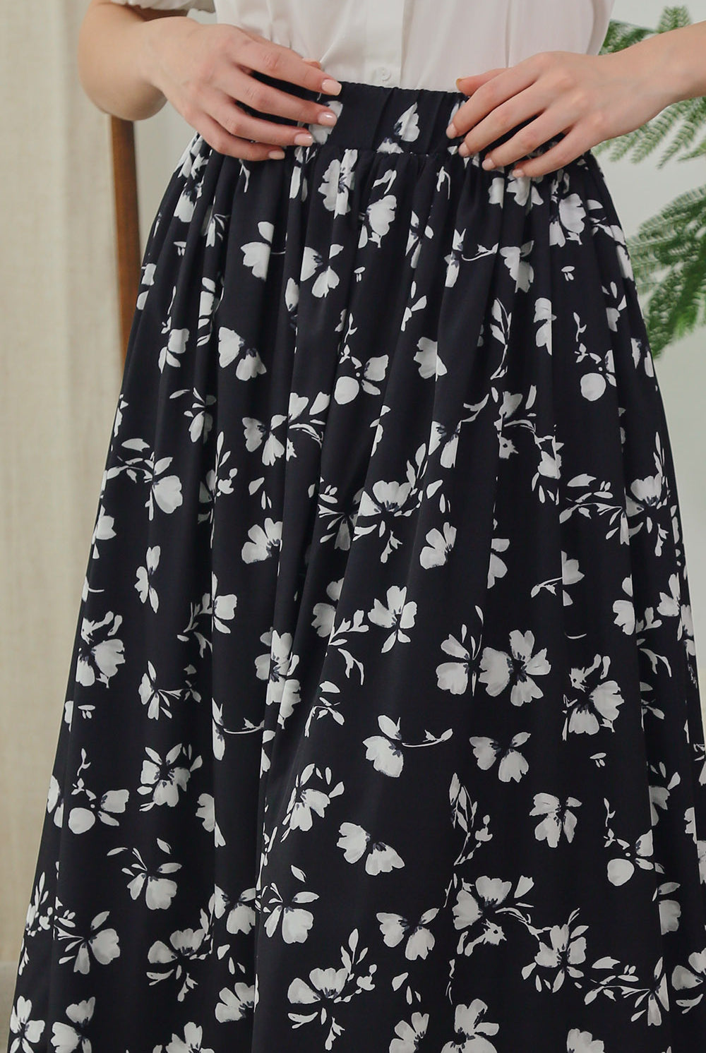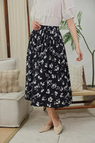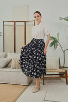 A timeless silhouette with a touch of charm. The Seraphina Skirt features a delicate white floral print set against a classic black base. Its softly gathered design and elasticised waistband offer all-day comfort, while the midi length adds just the right amount of elegance.