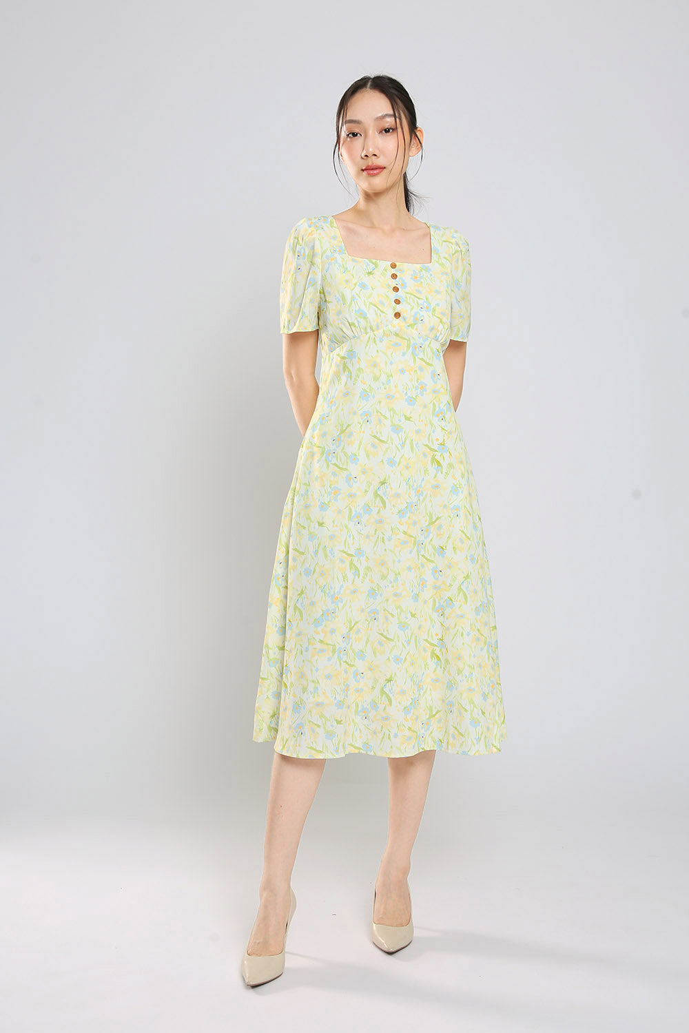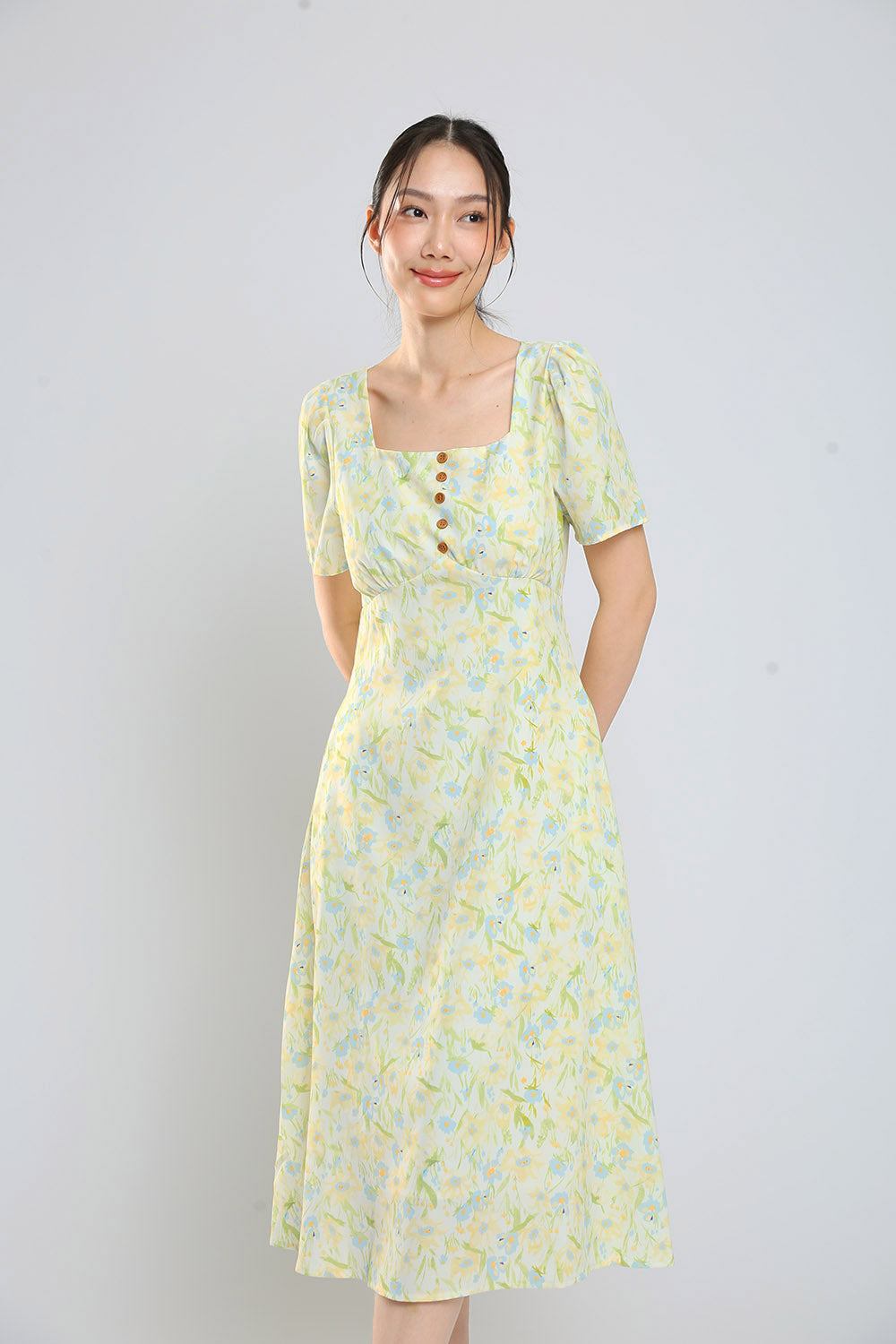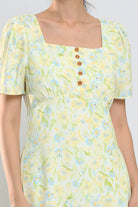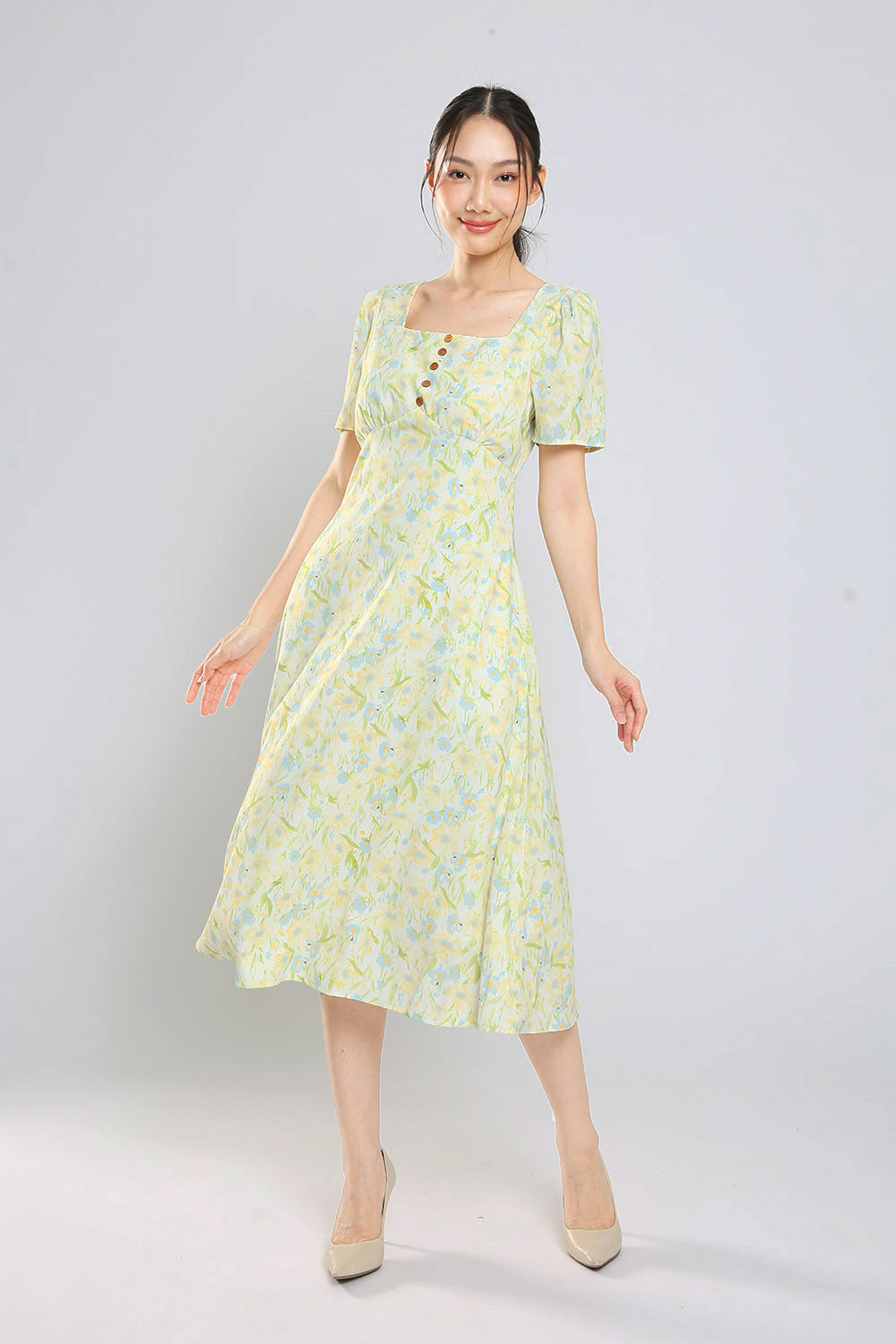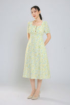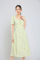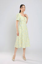 Introducing the Belunna Maxi Dress in Light Yellow Floral. This stunning dress features a front faux button decoration, adding a touch of elegance to the classic silhouette. With full lining and a back zip closure, it provides both style and comfort. Complete with practical side pockets, it's the perfect dress for any occasion.