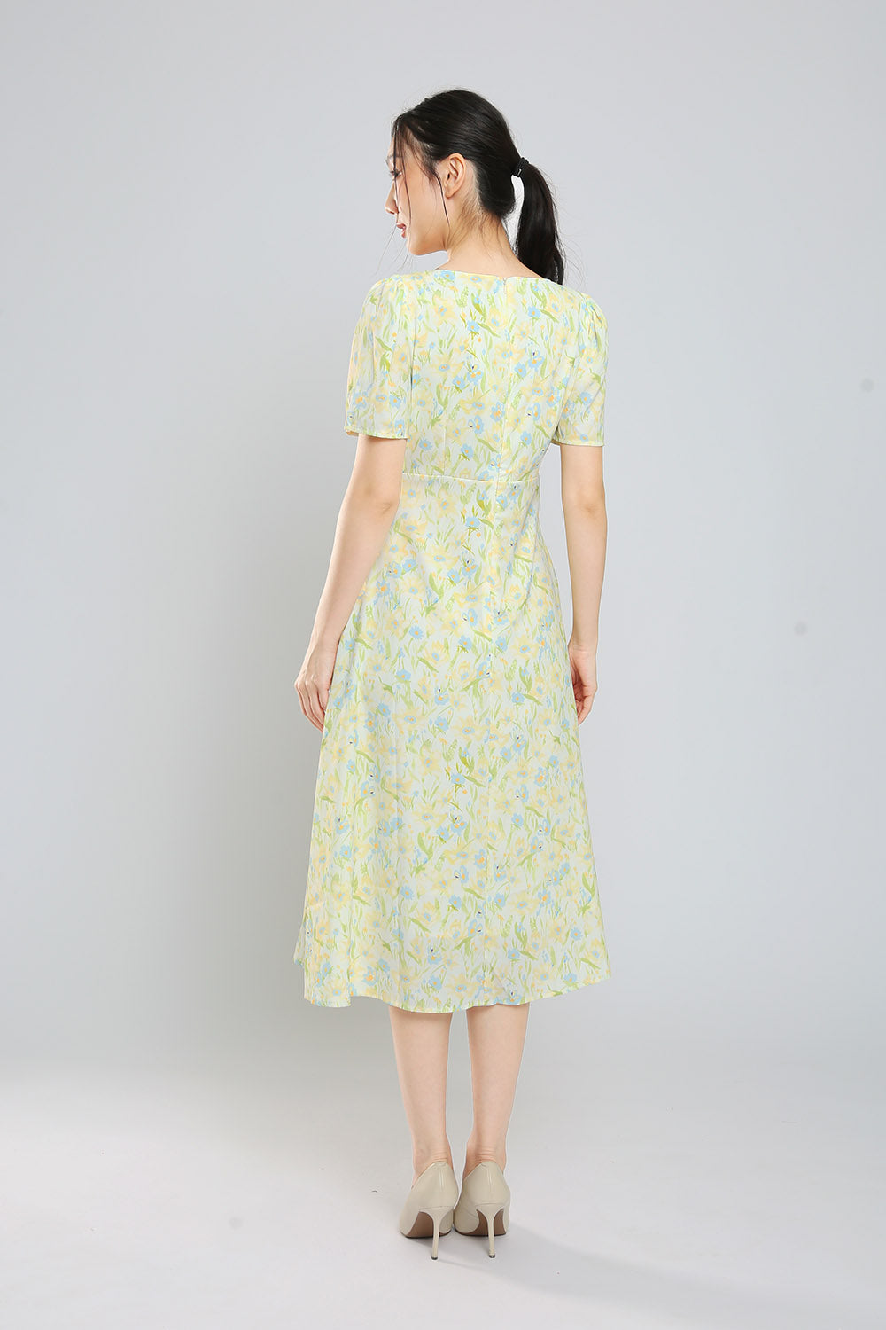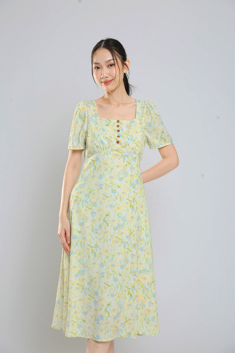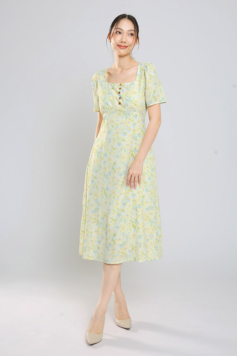 Introducing the Belunna Maxi Dress in Light Yellow Floral. This stunning dress features a front faux button decoration, adding a touch of elegance to the classic silhouette. With full lining and a back zip closure, it provides both style and comfort. Complete with practical side pockets, it's the perfect dress for any occasion.