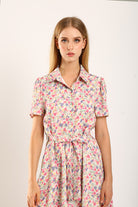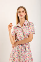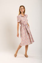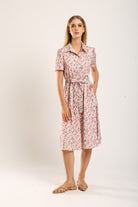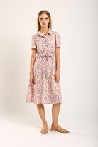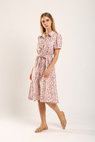Introducing the Carter Midi Dress, now in a delightful floral print and enhanced with a full lining for added comfort and modesty. This beautifully crafted dress features a collared neckline, short sleeves, and a self-tie waistbelt to create a flattering silhouette. The midi-length A-line skirt flows effortlessly, offering a timeless and elegant look. The breathable yet fully lined fabric ensures you stay comfortable while maintaining a polished appearance. Perfect for garden parties, weekend brunches, or casual outings, this dress pairs effortlessly with sandals or heels for versatile styling.