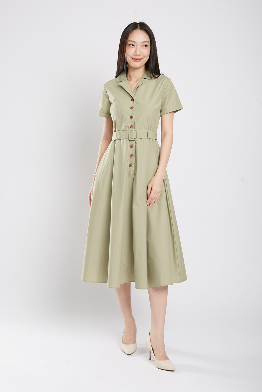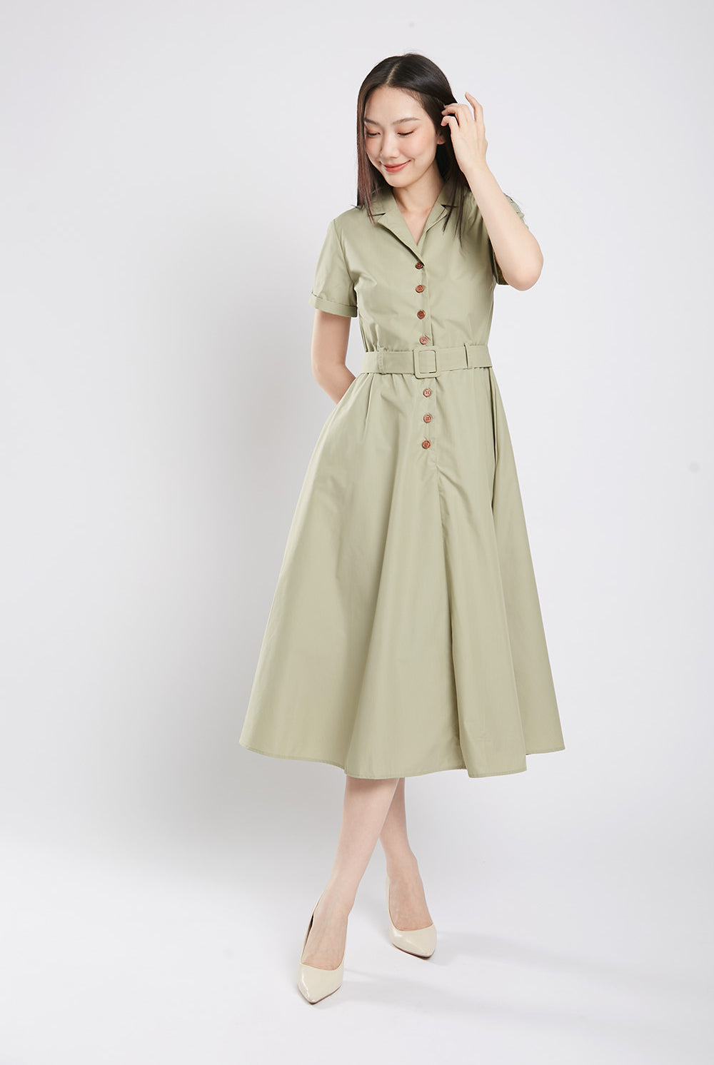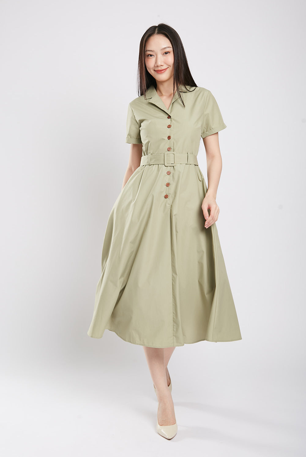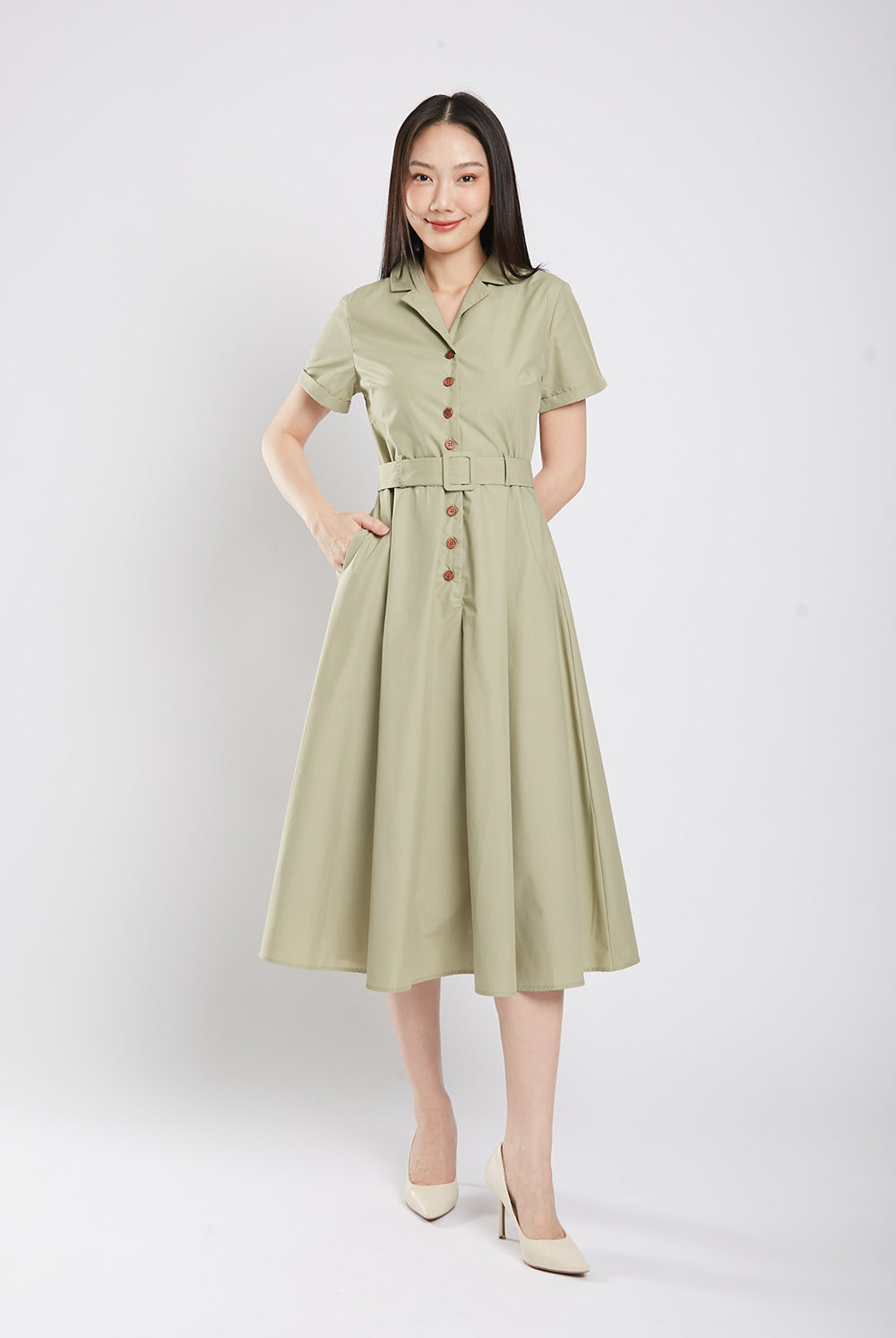 Get ready to bloom in the one-of-a-kind Dahlia Midaxi Dress in Sage Green! Featuring a front button closure, detachable belt, and convenient side pockets, this dress is perfect for any occasion. Made with a comfortable cotton blend material and a flattering lining, it's both stylish and practical. Don't miss out on this unique piece!