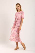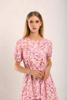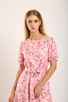 The dress showcases a dreamy pink and purple floral print, complemented by a flattering round neckline and softly puffed short sleeves with elastic cuffs. A self-tie belt cinches the waist for a customized fit, enhancing the feminine silhouette. The back zip closure adds convenience, making it easy to wear.
