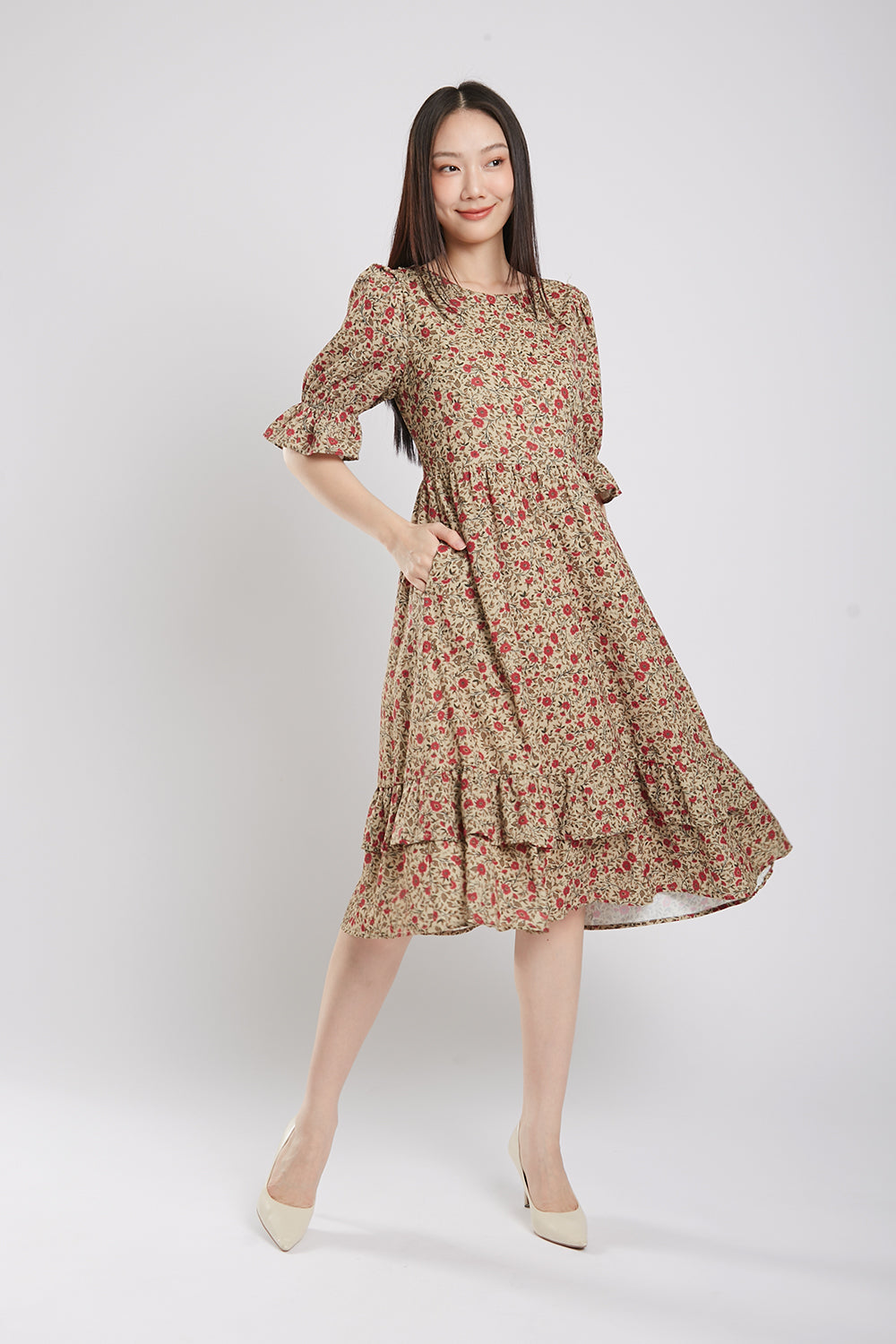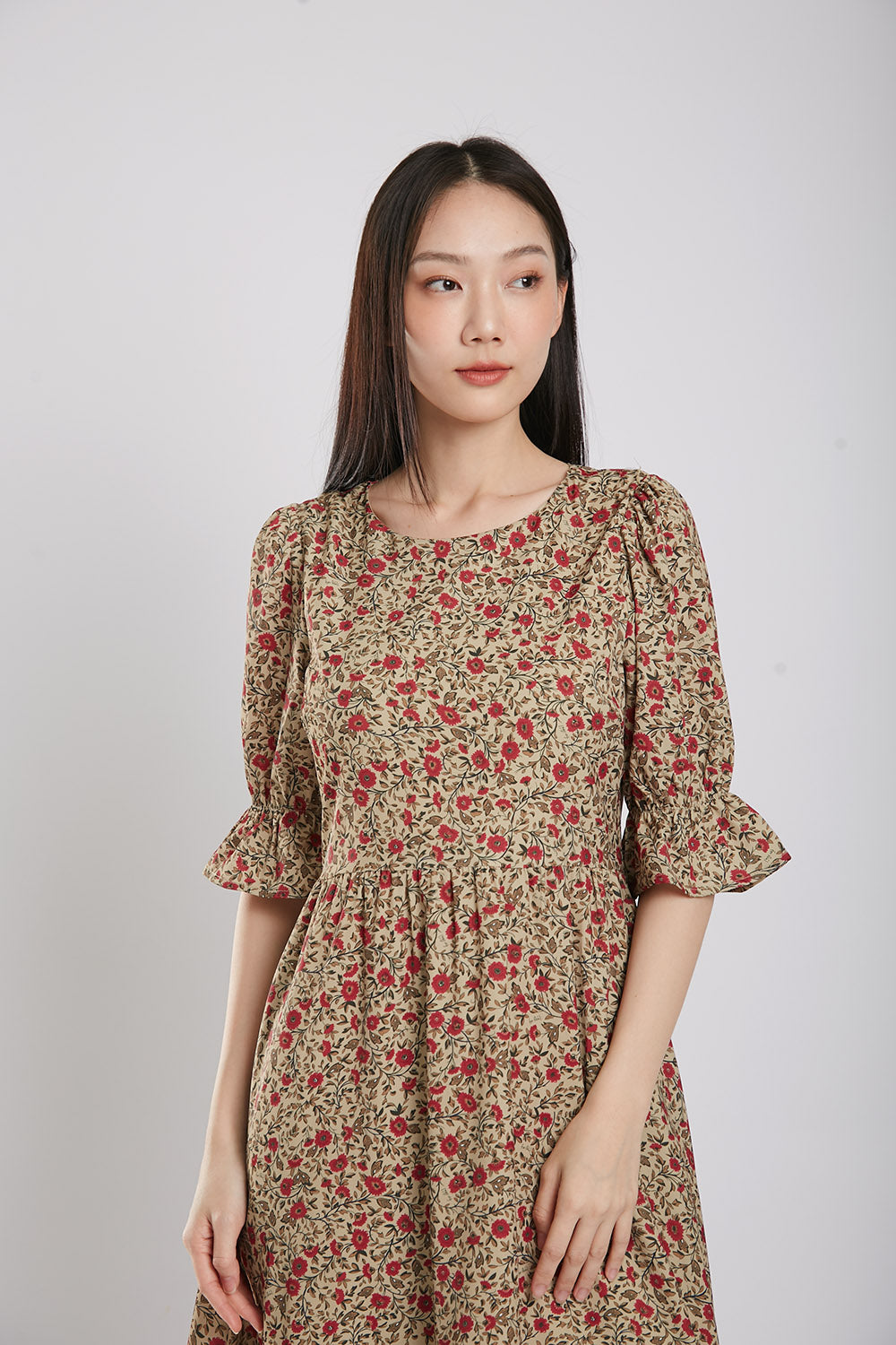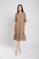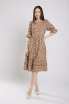Elevate your wardrobe with the Suri Maxi Dress in Coffee Floral. This elegant dress features full lining and smooth polyester fabric for a comfortable fit. The back zip closure allows for easy wear, while the elasticized cuff adds a touch of style. Perfect for any occasion.
