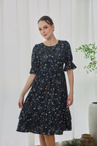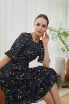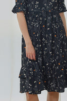 Introducing the Suri Maxi Dress in a fresh Noir Bloom print—where soft ivory and tangerine florals dance across a deep navy-black base. Designed with flutter sleeves, a softly gathered waist, and tiered ruffle hem, it brings just the right balance of structure and movement.