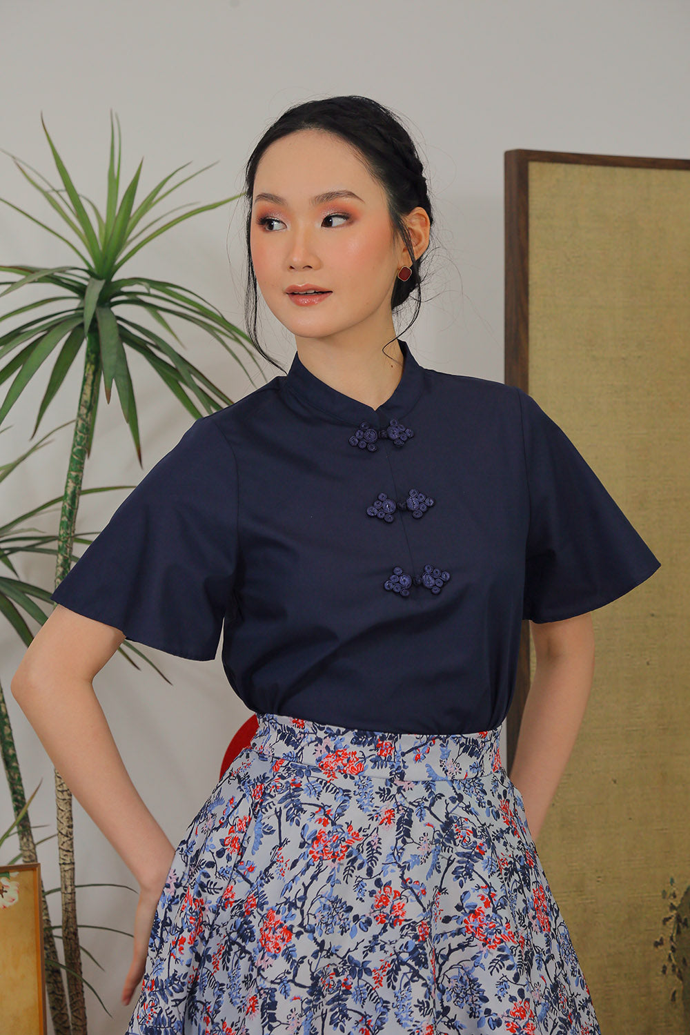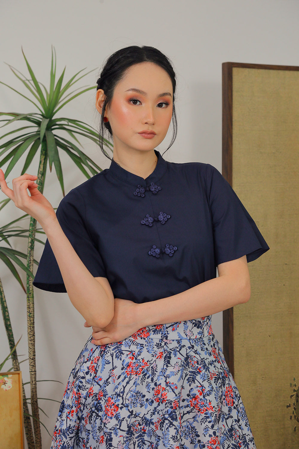 The Laurine Mandarin Collar Top brings modern oriental charm into an effortlessly wearable silhouette. Designed with a structured mandarin collar and classic frog button detailing, this piece balances timeless elegance with contemporary ease.