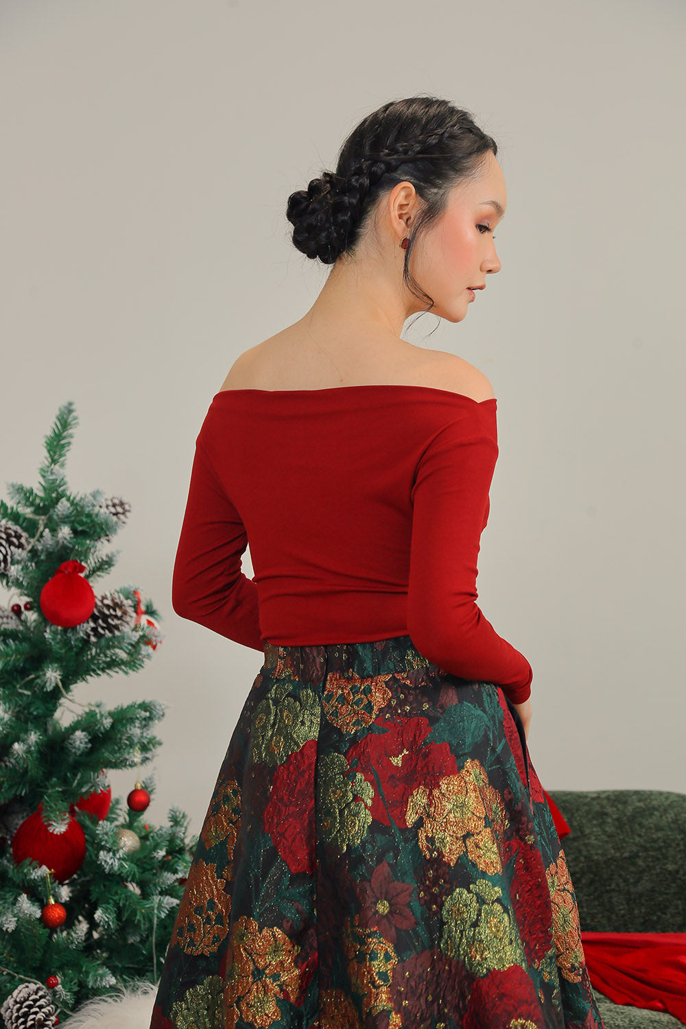 For a striking, elevated ensemble, pair it with the Malene Jacquard Floral Midi Skirt in Crimson Gold Green. The luxurious jacquard texture and bold sculptural florals of the skirt complement the minimalist elegance of the Selene Top, creating a sophisticated and festive-ready pairing.
