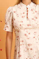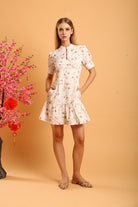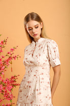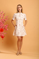 Embrace elegance and versatility with the Bevelia Cheongsam in Rose Blush. This exquisite piece is crafted from a special textured fabric adorned with delicate floral patterns, offering a blend of tradition and contemporary style. Fully lined for comfort, the cheongsam features a back zip closure for a seamless fit and functional side pockets for a modern touch. The tailored silhouette is complemented by puff sleeves and a tiered skirt, adding a playful yet refined flair. Perfect for festive celebrations or sophisticated daytime looks, the Bevelia Cheongsam is a timeless addition to your wardrobe.
