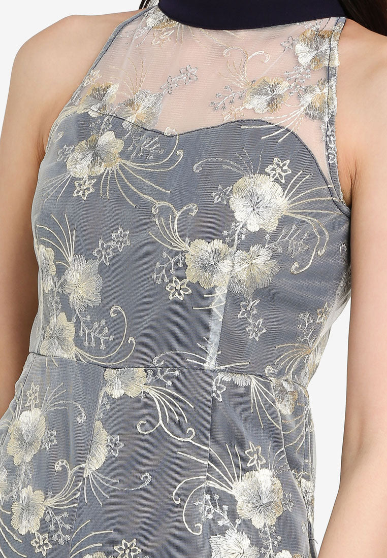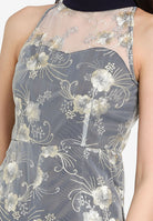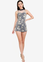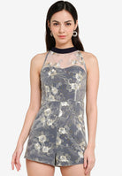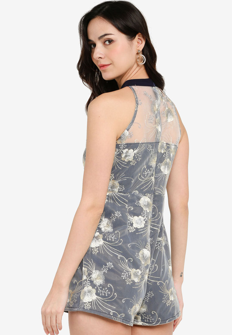 Cerise Mesh Floral Cheongsam Romper in Navy Blue
