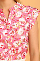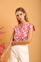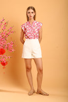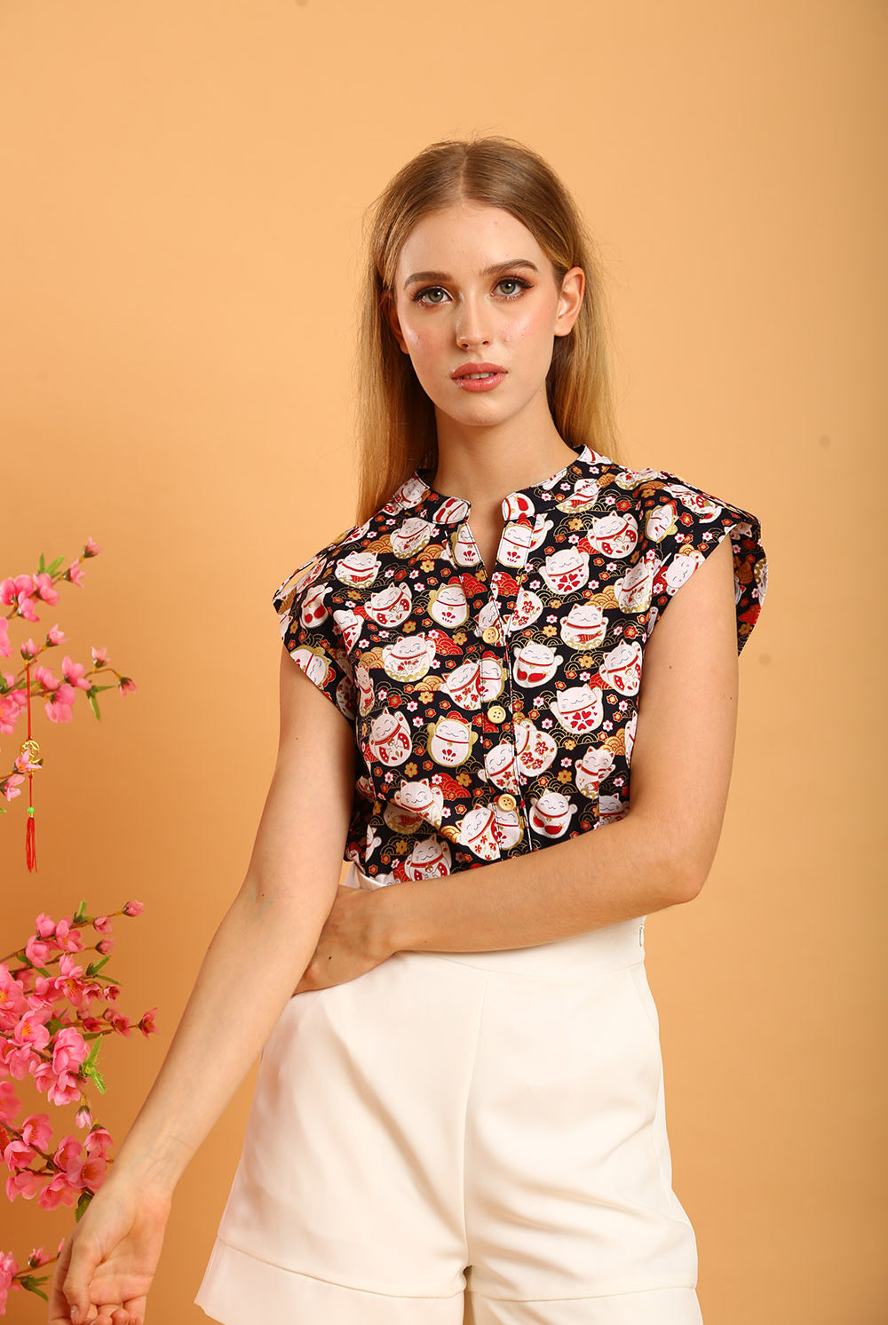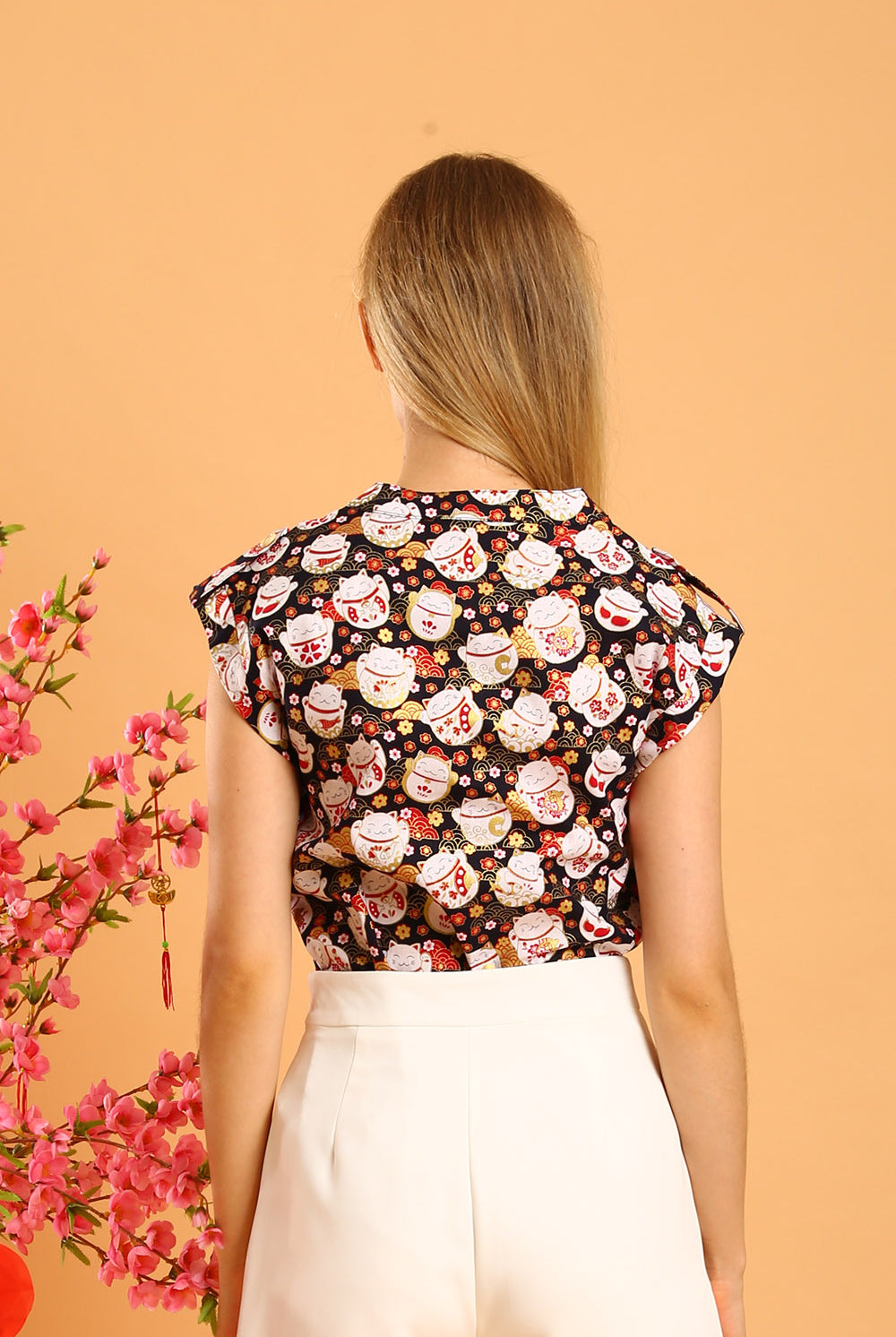 Bring playful charm to your wardrobe with the Felizia Linen Top in Pink Fortune Cat, a delightful addition from JULY Signature's collection. Crafted from breathable linen, this top features an enchanting fortune cat print in vibrant shades of pink, red, and gold, symbolizing luck and joy. The relaxed silhouette, cap sleeves, and buttoned mandarin collar offer a perfect blend of style and comfort.
