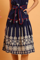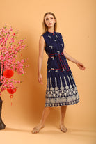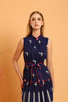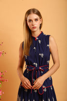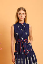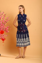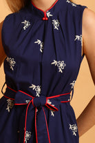 Designed with a mandarin collar and sleeveless silhouette, the Harleen Cheongsam embraces classic Asian-inspired details while offering a modern, versatile fit. The vibrant red piping creates a striking contrast against the deep navy, beautifully framing the intricate embroidery. The matching waist belt, complete with red accents, allows you to cinch the waist for a flattering, tailored shape.