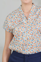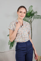 A breezy update to your weekday wardrobe. The Addie Top features a softly structured kimono-style neckline and short sleeves, detailed with an abstract floral print in autumn-inspired tones of blue, rust, and cream. Its relaxed fit and lightweight fabric offer all-day ease, making it a versatile piece for both work and off-duty looks.