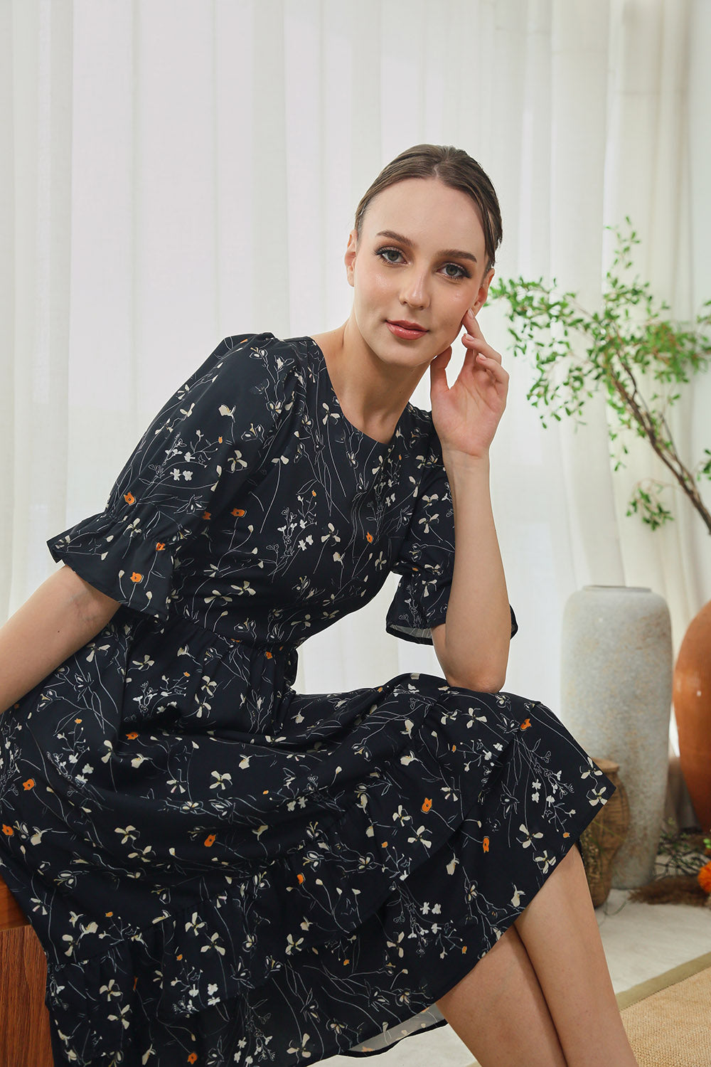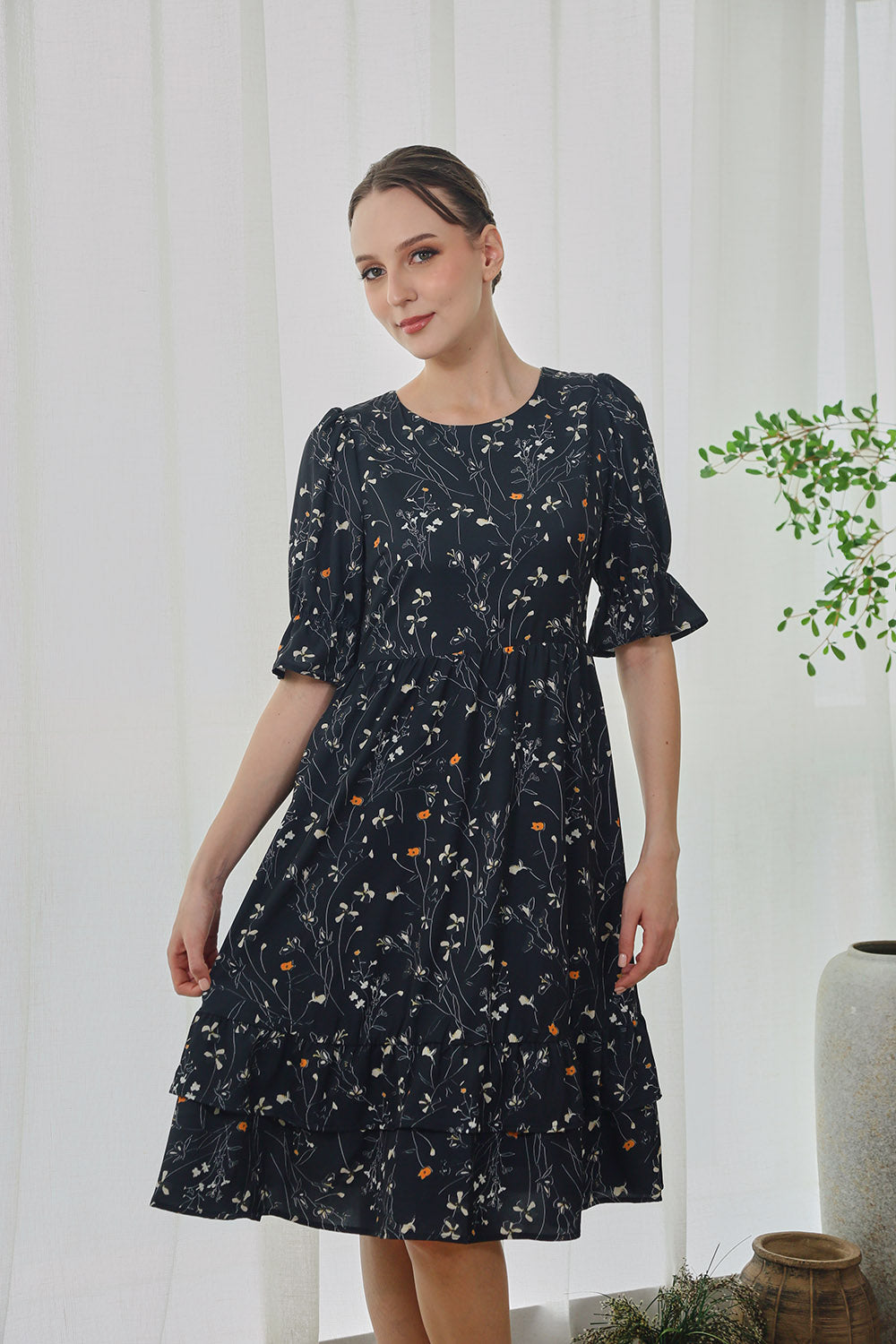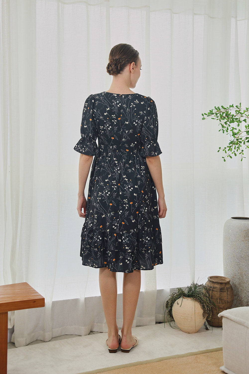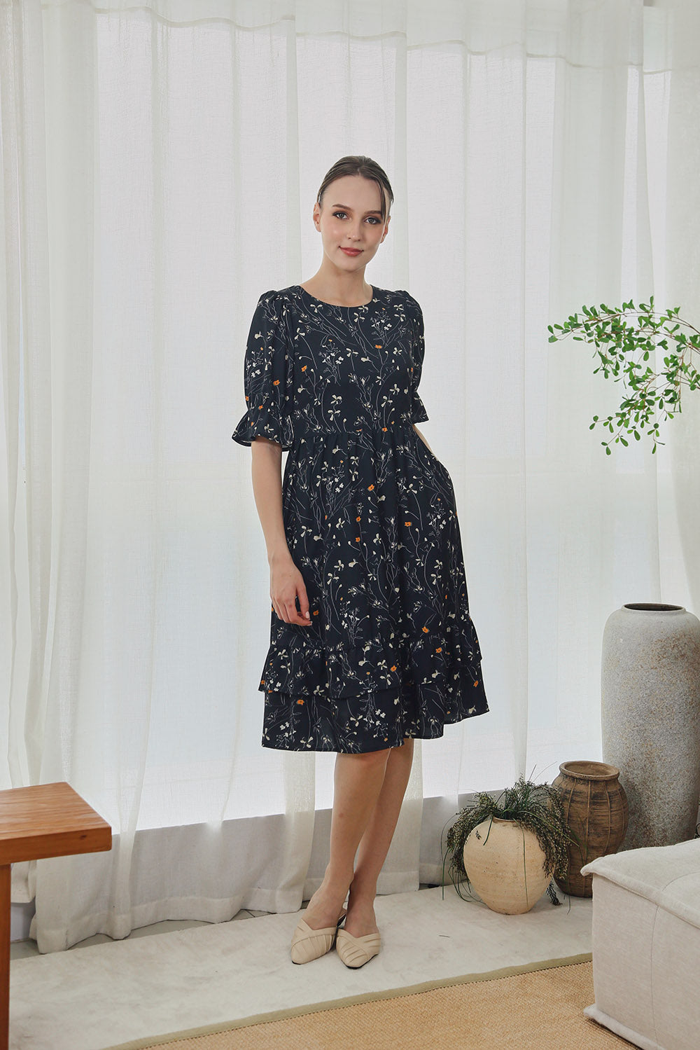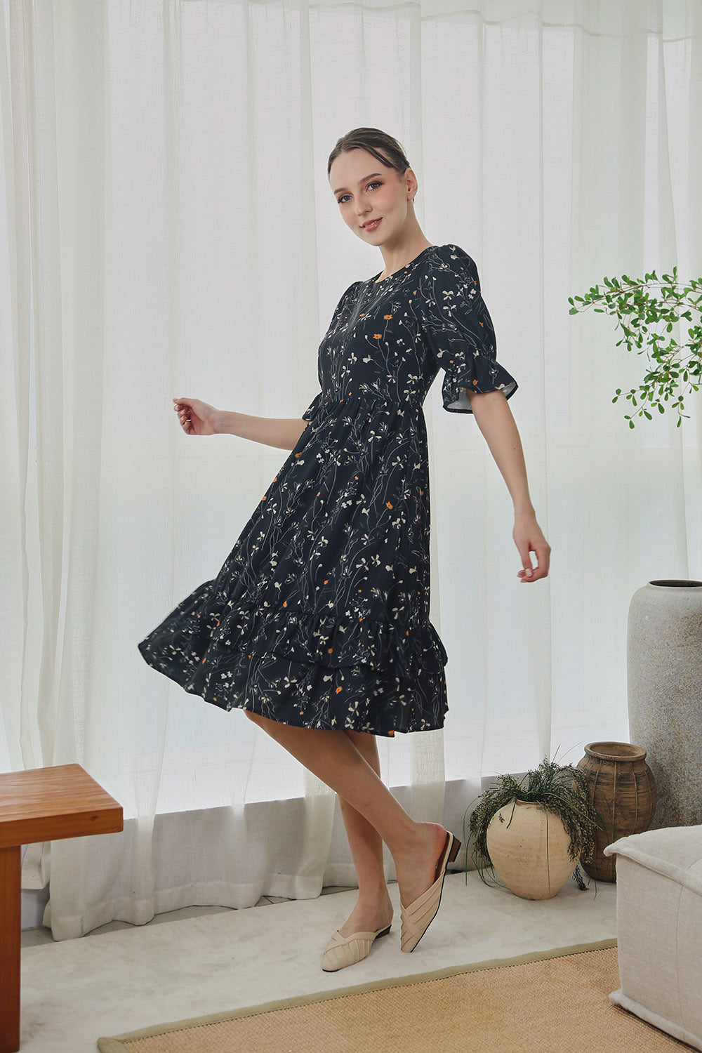 Dezza Midi Dress in Navy Blue Scenic Embroidery