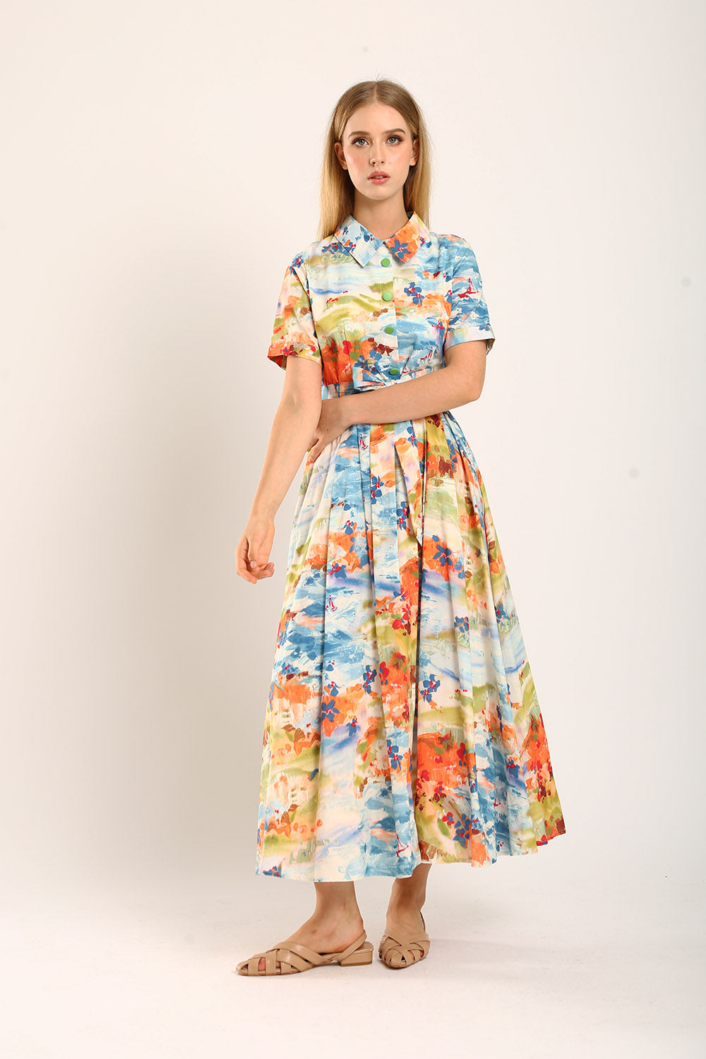 Erinn Collar Maxi Printed Dress in Green Floral