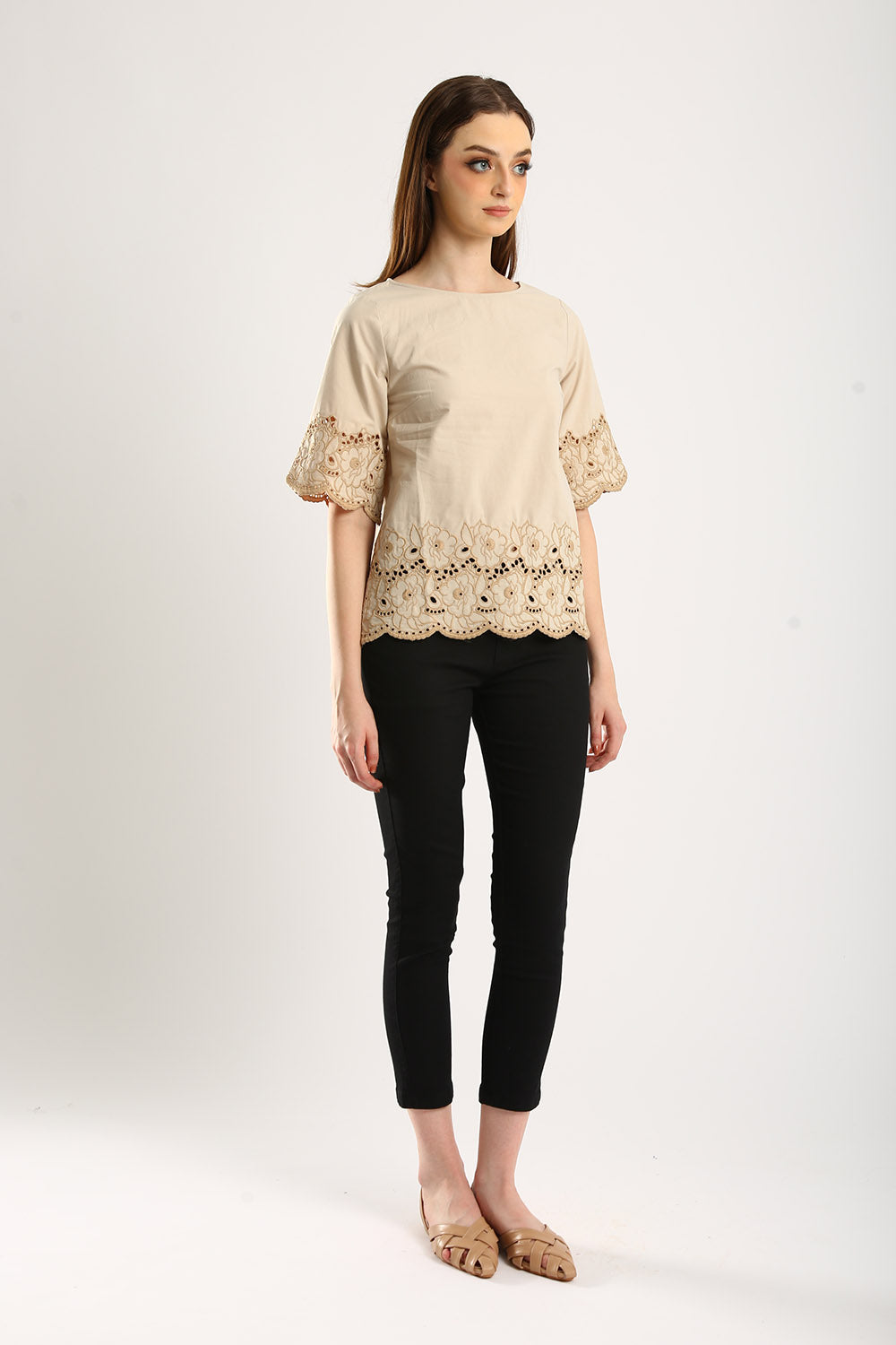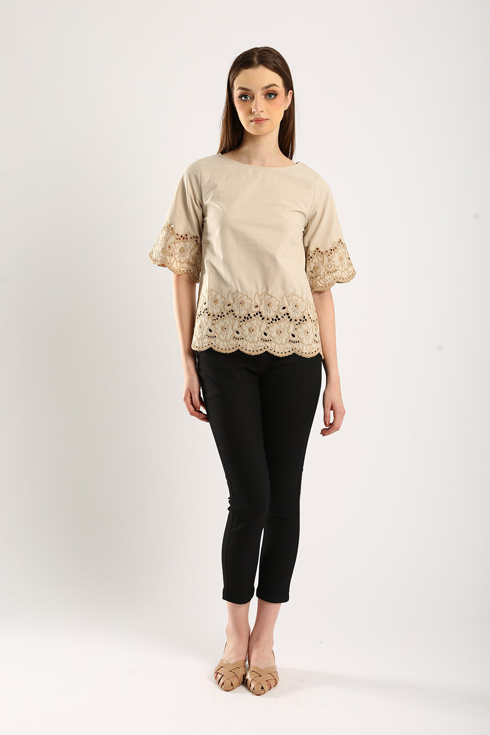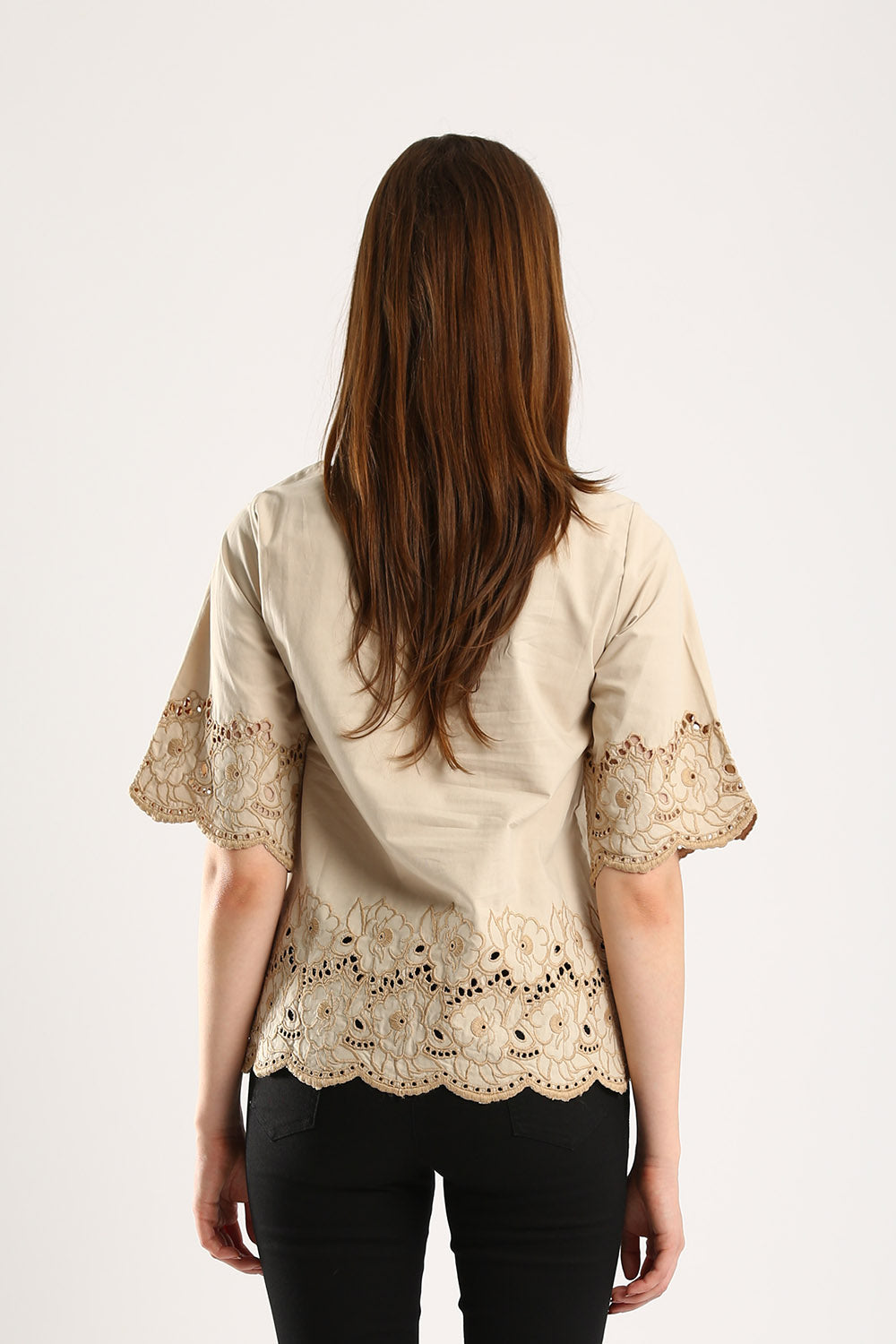 Elevate your wardrobe with the Simple Spirit Embroidered Bell Sleeve Blouse, crafted from 100% premium cotton for an irresistibly soft and breathable feel. This elegant khakis blouse showcases intricate floral embroidery along the hemline and bell sleeves, complete with scalloped edges for a refined, feminine touch. The cutwork detailing adds texture and artistry, making this piece as beautiful as it is comfortable.