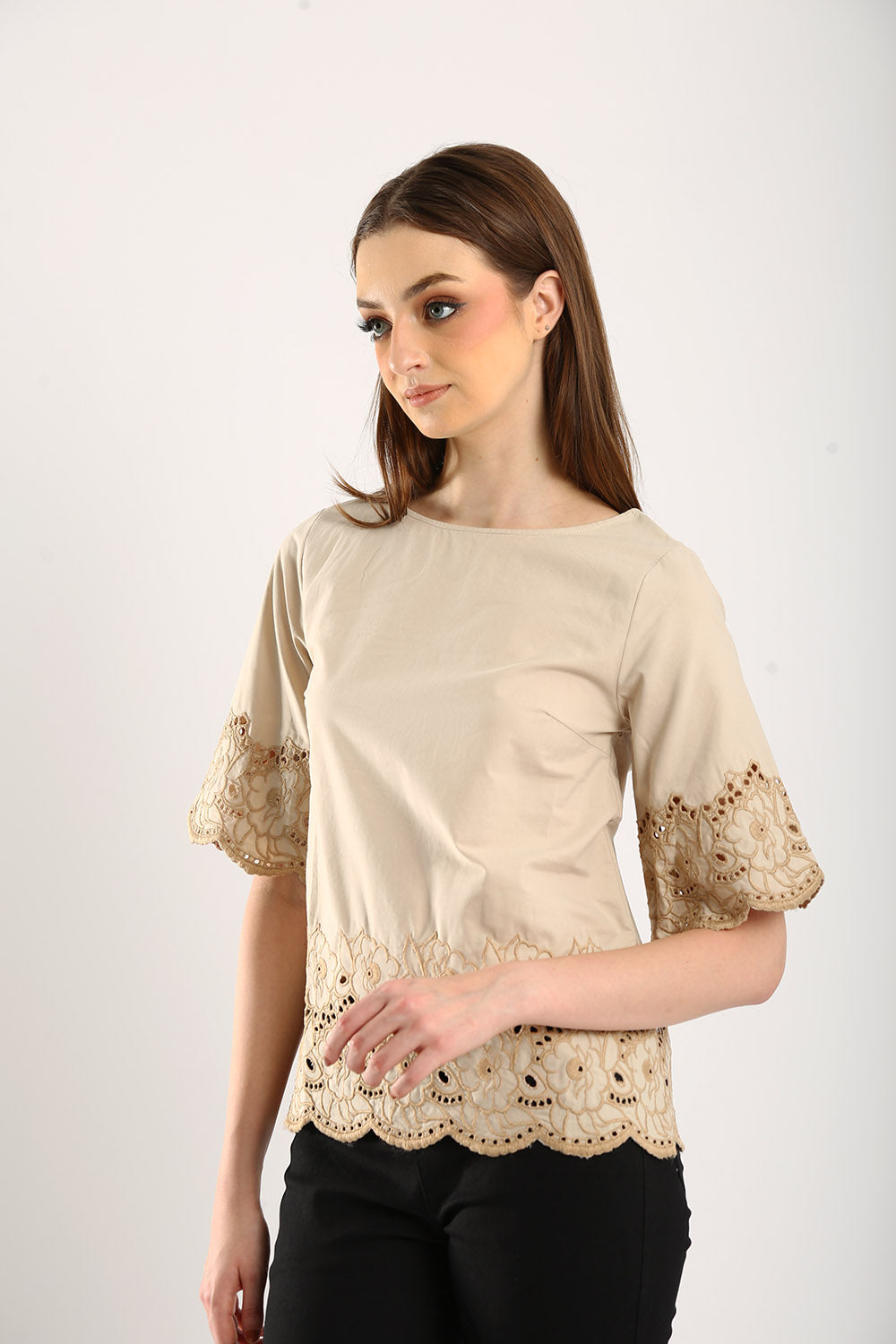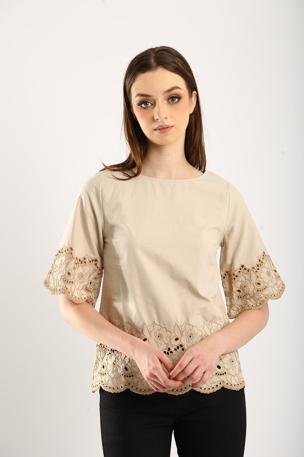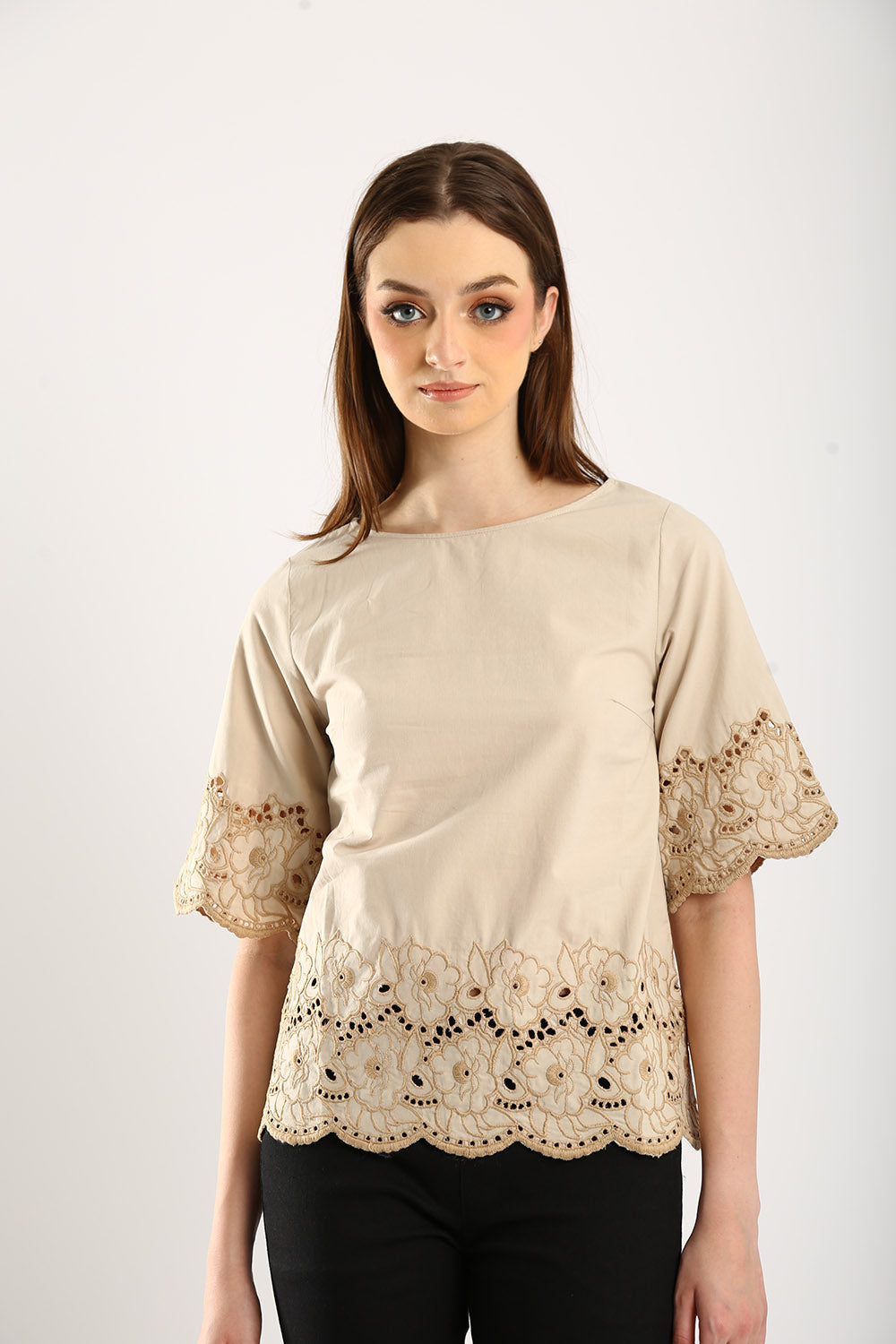 Elevate your wardrobe with the Simple Spirit Embroidered Bell Sleeve Blouse, crafted from 100% premium cotton for an irresistibly soft and breathable feel. This elegant khakis blouse showcases intricate floral embroidery along the hemline and bell sleeves, complete with scalloped edges for a refined, feminine touch. The cutwork detailing adds texture and artistry, making this piece as beautiful as it is comfortable.