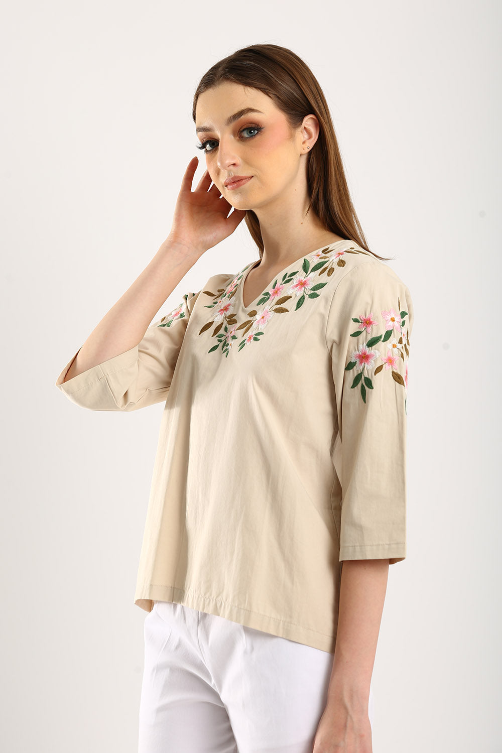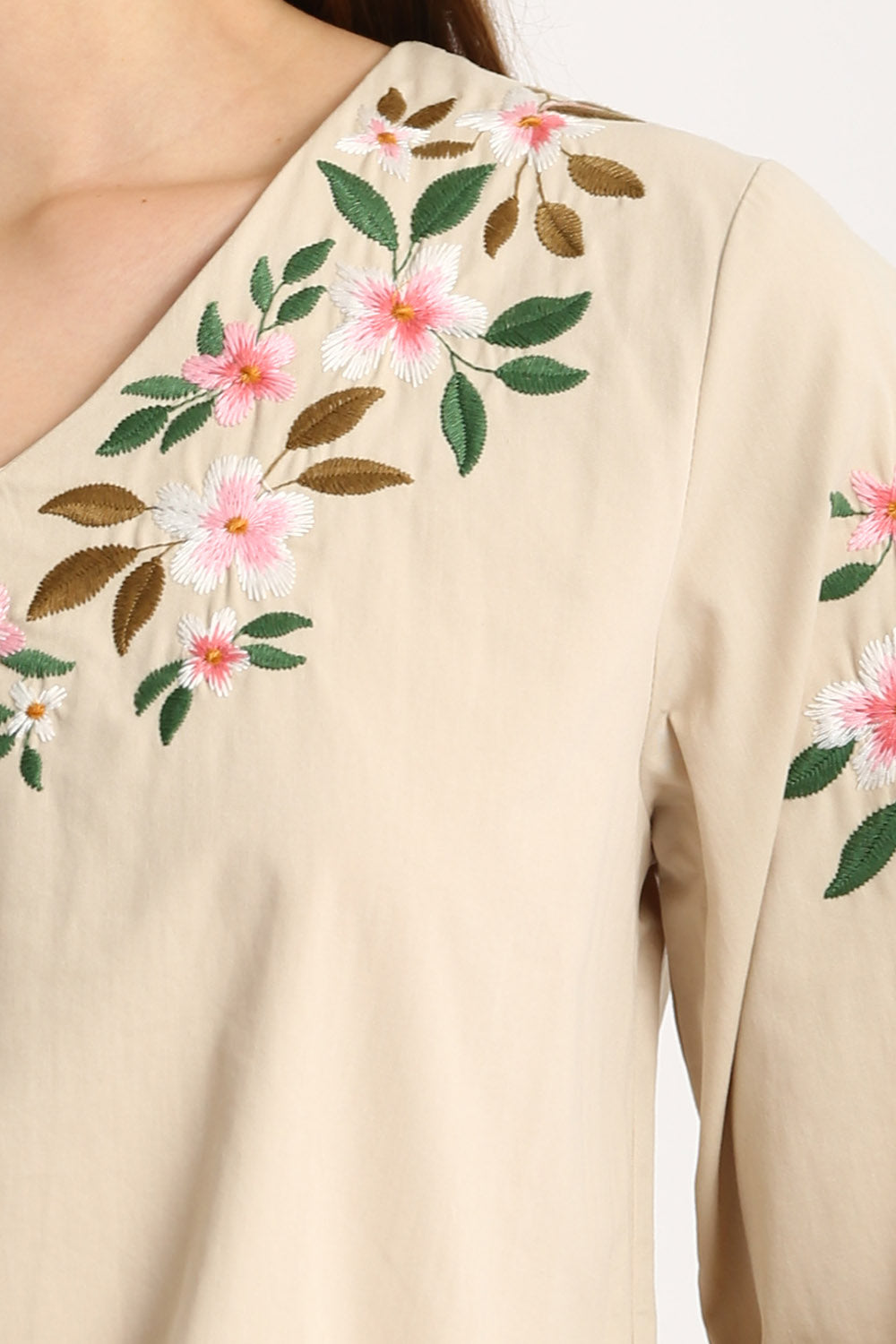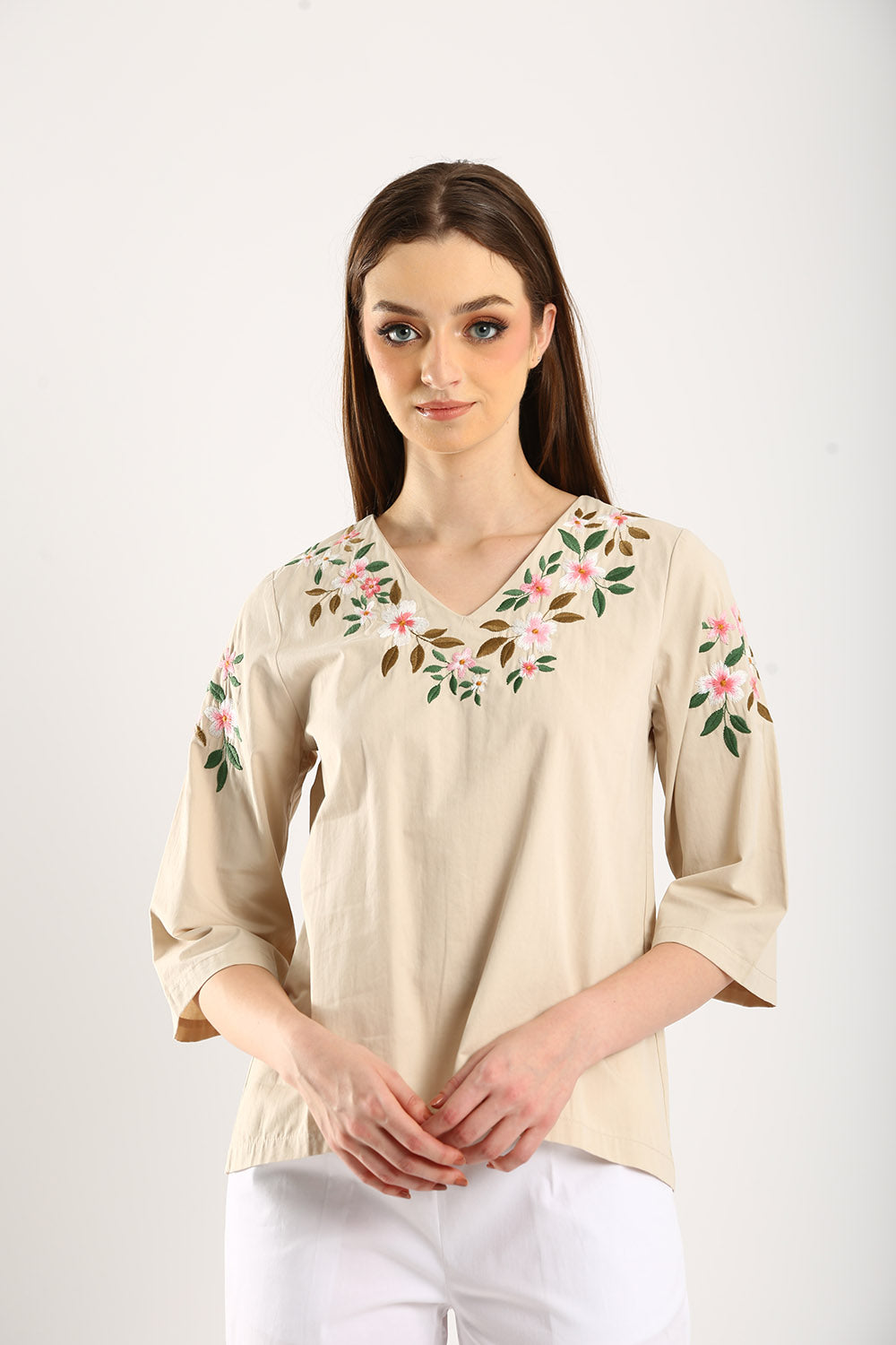 This light apricot blouse features beautiful floral embroidery and is made from 100% premium cotton, ensuring comfort and quality. Its slip on design makes it easy to wear, while the embroidery adds a touch of elegance. Experience the perfect combination of style and comfort with this blouse.