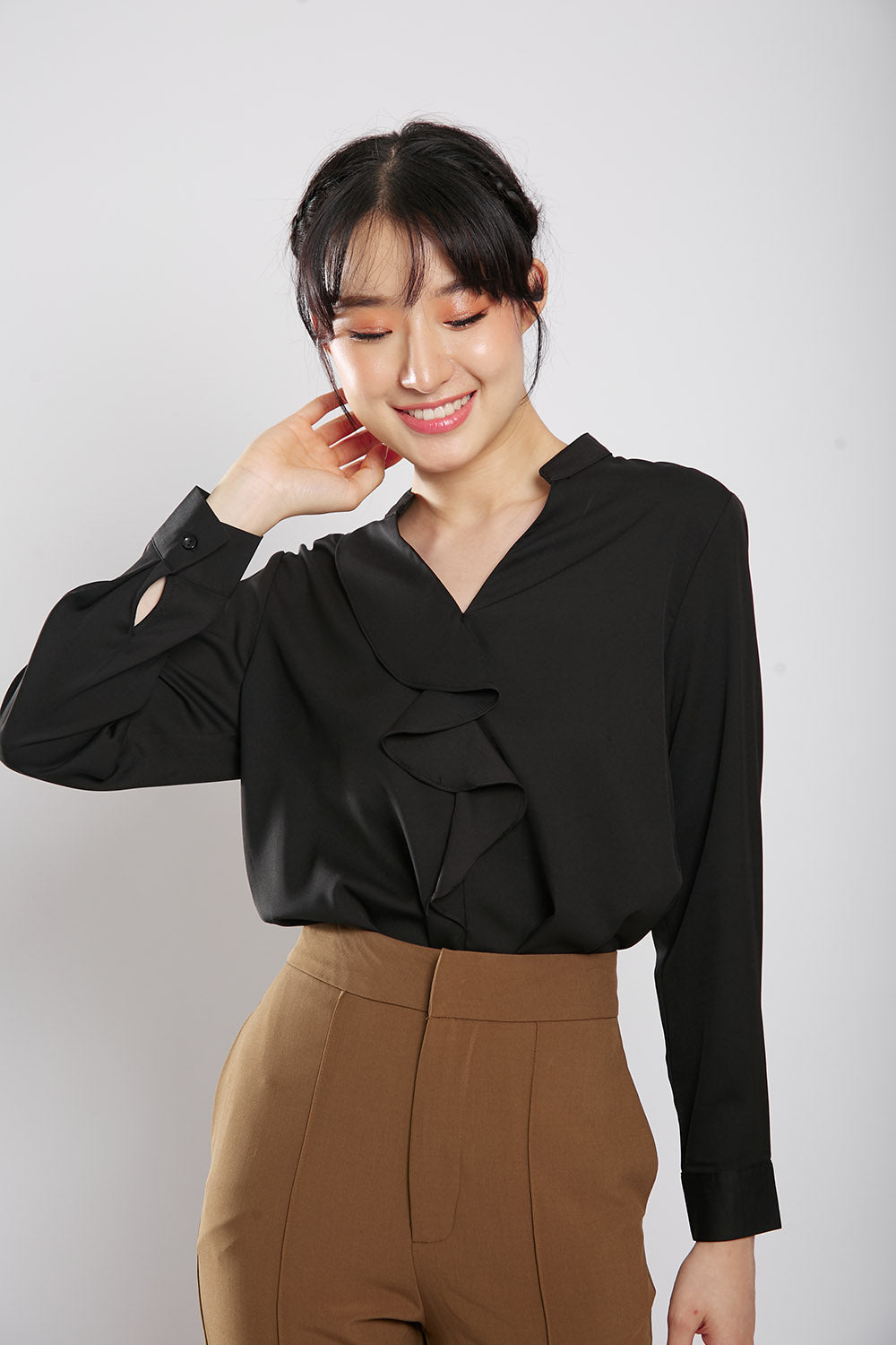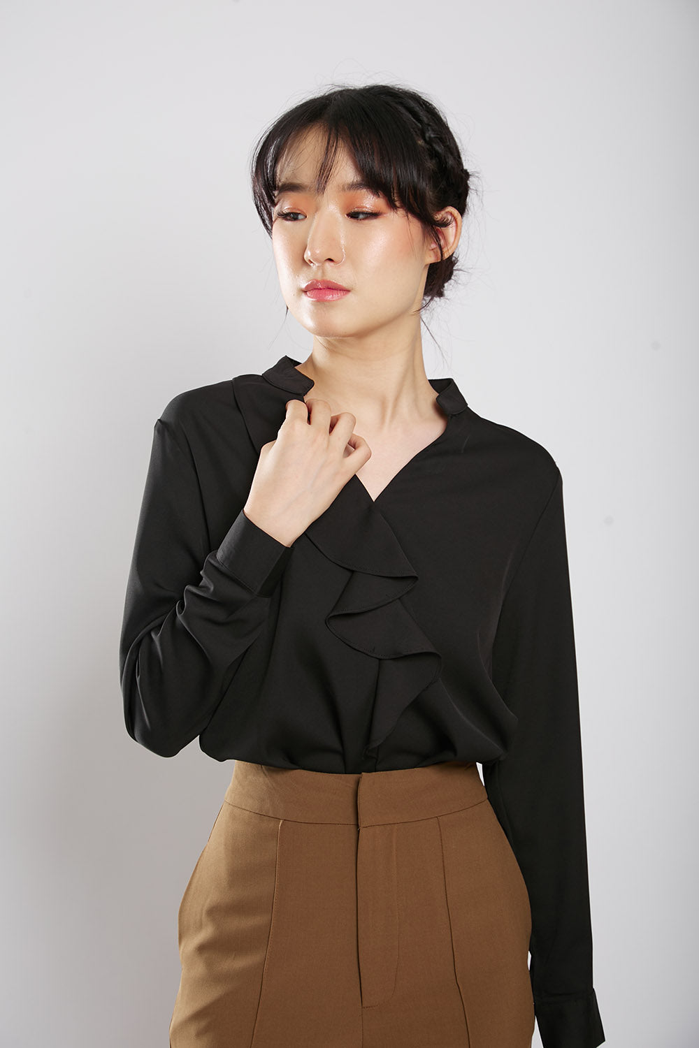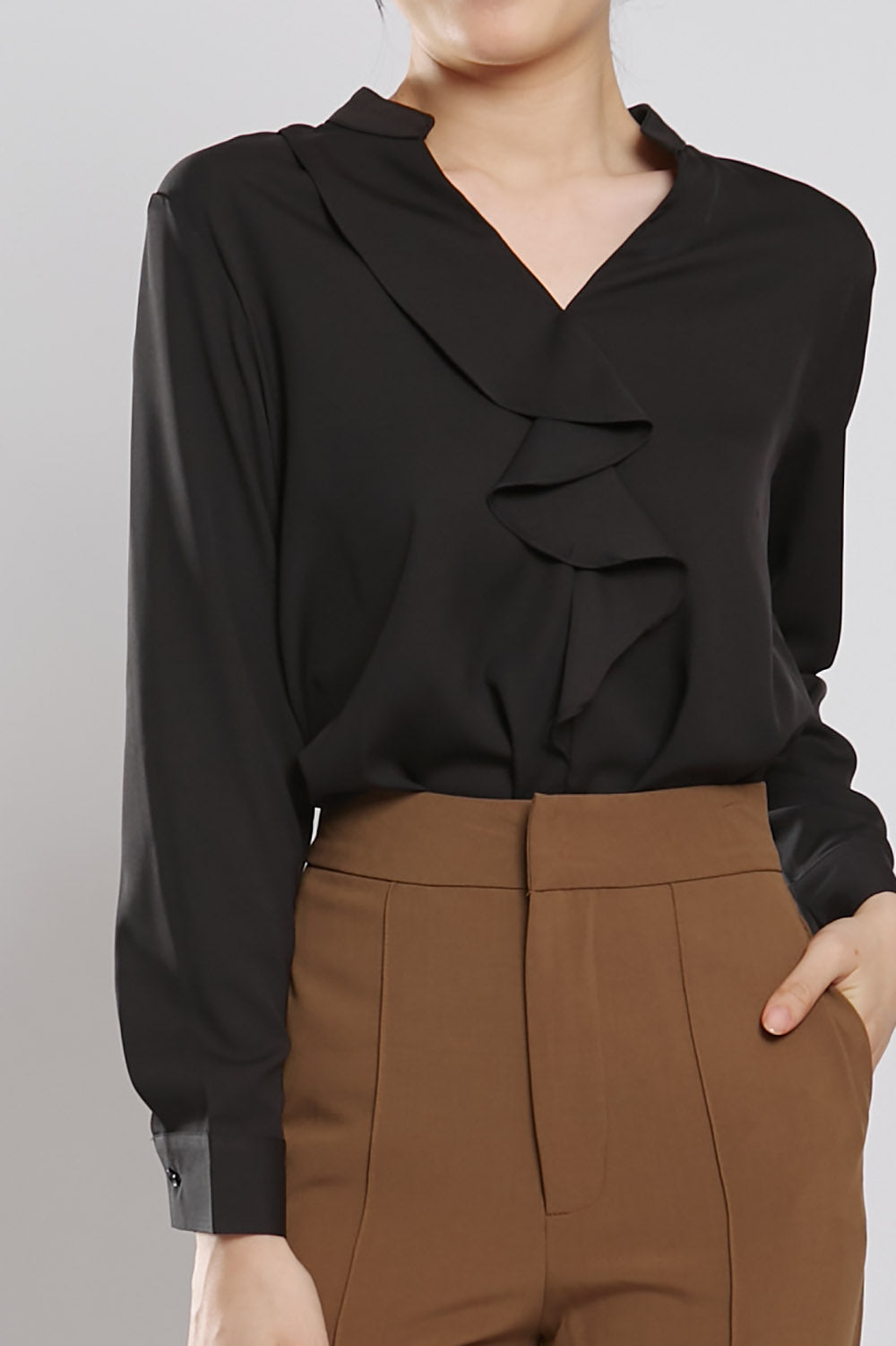 Discover effortless style and comfort with the Astie Blouse in Black. Featuring elegant front ruffle detailing and a flattering v neckline, this blouse is made from iron-free fabric for hassle-free maintenance. Slip it on for a chic and polished look that's perfect for any occasion.