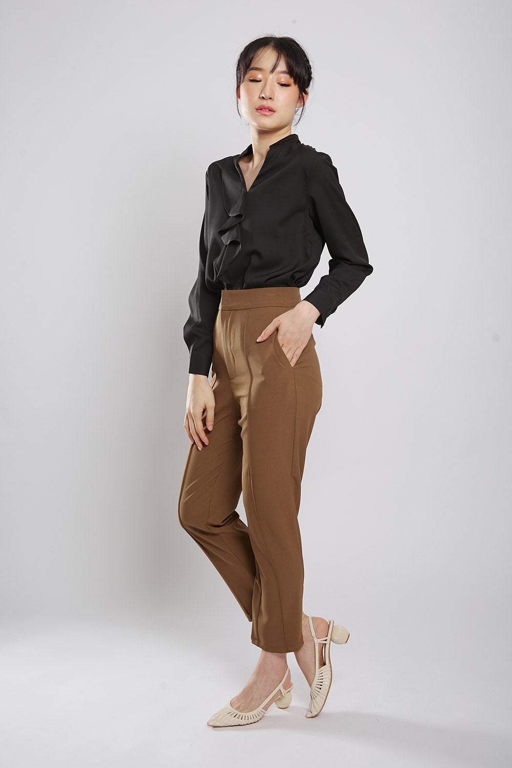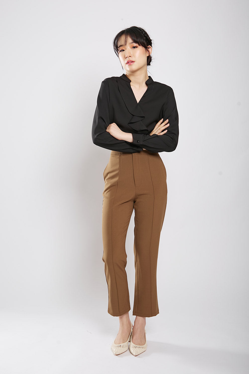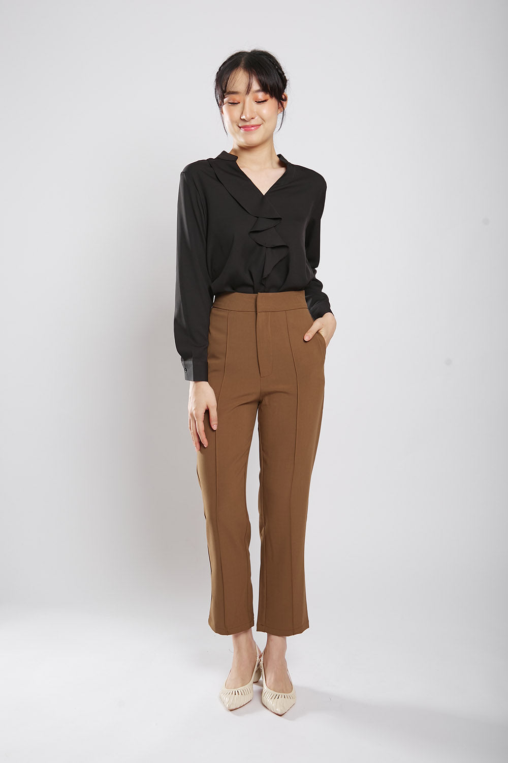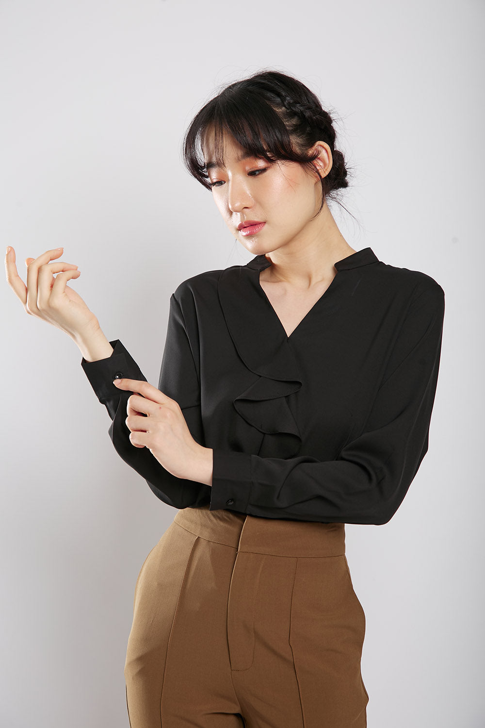 Discover effortless style and comfort with the Astie Blouse in Black. Featuring elegant front ruffle detailing and a flattering v neckline, this blouse is made from iron-free fabric for hassle-free maintenance. Slip it on for a chic and polished look that's perfect for any occasion.
