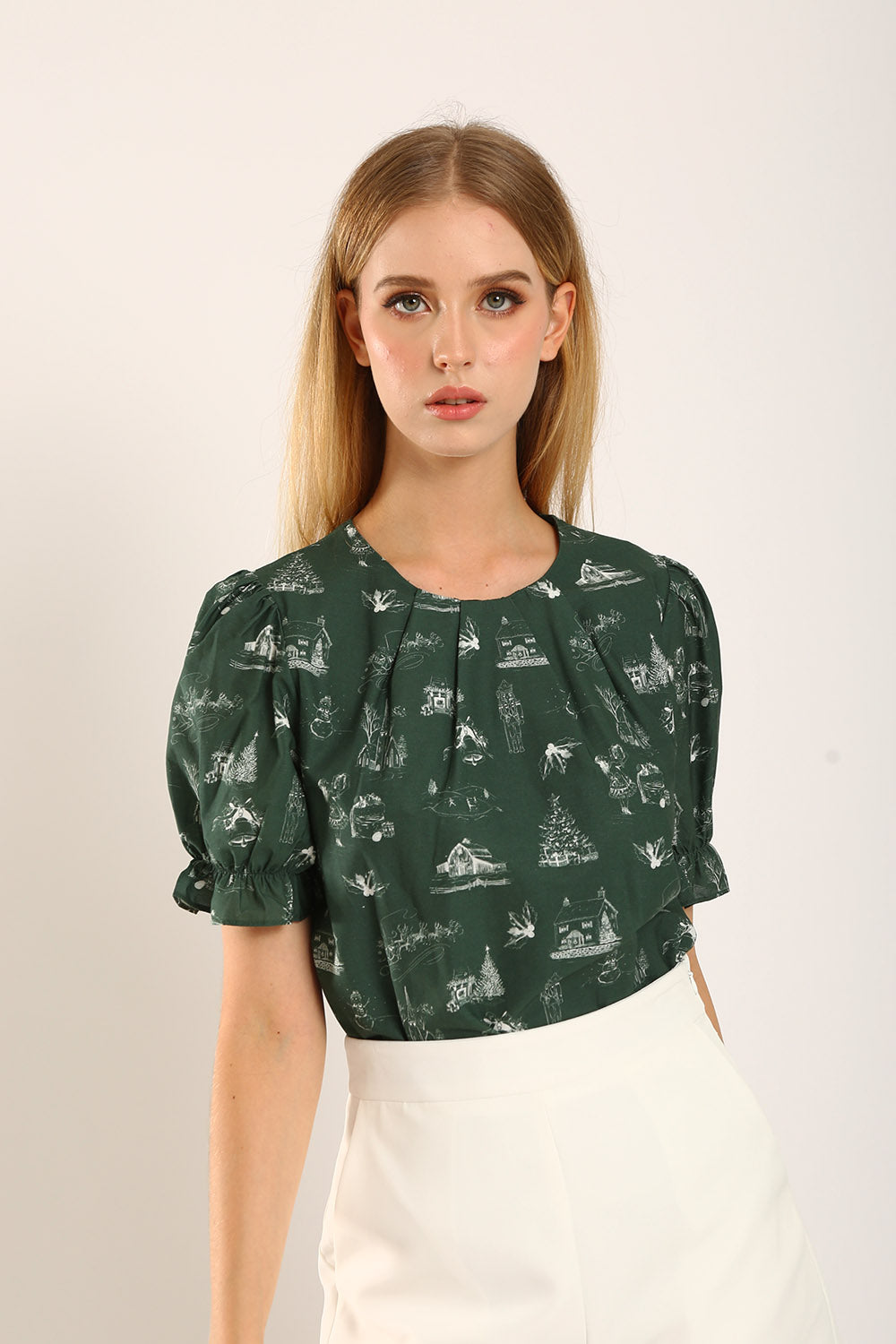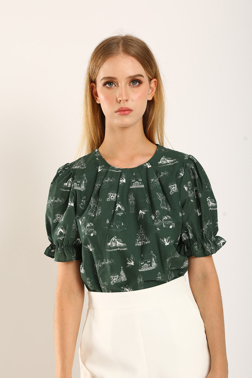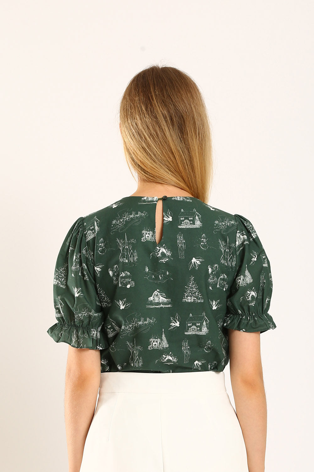 Welcome the holiday spirit with the Geia Blouse, a festive forest green top adorned with intricate, storybook-inspired illustrations that evoke the warmth of the season. Made from 100% premium cotton, this blouse ensures comfort without compromising on elegance. With its charming puff sleeves and delicate ruffled cuffs, the Geia Blouse adds a feminine touch to any outfit, while the relaxed silhouette makes it versatile for both casual and dressier occasions. Pair it with tailored pants or a skirt to embrace a look that’s both enchanting and timeless.
