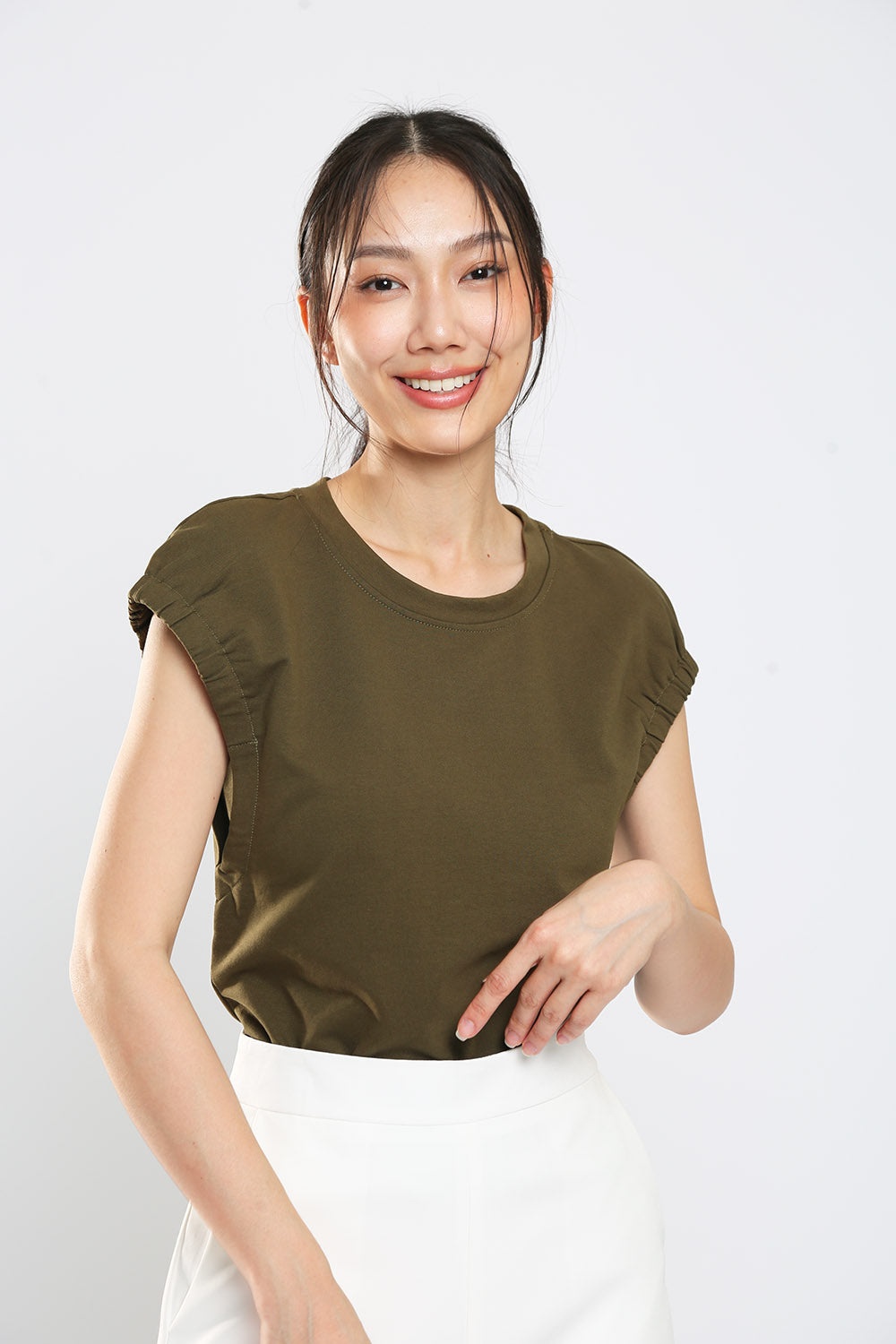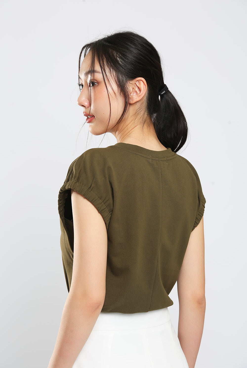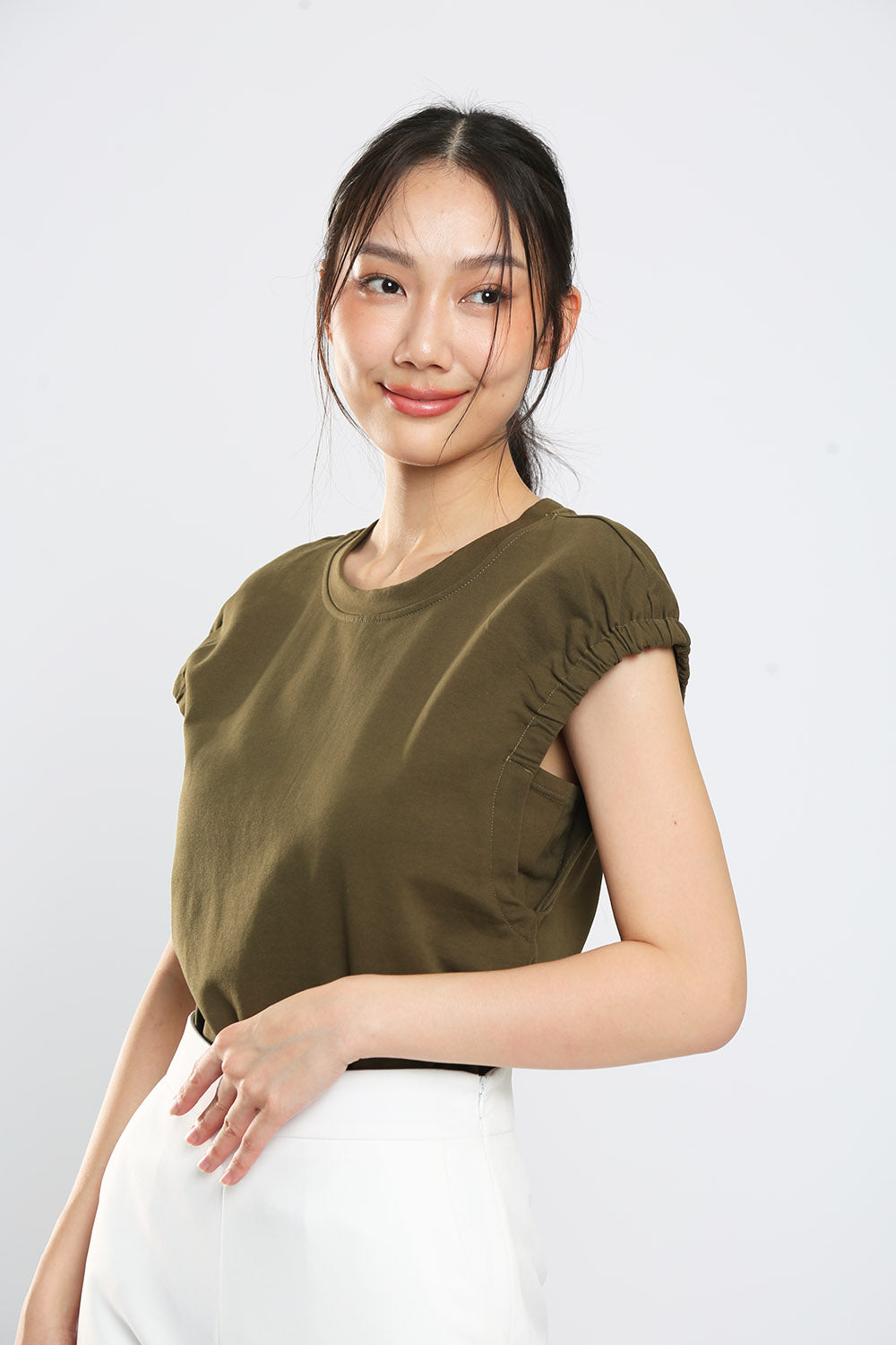 The Kaleni Top in Olive features elasticized cap sleeves and premium jersey fabric for an easy, slip-on wear. Made from high-quality materials, this top offers simple yet stylish convenience for your everyday wardrobe.
