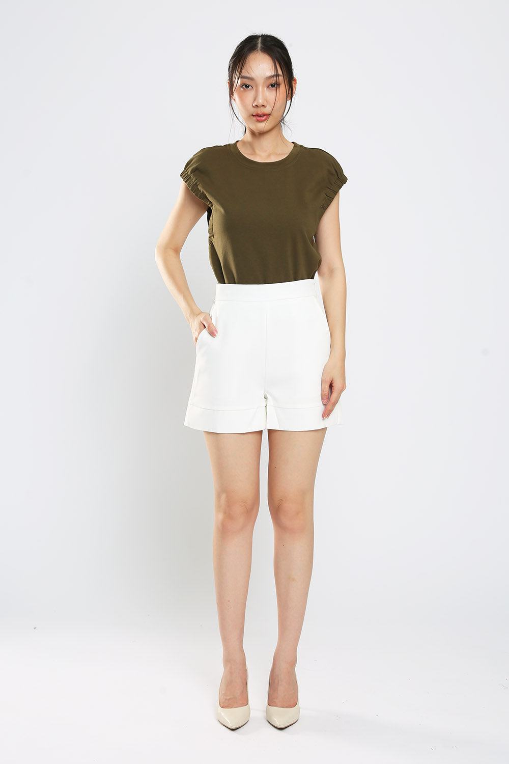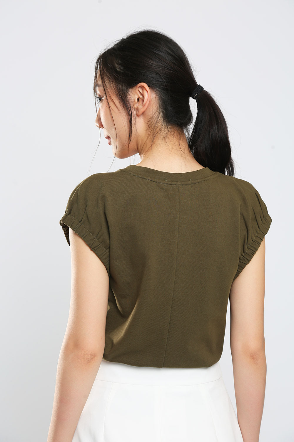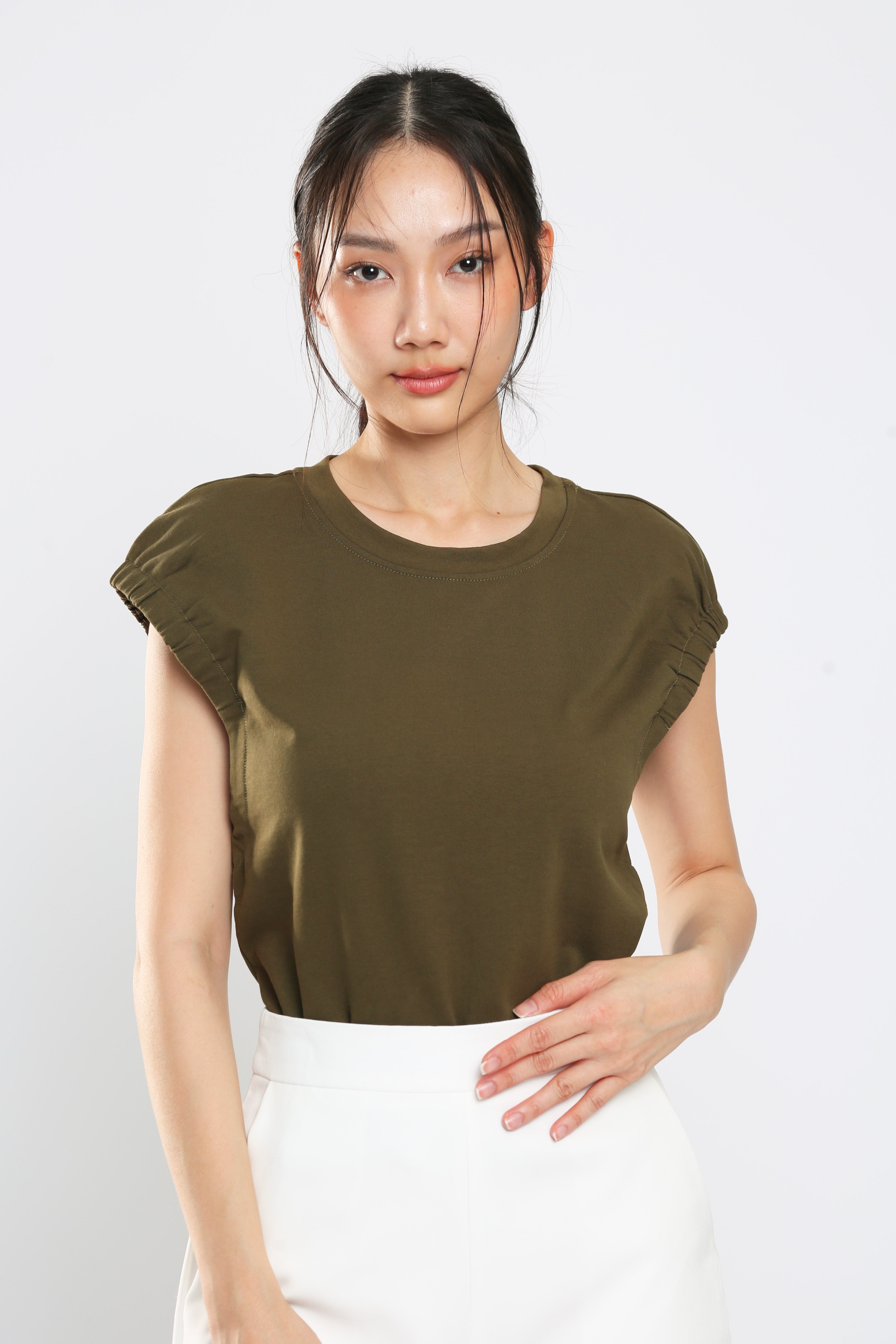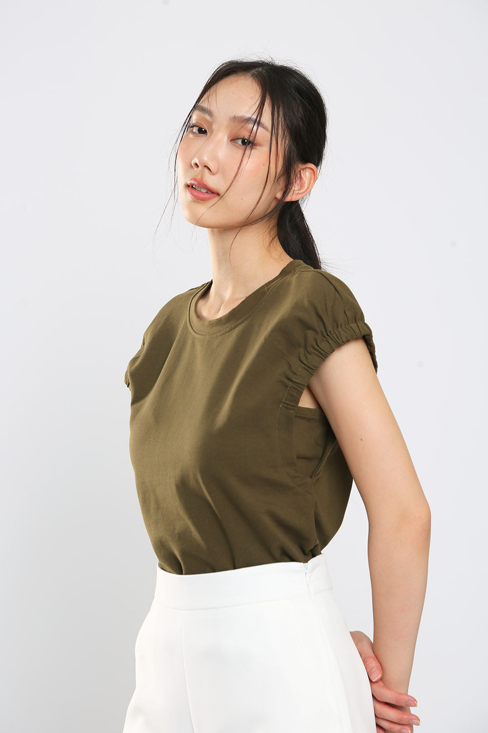 The Kaleni Top in Olive features elasticized cap sleeves and premium jersey fabric for an easy, slip-on wear. Made from high-quality materials, this top offers simple yet stylish convenience for your everyday wardrobe.