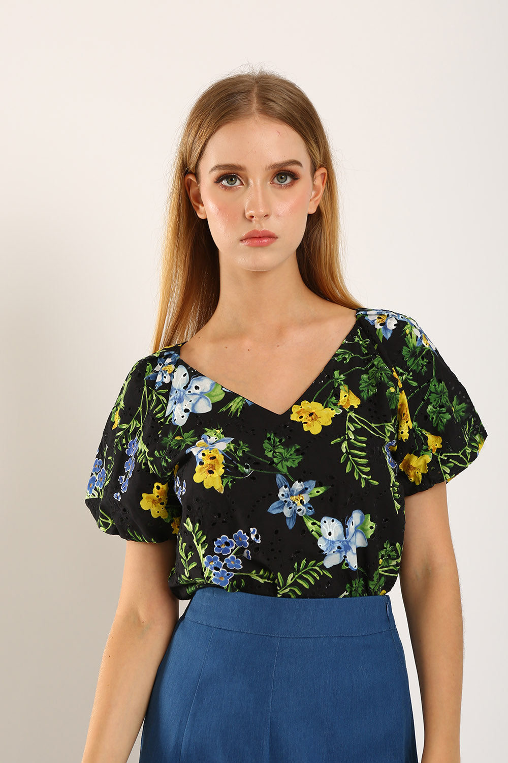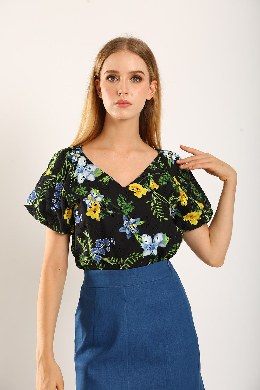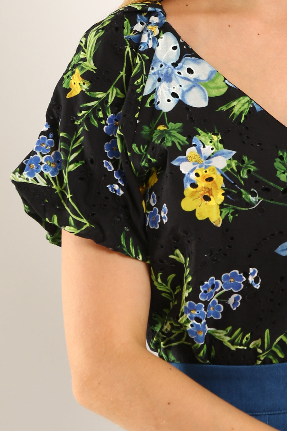 Add a pop of elegance to your wardrobe with the Merlyn Eyelet Top in Black Floral. Crafted from 100% premium cotton, this top offers a soft and breathable feel, perfect for all-day wear. Featuring an intricate eyelet design paired with vibrant floral prints, it combines texture and color effortlessly. The flattering V-neckline, relaxed fit, and airy sleeves make it a versatile choice for casual outings or festive occasions. For a polished look, pair it with the Berenice Midi Skirts in Denim, and you're ready to turn heads.