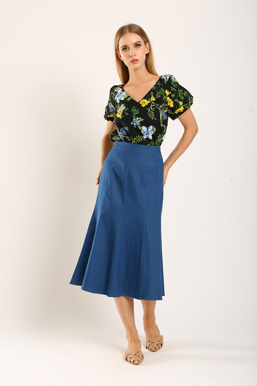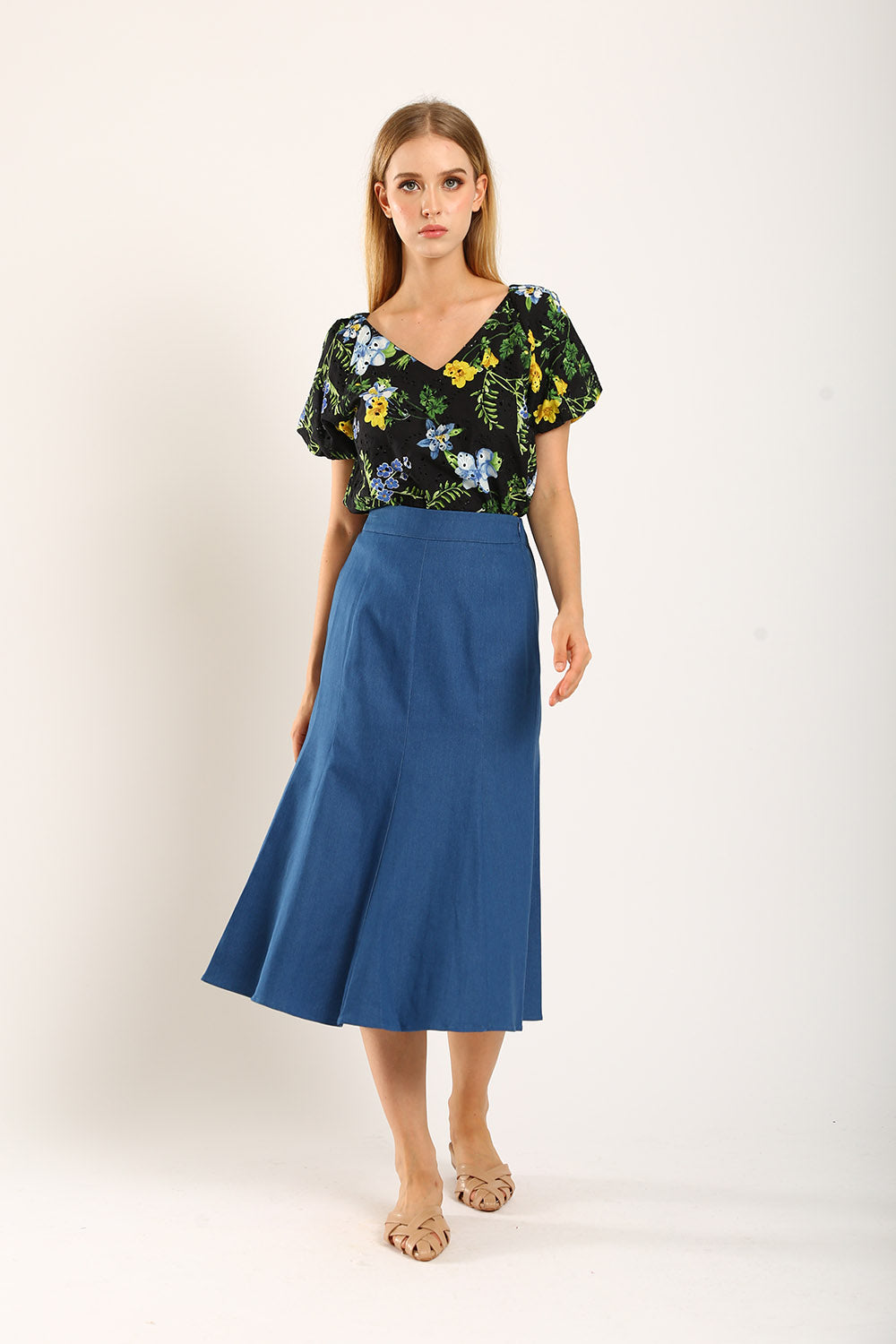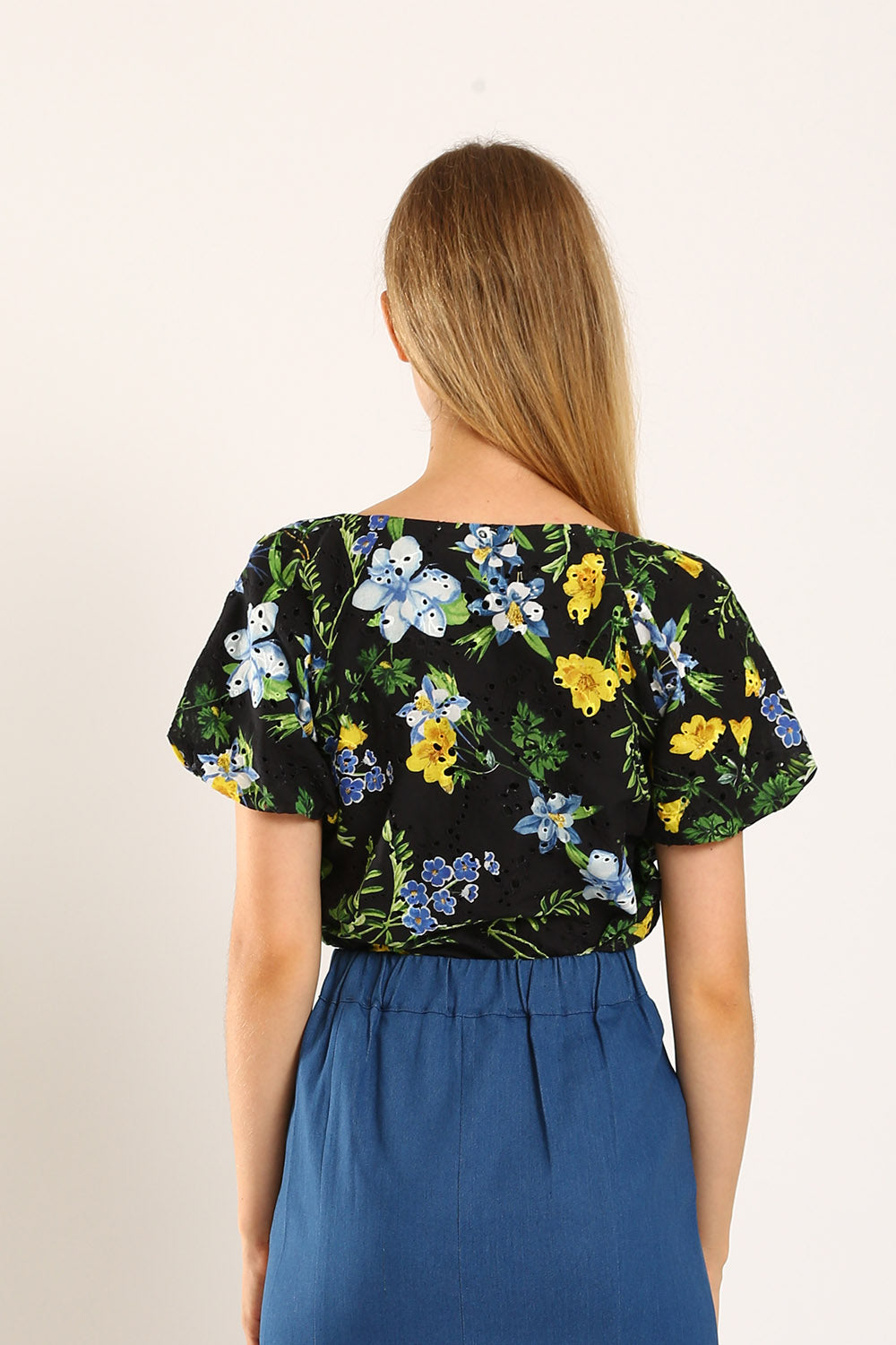 Add a pop of elegance to your wardrobe with the Merlyn Eyelet Top in Black Floral. Crafted from 100% premium cotton, this top offers a soft and breathable feel, perfect for all-day wear. Featuring an intricate eyelet design paired with vibrant floral prints, it combines texture and color effortlessly. The flattering V-neckline, relaxed fit, and airy sleeves make it a versatile choice for casual outings or festive occasions. For a polished look, pair it with the Berenice Midi Skirts in Denim, and you're ready to turn heads.