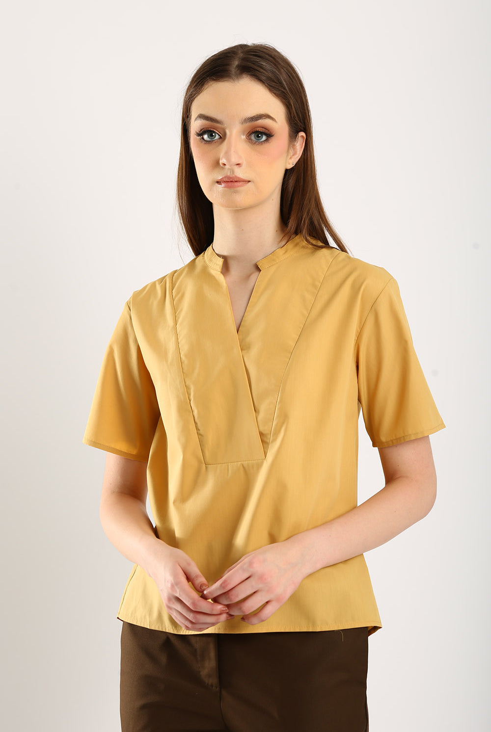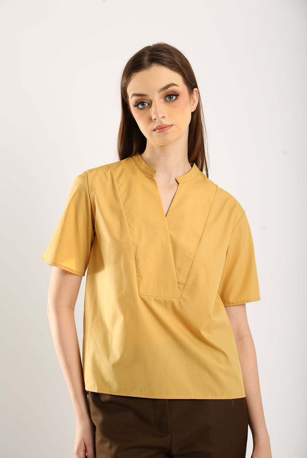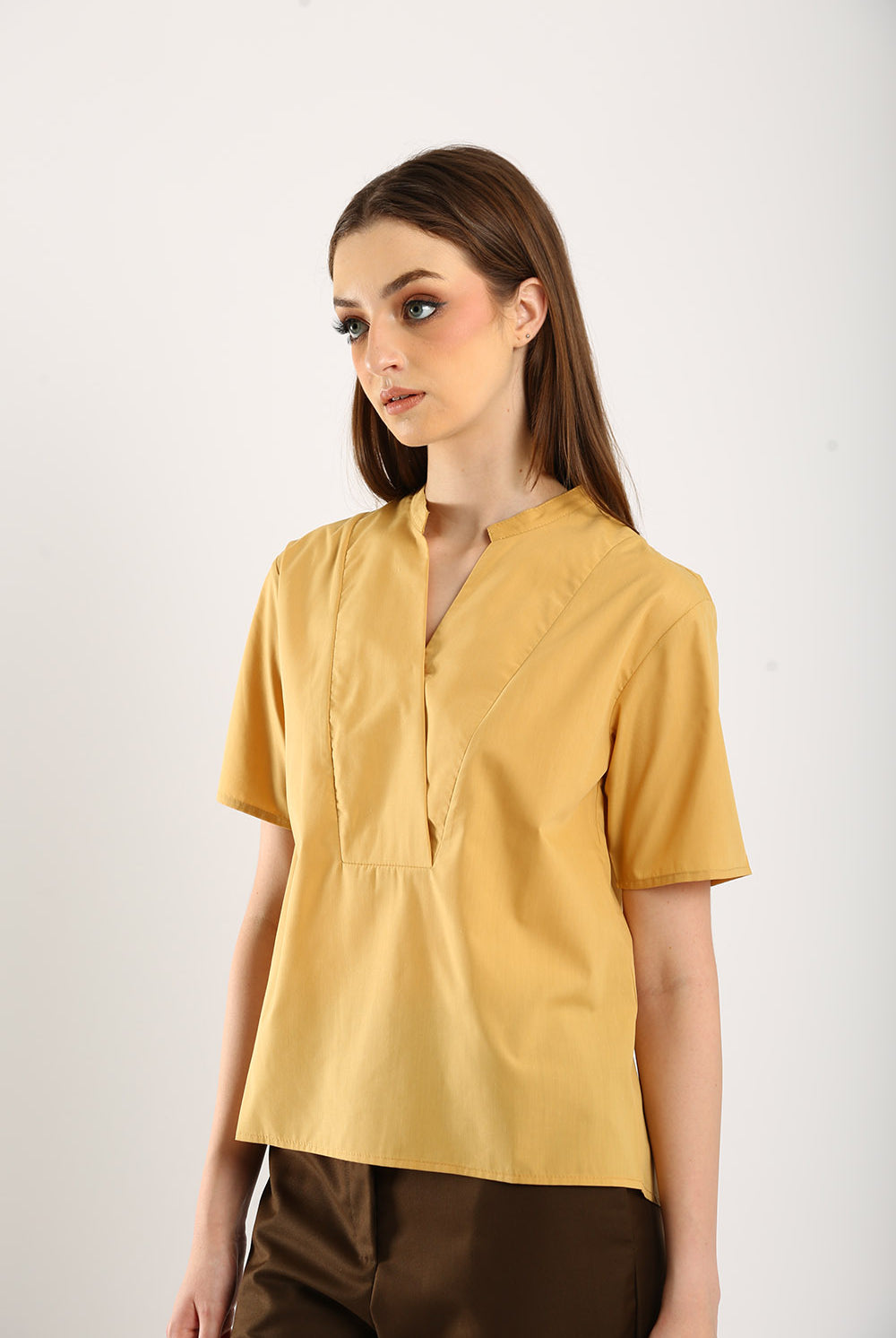 Add a touch of elegance to your everyday wardrobe with the Veera V-Neck Blouse. This versatile mustard blouse features a deep V-neckline with a structured collar, creating a chic and modern silhouette. Made from cotton blend fabric, it combines comfort and durability for a lasting addition to your collection. The relaxed fit and short sleeves make it perfect for warm weather, while the clean lines and minimalist design ensure effortless styling. Pair it with tailored pants or jeans for a refined, casual look that works from day to night.