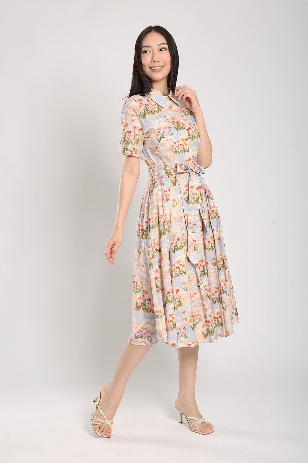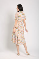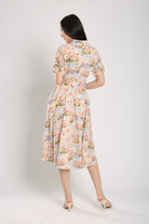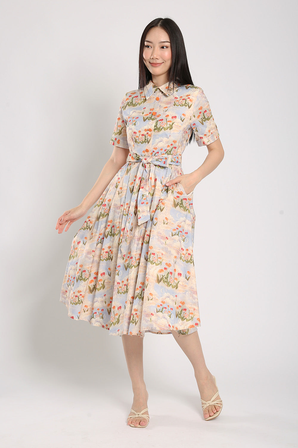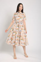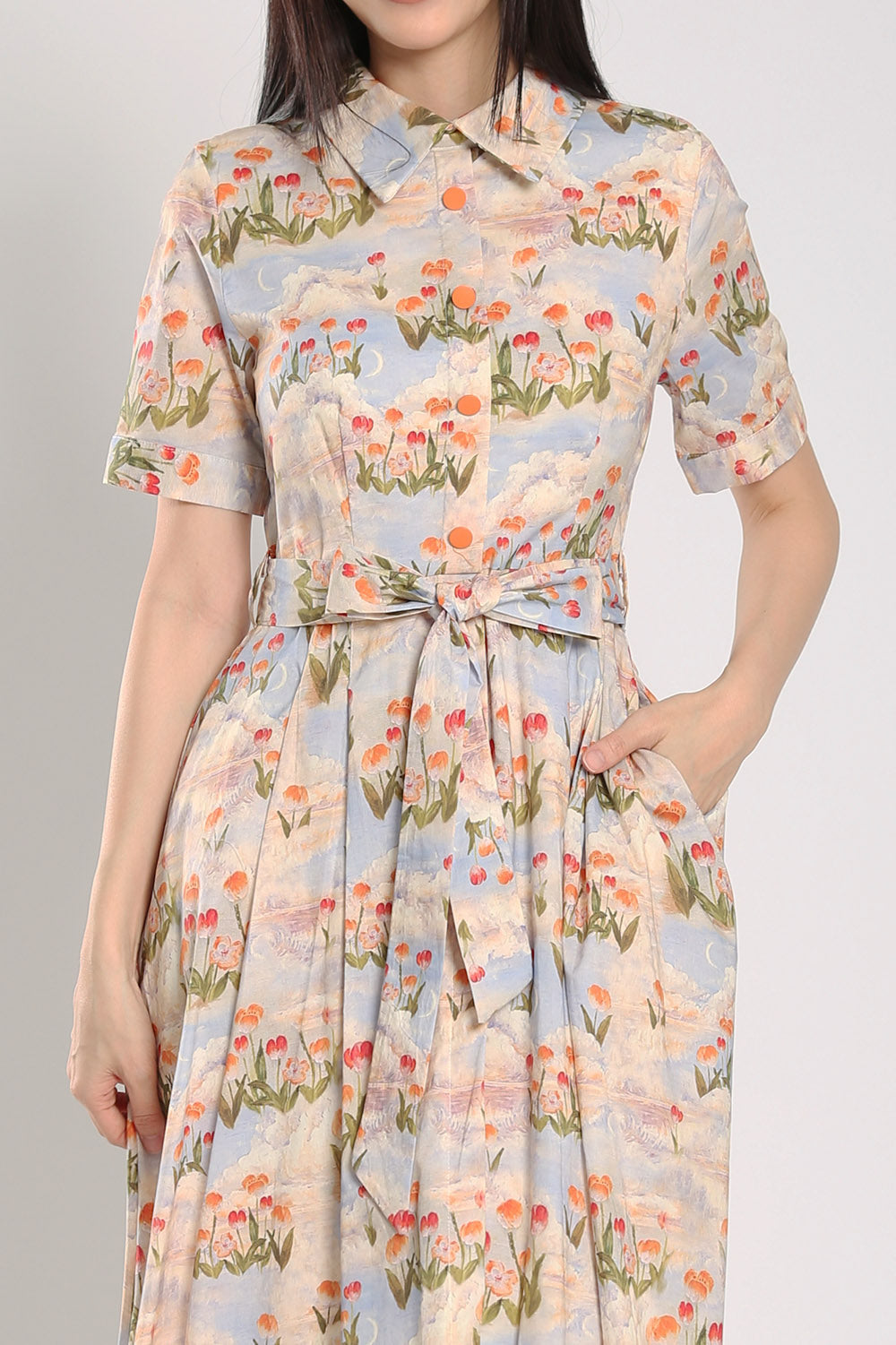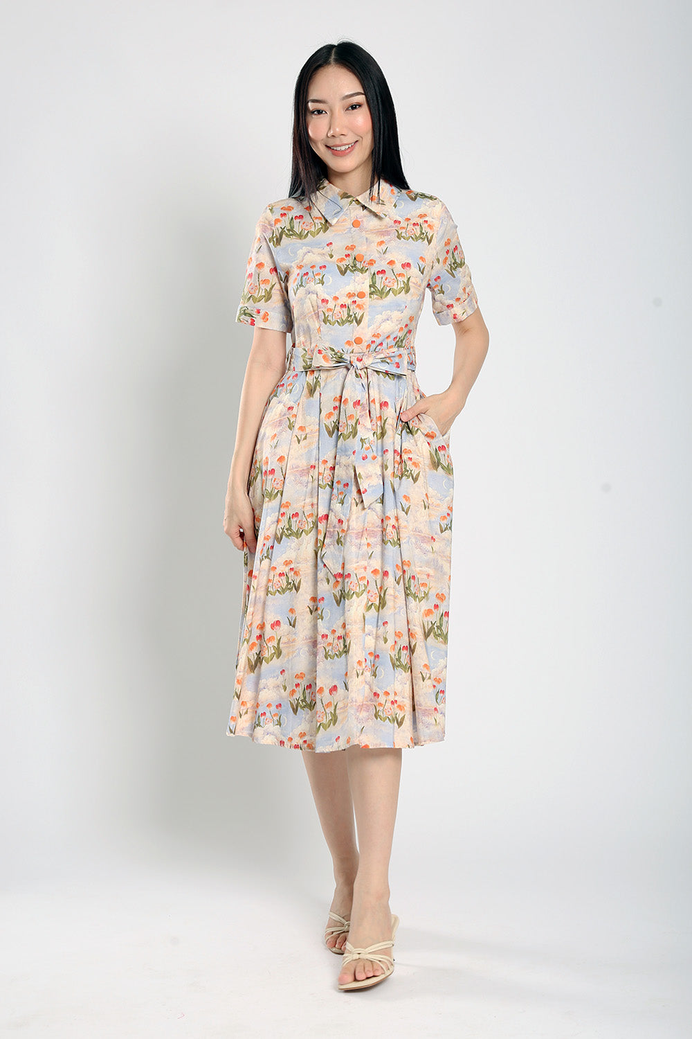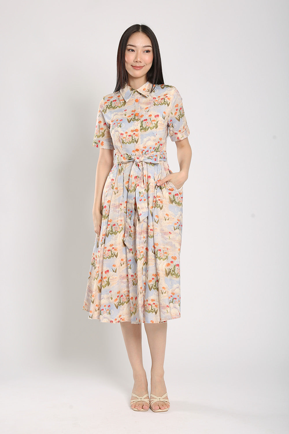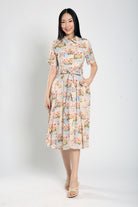 Unleash your adventurous side with the Lienne Midi Dress. The back zip closure, fully lined design, and side pockets make it the perfect piece for any daring occasion. Embellished with decorative buttons and a detachable sash, this dress is crafted with a slightly stretchable cotton blend for ultimate comfort. Please note that print placement may vary.