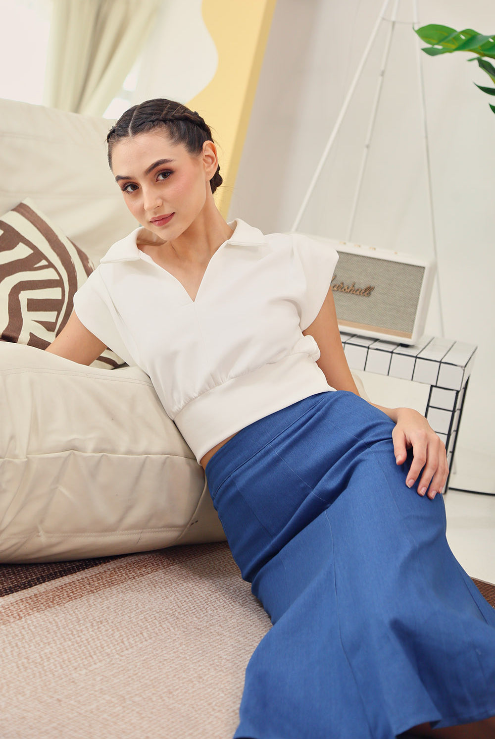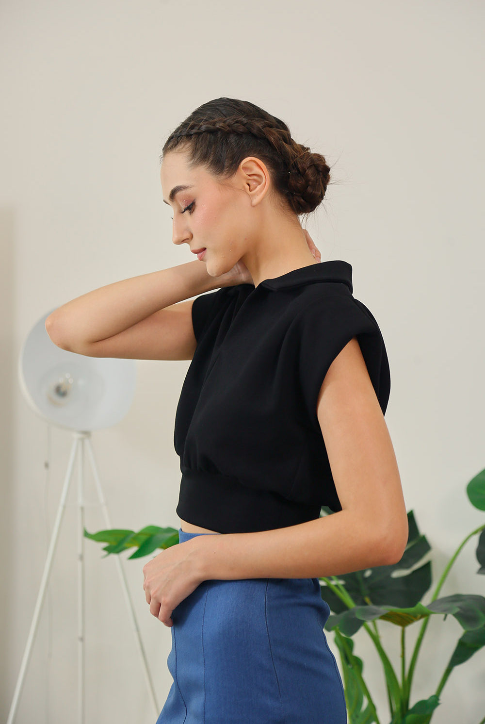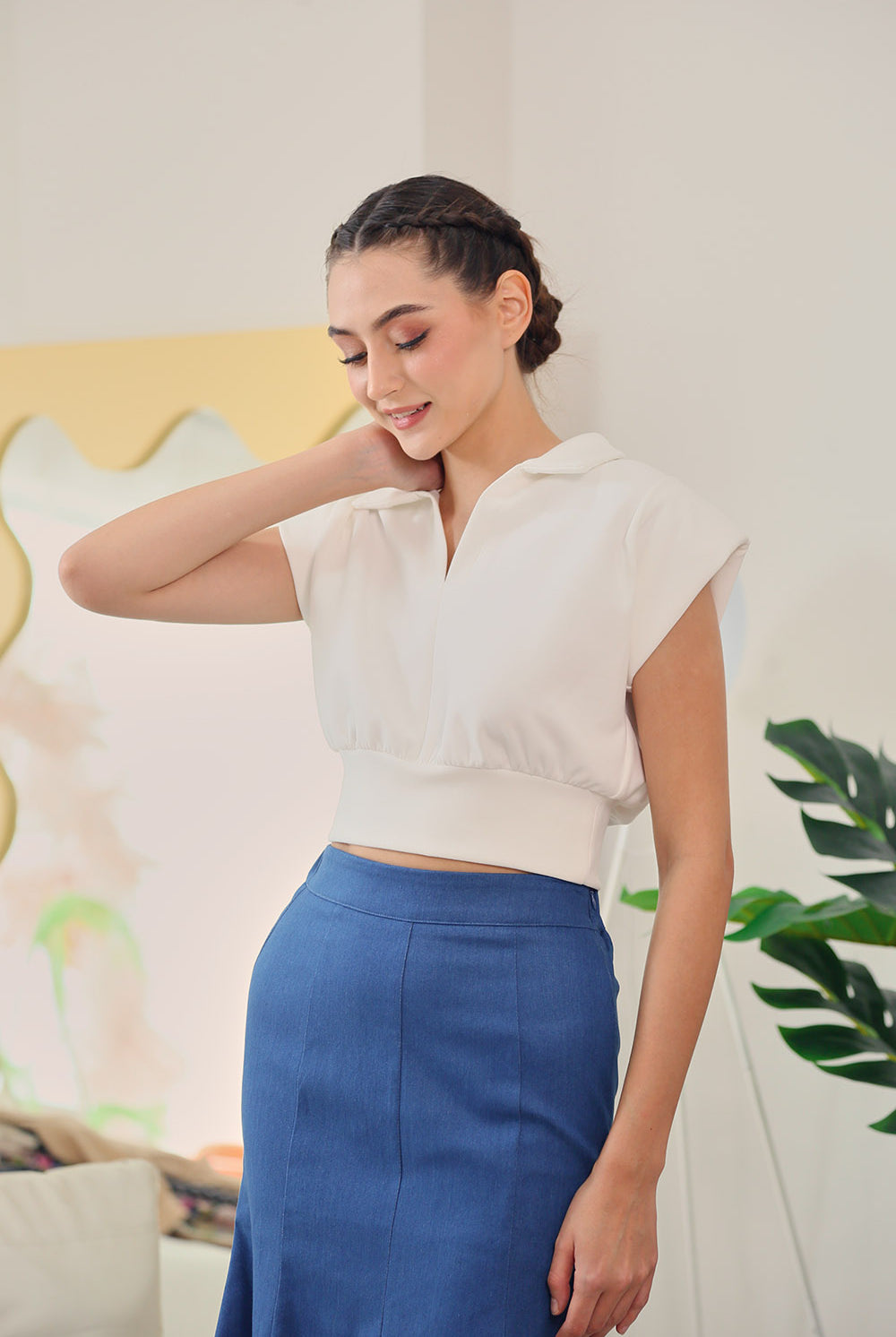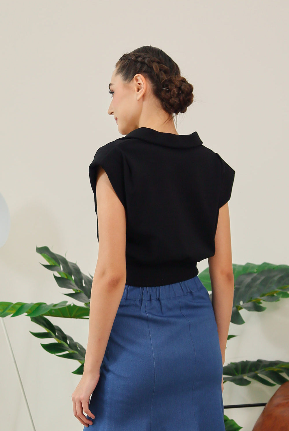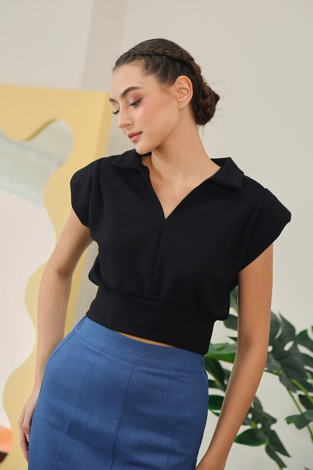 Designed with a flattering cropped length and a softly cinched waist, the Celia Top features a clean V-slit neckline, sharp polo collar, and capped sleeves for a polished finish. Pair it with our Berenice Midi Skirt in Denim for a clean, put-together look made for both weekdays and weekends.