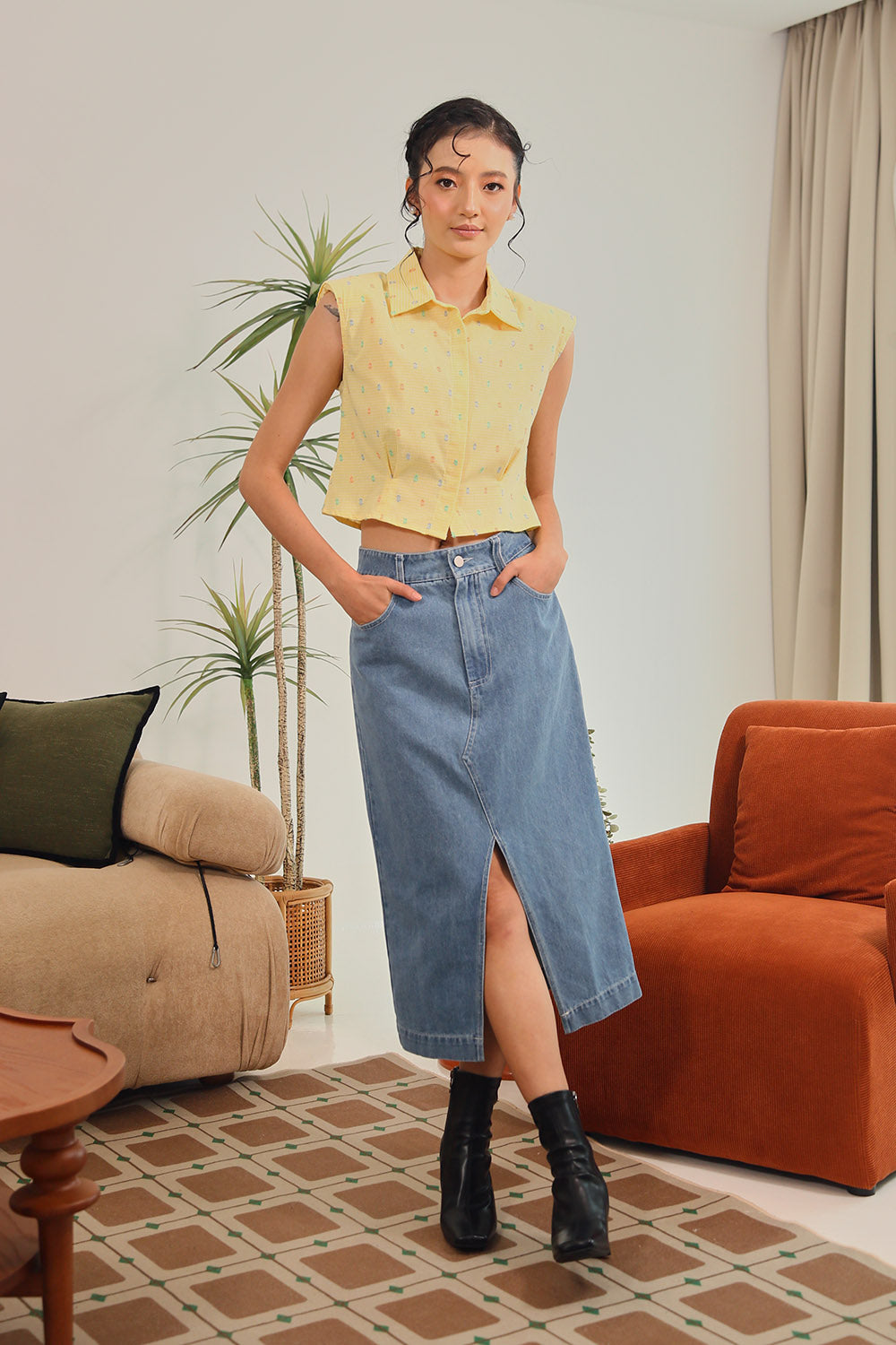 Bring playful charm to your everyday look with the Amina Sleeveless Shirt, available in cheerful Blue Gingham Pop and Yellow Gingham Pop. Crafted from lightweight gingham fabric, it features a relaxed boxy cut, classic shirt collar, and concealed button placket for a clean finish. The subtle multicolored embroidered dots add a touch of whimsy, making this piece perfect for both weekday styling and weekend ease.