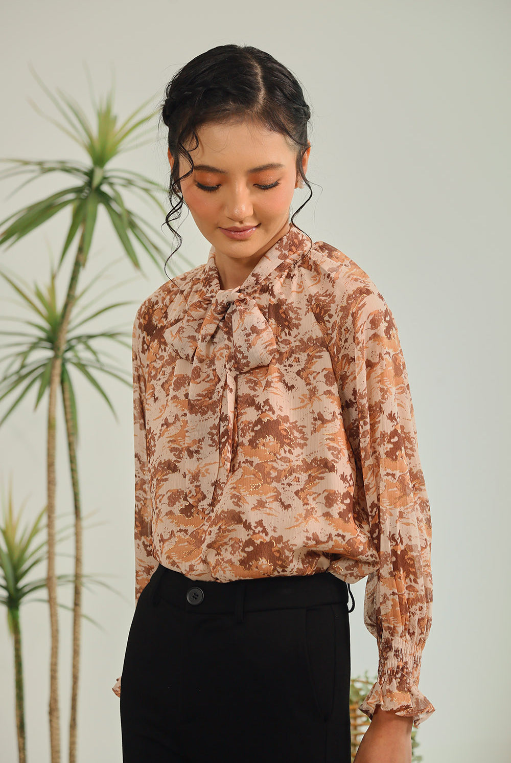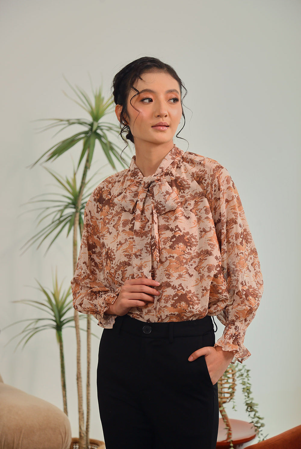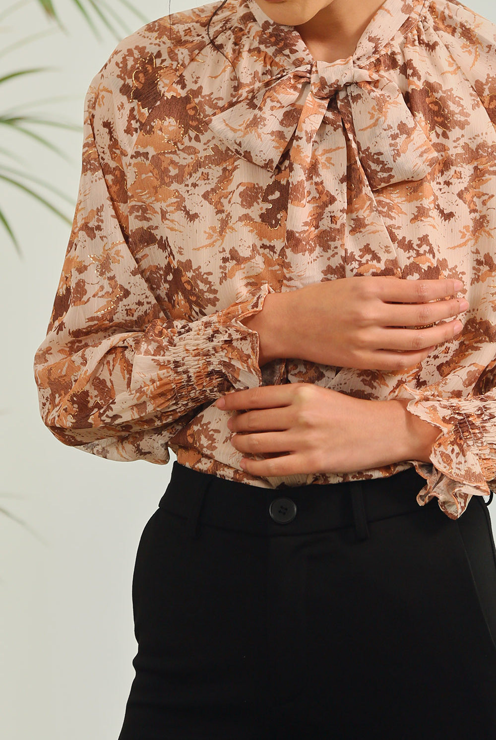 Elevate your everyday elegance with the Aureline Tie-Neck Blouse in Burnt Sienna Floral. Crafted from a lightweight sheer fabric with subtle golden accents, this blouse features long sleeves with gathered cuffs and a graceful tie-neck detail for a feminine yet polished finish. Its earthy floral tones bring warmth and sophistication, making it the perfect choice for both workdays and evenings out.