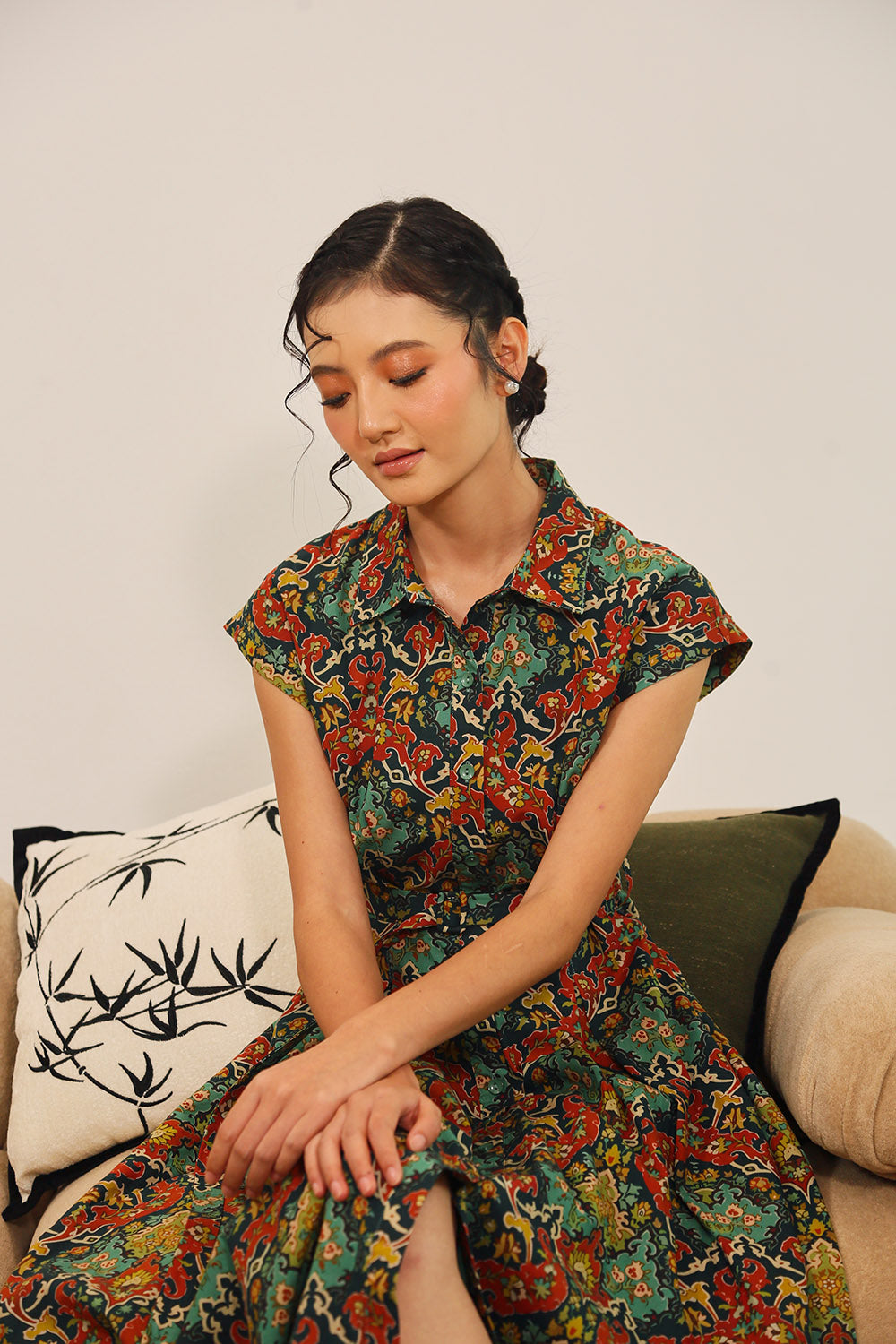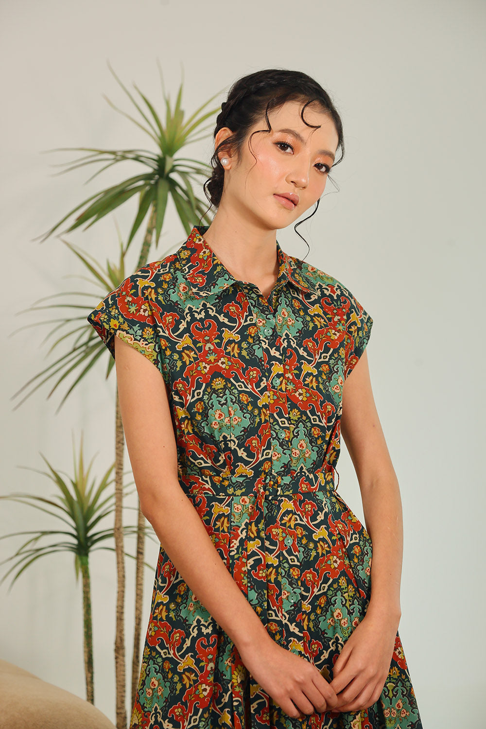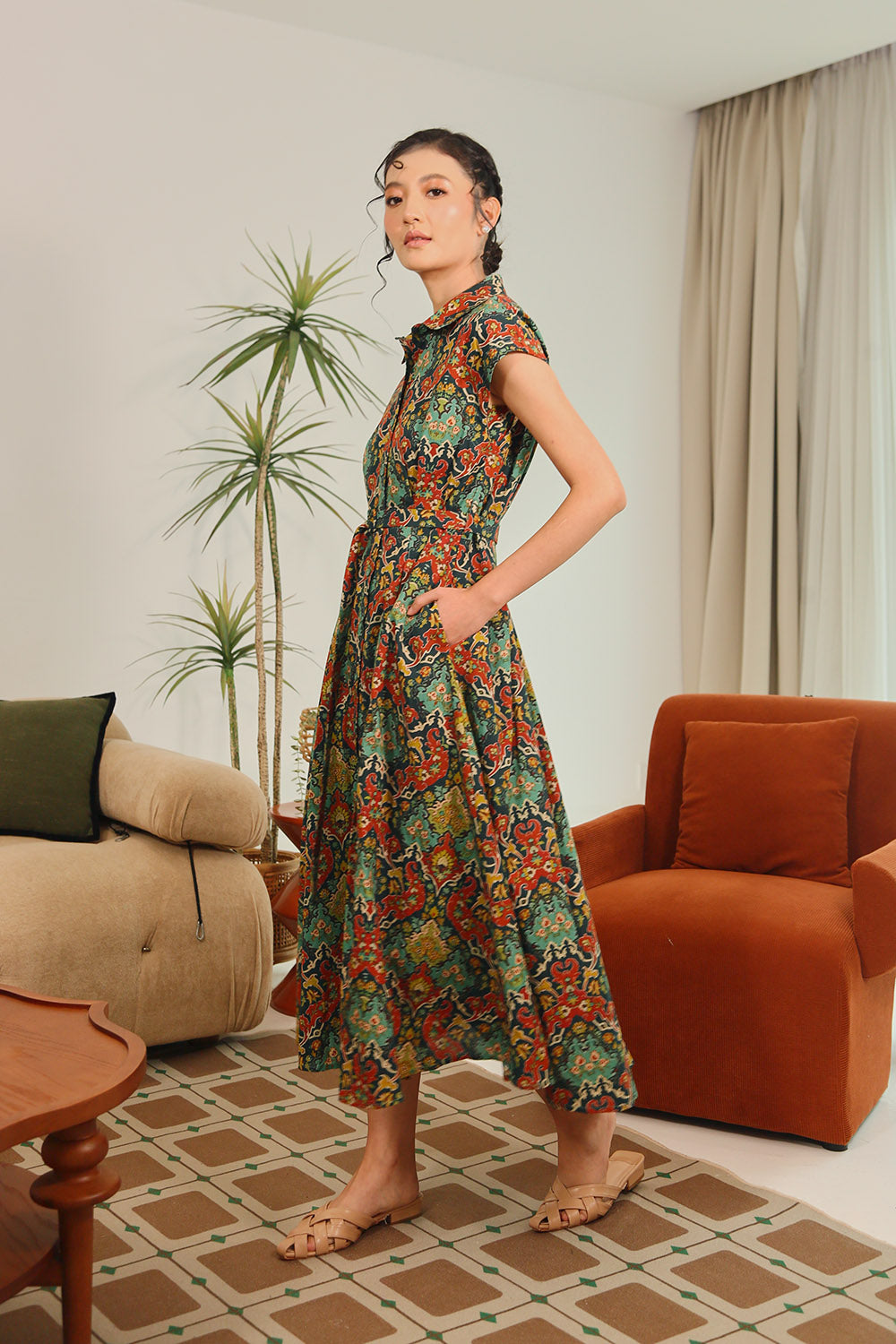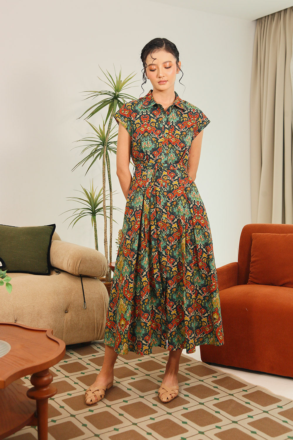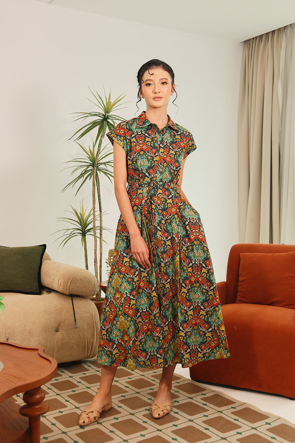 The signature Dezza Midi Dress returns in an all-new Vintage Tapestry print, blending bold heritage-inspired motifs with a modern silhouette. Crafted from breathable cotton and fully lined for comfort, this midi dress offers timeless elegance with effortless wearability. Its tailored bodice, cap sleeves, and flowing skirt create a flattering fit, while the intricate print makes it a standout piece for any occasion.
