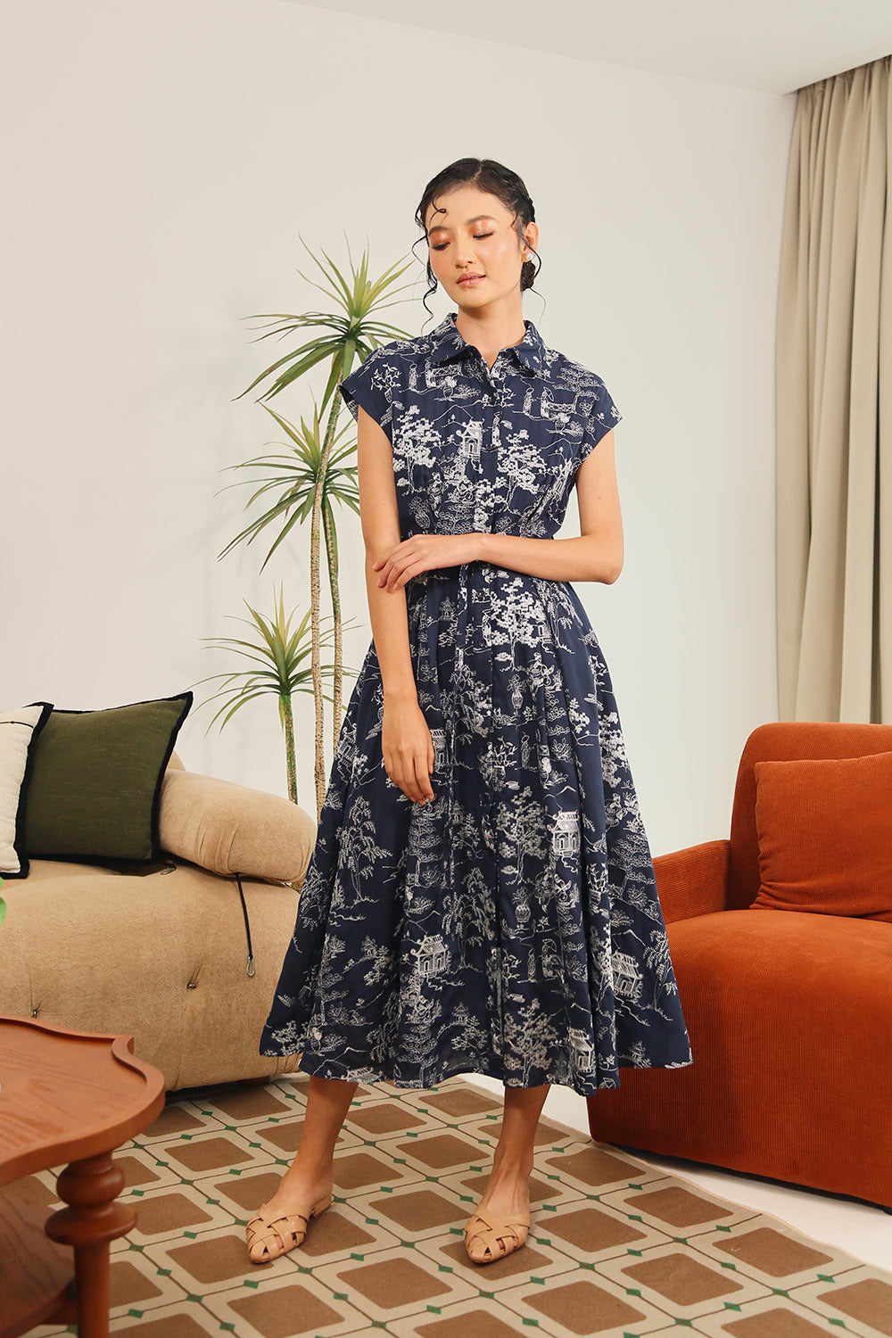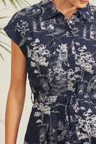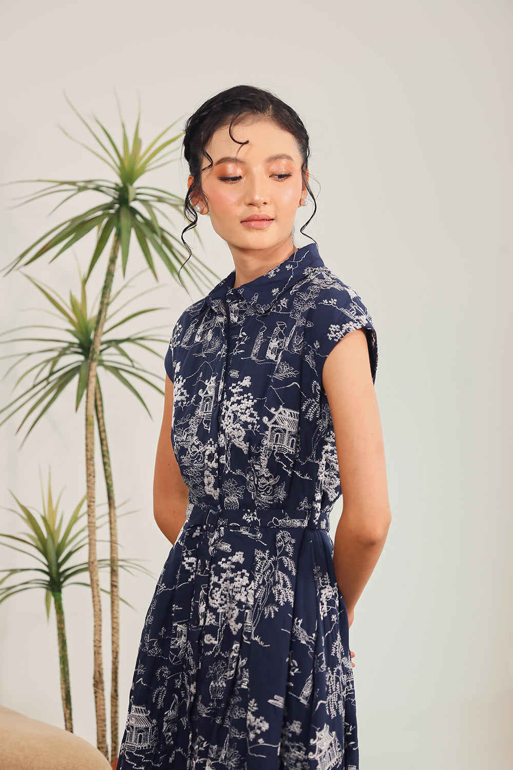 A statement piece with timeless charm, the Dezza Midi Dress is crafted in a striking scenic embroidery against a deep navy base. Cut in a flattering midi length, it features a structured collared neckline, button-down front, and a matching sash belt for a cinched silhouette.