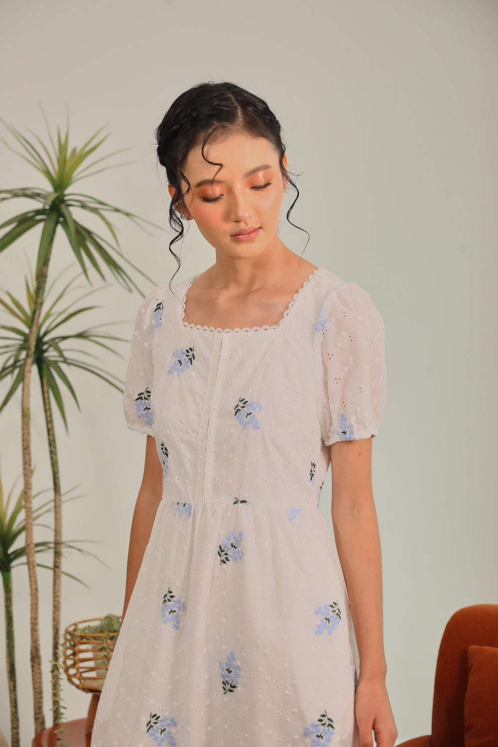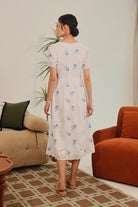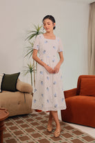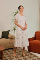 The Isolde Dress is crafted from 100% cotton, offering breathable comfort and a naturally soft touch. Adorned with delicate embroidered florals in soft blue blooms, it radiates effortless femininity and timeless elegance.